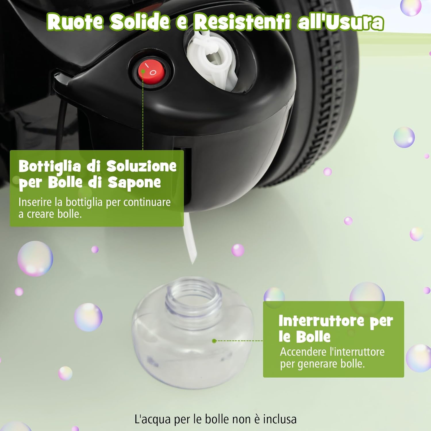 【Creatore di Bolle per un Divertimento】La nostra auto a bolle è facile da usare, basta accendere l'interruttore delle bolle per generare bolle per oltre 20 minuti e divertire i bambini durante la guida. Suggerimento amichevole: l'acqua per le bolle non è inclusa. 【Auto Multifunzionale】Il pannello di controllo di questo motore elettrico è dotato di un pulsante musicale per divertimento durante il gioco. Inoltre, l'auto a bolle è dotata di fari LED illuminati per il gioco sicuro durante la notte ed è dotata di un clacson per avvertire i pedoni. 【Facile da Usare】Goditi un'ottima esperienza di guida con un'operatività semplice. Premi semplicemente il pedale per una facile partenza e premi l'interruttore per cambiare la direzione di guida, i tuoi bambini possono iniziare un divertente momento di guida con la funzione di sterzata. 【Ruote Resistenti e Solidi】Dotata di ruote in PP altamente resistenti all'usura, questa bici elettrica per bambini è adatta a una vasta varietà di superfici stradali come pavimenti in legno, strade di mattoni, strade in cemento o strade asfaltate. 【Batteria Potente】Dotata di una batteria ricaricabile da 6V 4,5Ah per un gioco duraturo, questo motore elettrico consente 1,5 ore di tempo di gioco per ogni carica e una capacità di 30 kg dopo 8-12 ore di ricarica. Ma fai attenzione, non caricare per più di 20 ore consecutive.