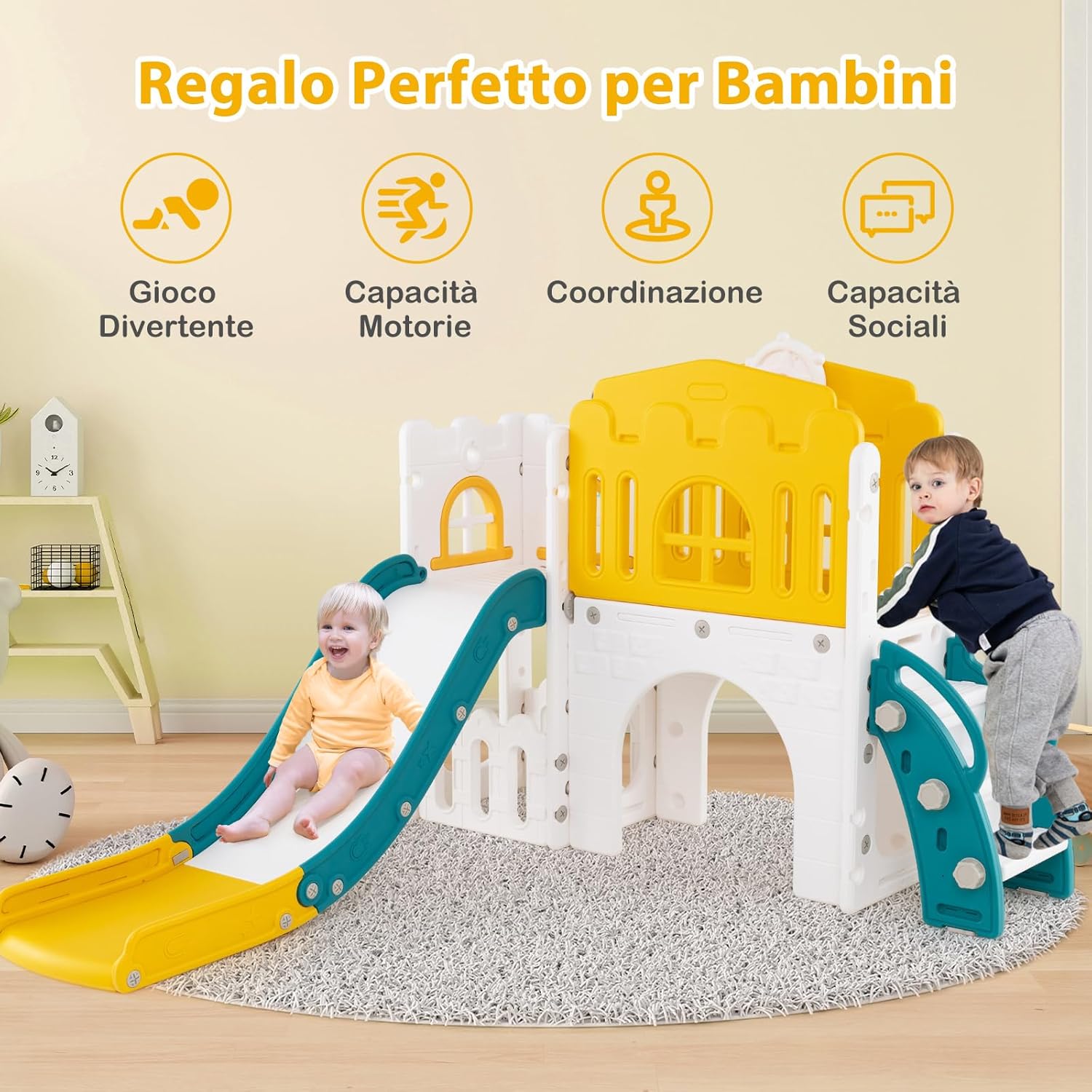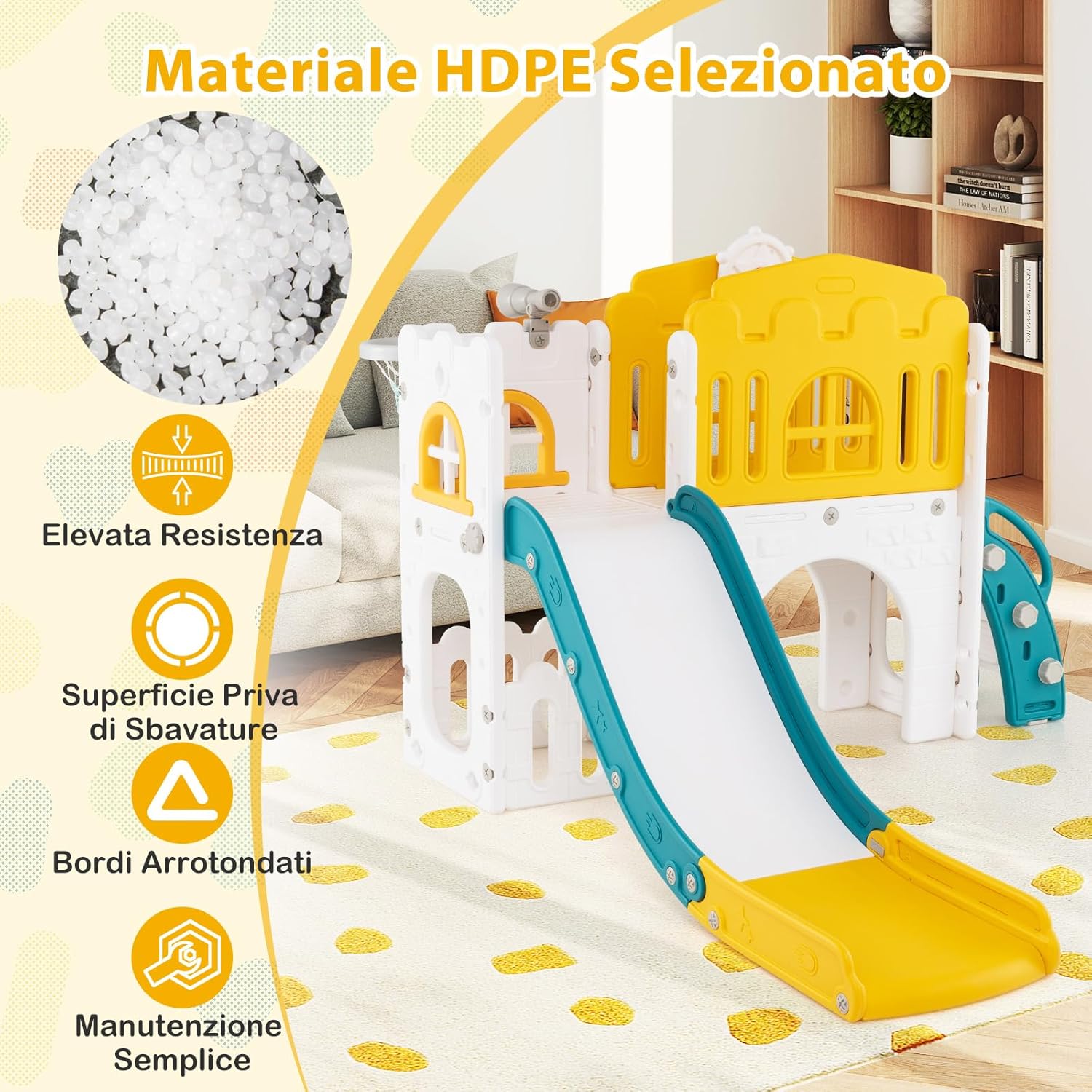【Set di Scivolo 9 in 1】Questo scivolo è progettato con un volante, telescopio, canestro da basket, finestra a oblò, corridoio, spazio di archiviazione, scivolo, tunnel per gattonare e arrampicata. Con queste 9 opzioni interattive, i bambini intraprendono avventure che stimolano l'immaginazione e il gioco fisico. 【Design Scientifico dello Scivolo】Con corrimano rialzati di 6,5cm, lo scivolo per bambini assicura un'esperienza di scivolamento fluida e senza urti. Inoltre, il lungo scivolo è studiato con 4 zone specializzate – area d'attesa, area d'accelerazione, area di decelerazione e area di ammortizzazione per un maggiore controllo e sicurezza. 【Sicurezza Avanzata】Questo set da arrampicata per bambini dispone di una scala chiusa con corrimano laterali e gradini antiscivolo, permettendo ai bambini di arrampicarsi con sicurezza. Con una superficie senza bave e bordi arrotondati, il set di scivoli per bambini crea un ambiente sicuro per i più piccoli da esplorare. 【Materiale Adatto ai Bambini】Progettato per resistere al tempo, questo scivolo per bambini è realizzato con materiale HDPE di alta qualità che garantisce alta resistenza e manutenzione semplice. Il set di scivoli autonomo garantisce una maggiore affidabilità, portando tranquillità ai genitori. 【Imparare Giocando】Lo scivolo 9 in 1 per bambini incoraggia una varietà di attività di sviluppo delle competenze. Quando i bimbi sono impegnati nel divertimento, possono migliorare la coordinazione mano-occhio, la forza muscolare, l'interazione sociale, ecc. Con il basket incluso e l'inflatore per un divertimento immediato.