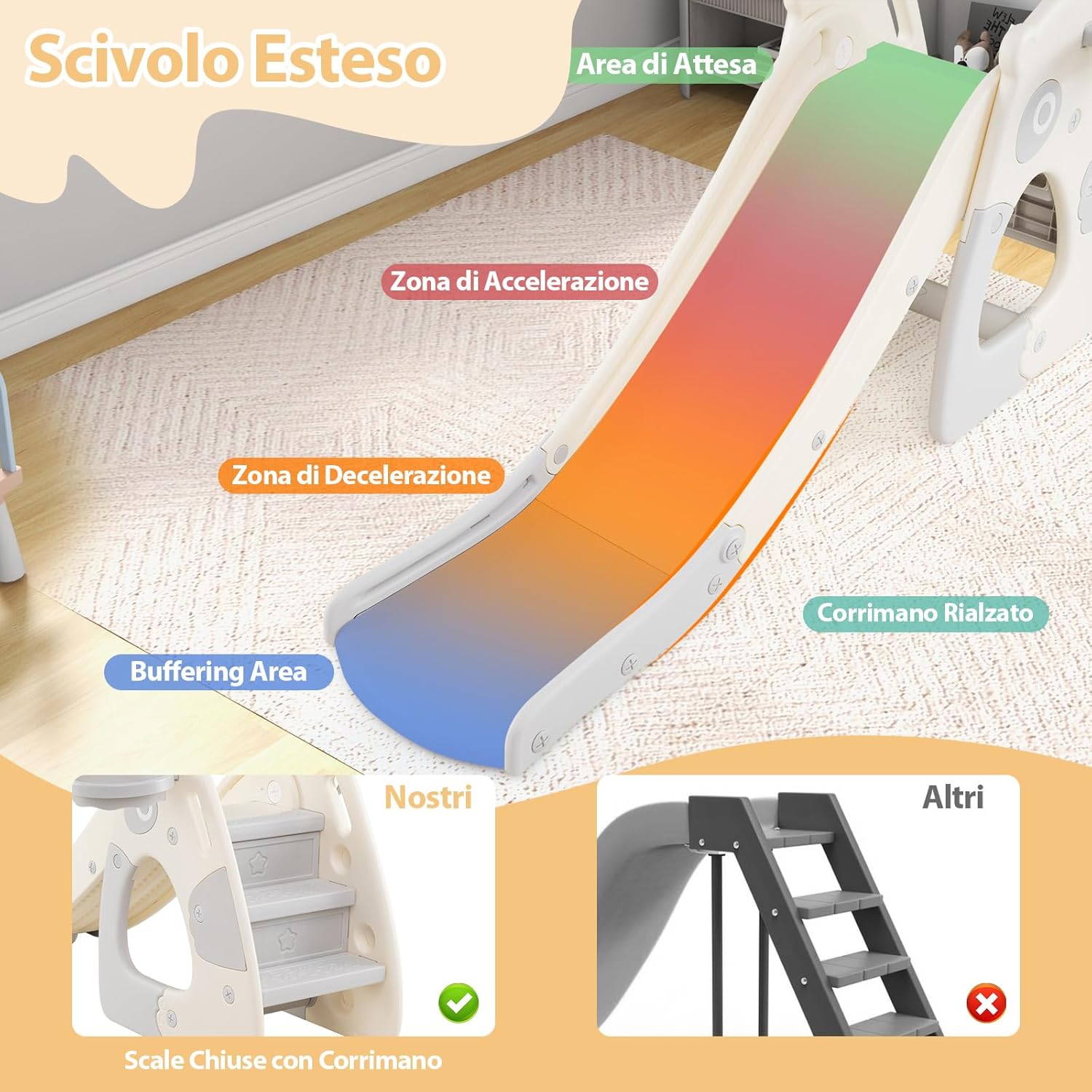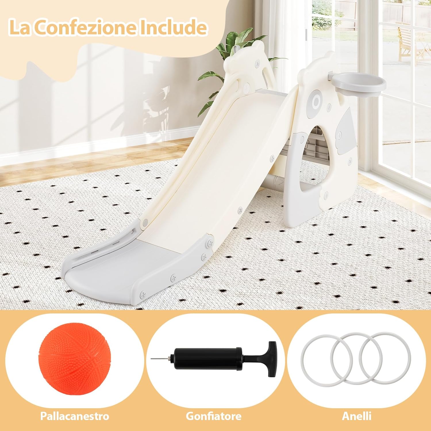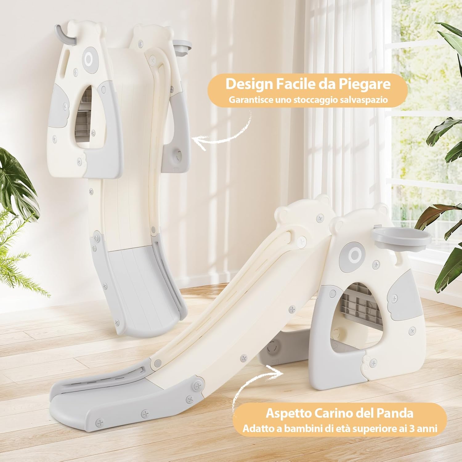 【Set da Gioco 4 in 1】Questo scivolo per bambini integra perfettamente giochi di scivolamento, arrampicata, tiro e lancio dell'anello, aiutando i bambini a sviluppare abilità motorie essenziali. Con il pallone da basket incluso, il gonfiatore e gli anelli, il tuo bambino può divertirsi un mondo con moltissimi giochi. 【Costruzione Sicura e Stabile】Realizzato con materiale HDPE di alta qualità e con bordi arrotondati per un gioco più sicuro, questo scivolo per bambini è solidificato da strutture a triplo triangolo assicurando una capacità di peso di 70 kg. La stabilità è ulteriormente migliorata con dispositivi anti-ribaltamento e piedini antiscivolo. 【Caratteristiche di Sicurezza Potenziate】Lo scivolo esteso è dotato di corrimano rialzati, creando un'esperienza di scivolamento sicura con zone di sicurezza ben distinte: un'area di attesa, una zona di accelerazione, una zona di decelerazione e un'area di ammortizzamento. 【Regalo Perfetto】Ideale per bambini dai 3 anni in su, questo scivolo autoportante è una grande aggiunta alla loro area giochi. Che sia posizionato nei salotti, in camerette dei giochi o nei giardini, il suo adorabile design panda cattura l'attenzione dei bambini e si integra bene con gli altri mobili. 【Conservazione Semplici】Progettato con convenienza in mente, questo scivolo per bambini pieghevole può essere facilmente riposto quando non in uso, offrendo una soluzione salva-spazio per la tua casa. Inoltre, è facile da assemblare, senza bisogno di strumenti aggiuntivi, permettendo al tuo bambino di iniziare a giocare subito.