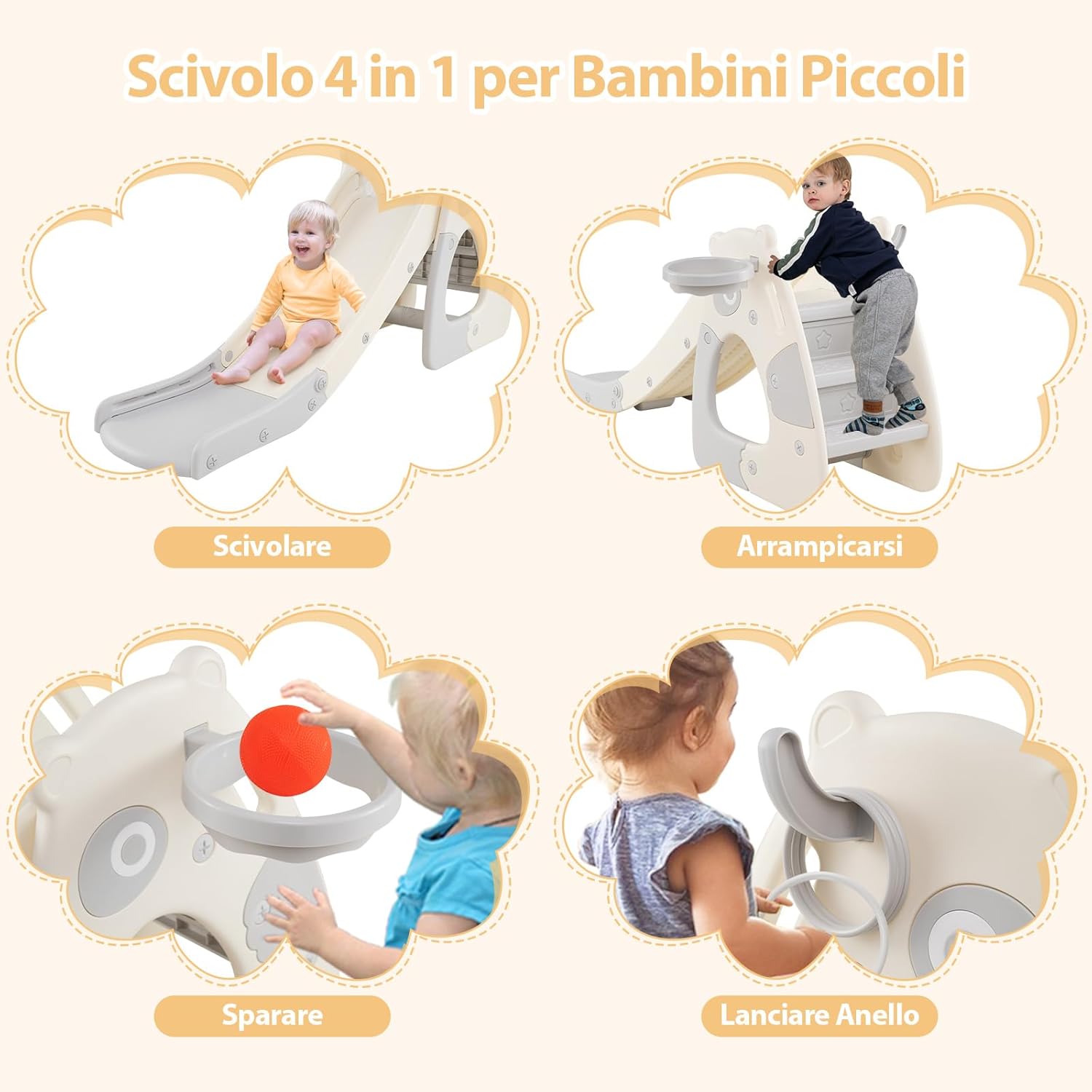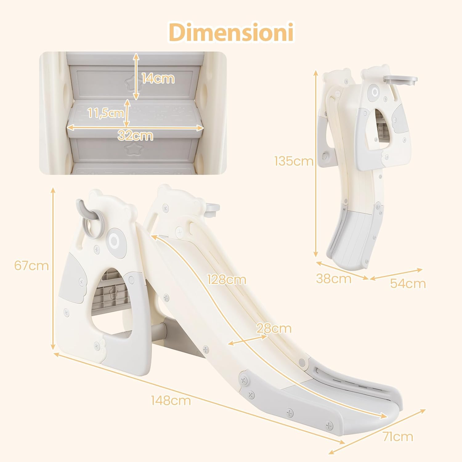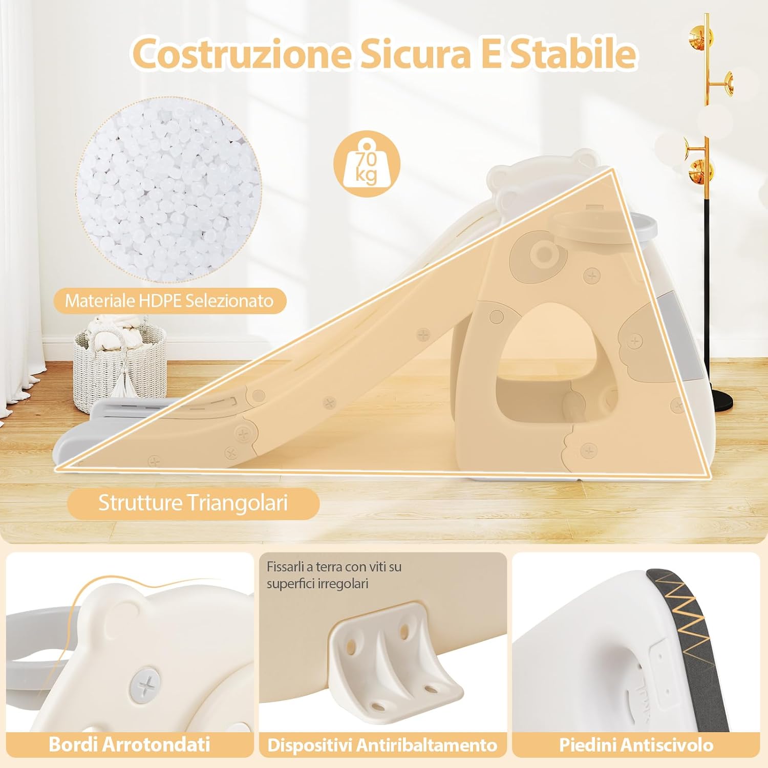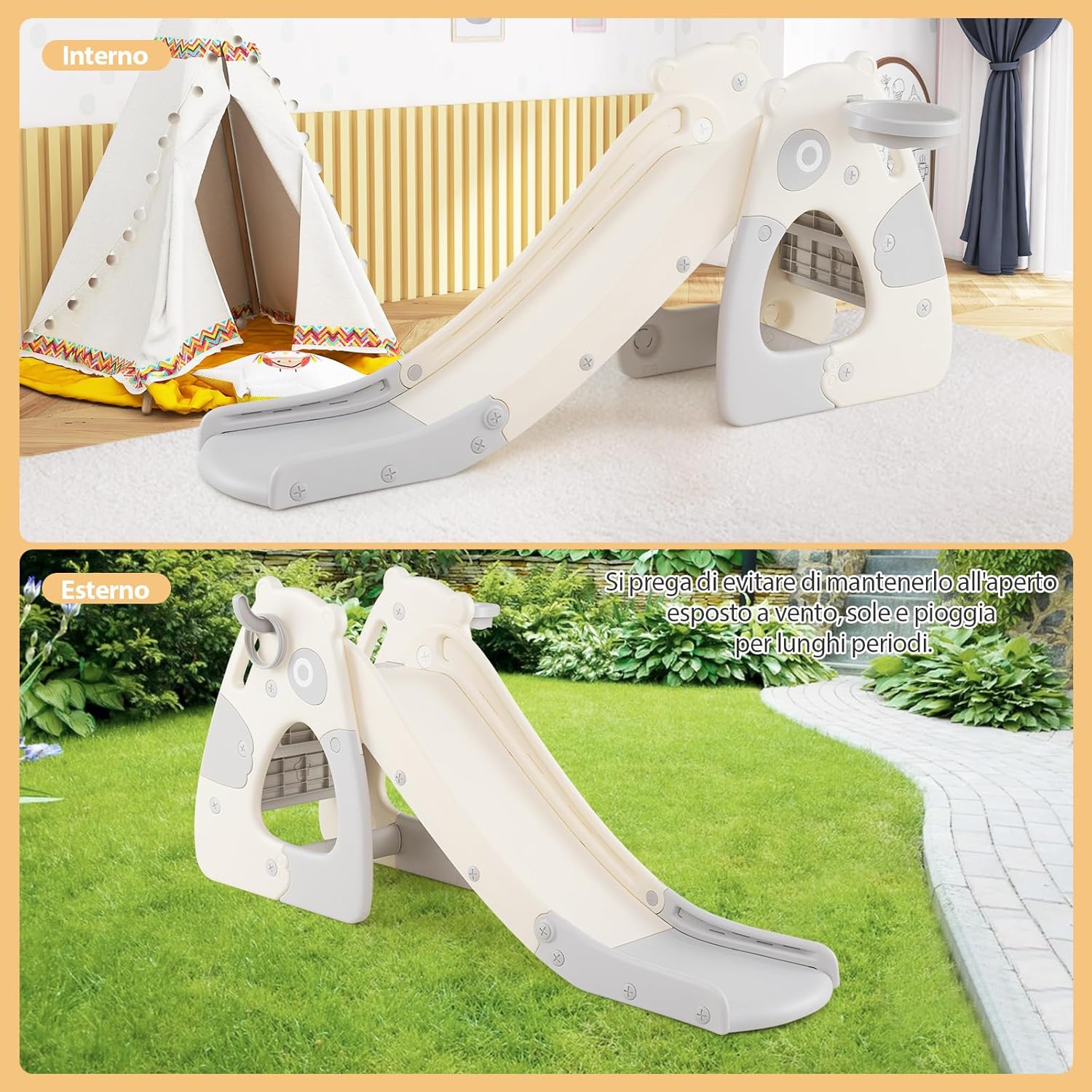 【Set da Gioco 4 in 1】Questo scivolo per bambini integra perfettamente giochi di scivolamento, arrampicata, tiro e lancio dell'anello, aiutando i bambini a sviluppare abilità motorie essenziali. Con il pallone da basket incluso, il gonfiatore e gli anelli, il tuo bambino può divertirsi un mondo con moltissimi giochi. 【Costruzione Sicura e Stabile】Realizzato con materiale HDPE di alta qualità e con bordi arrotondati per un gioco più sicuro, questo scivolo per bambini è solidificato da strutture a triplo triangolo assicurando una capacità di peso di 70 kg. La stabilità è ulteriormente migliorata con dispositivi anti-ribaltamento e piedini antiscivolo. 【Caratteristiche di Sicurezza Potenziate】Lo scivolo esteso è dotato di corrimano rialzati, creando un'esperienza di scivolamento sicura con zone di sicurezza ben distinte: un'area di attesa, una zona di accelerazione, una zona di decelerazione e un'area di ammortizzamento. 【Regalo Perfetto】Ideale per bambini dai 3 anni in su, questo scivolo autoportante è una grande aggiunta alla loro area giochi. Che sia posizionato nei salotti, in camerette dei giochi o nei giardini, il suo adorabile design panda cattura l'attenzione dei bambini e si integra bene con gli altri mobili. 【Conservazione Semplici】Progettato con convenienza in mente, questo scivolo per bambini pieghevole può essere facilmente riposto quando non in uso, offrendo una soluzione salva-spazio per la tua casa. Inoltre, è facile da assemblare, senza bisogno di strumenti aggiuntivi, permettendo al tuo bambino di iniziare a giocare subito.