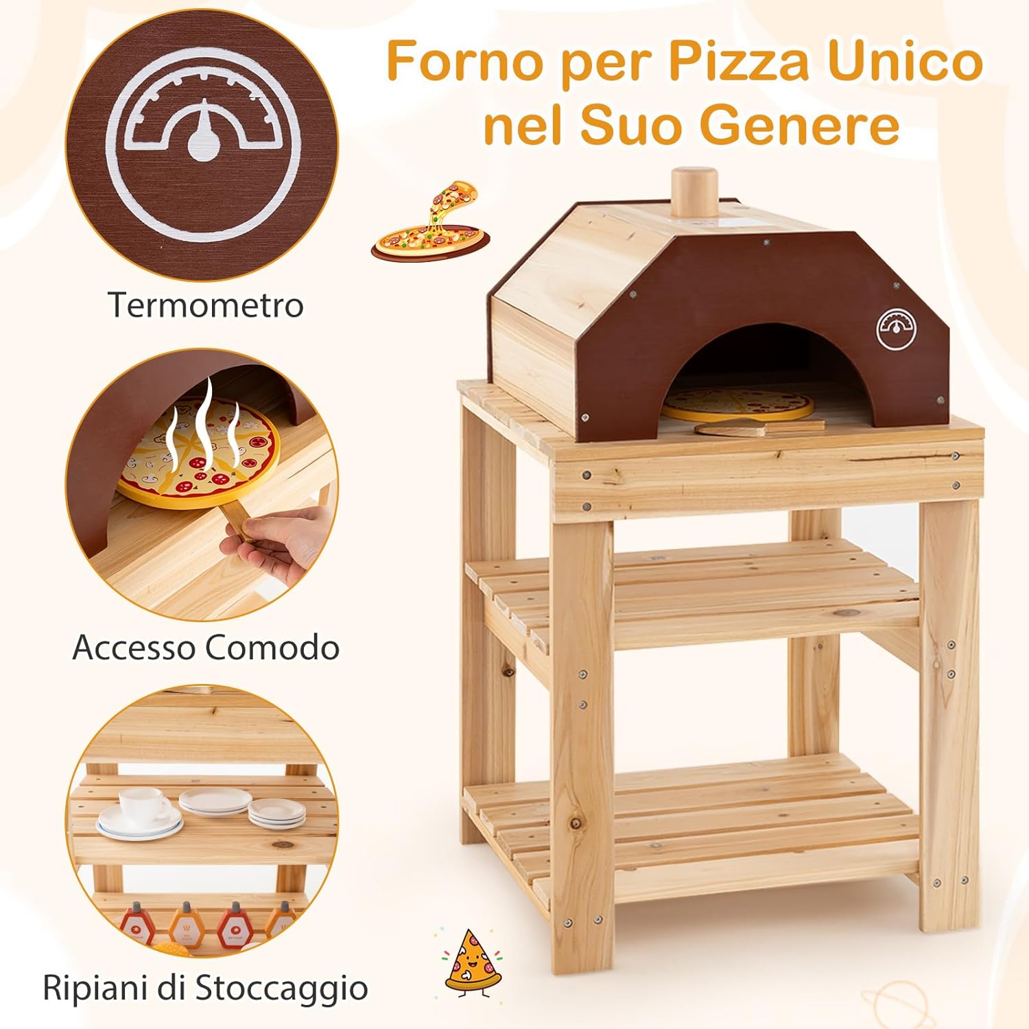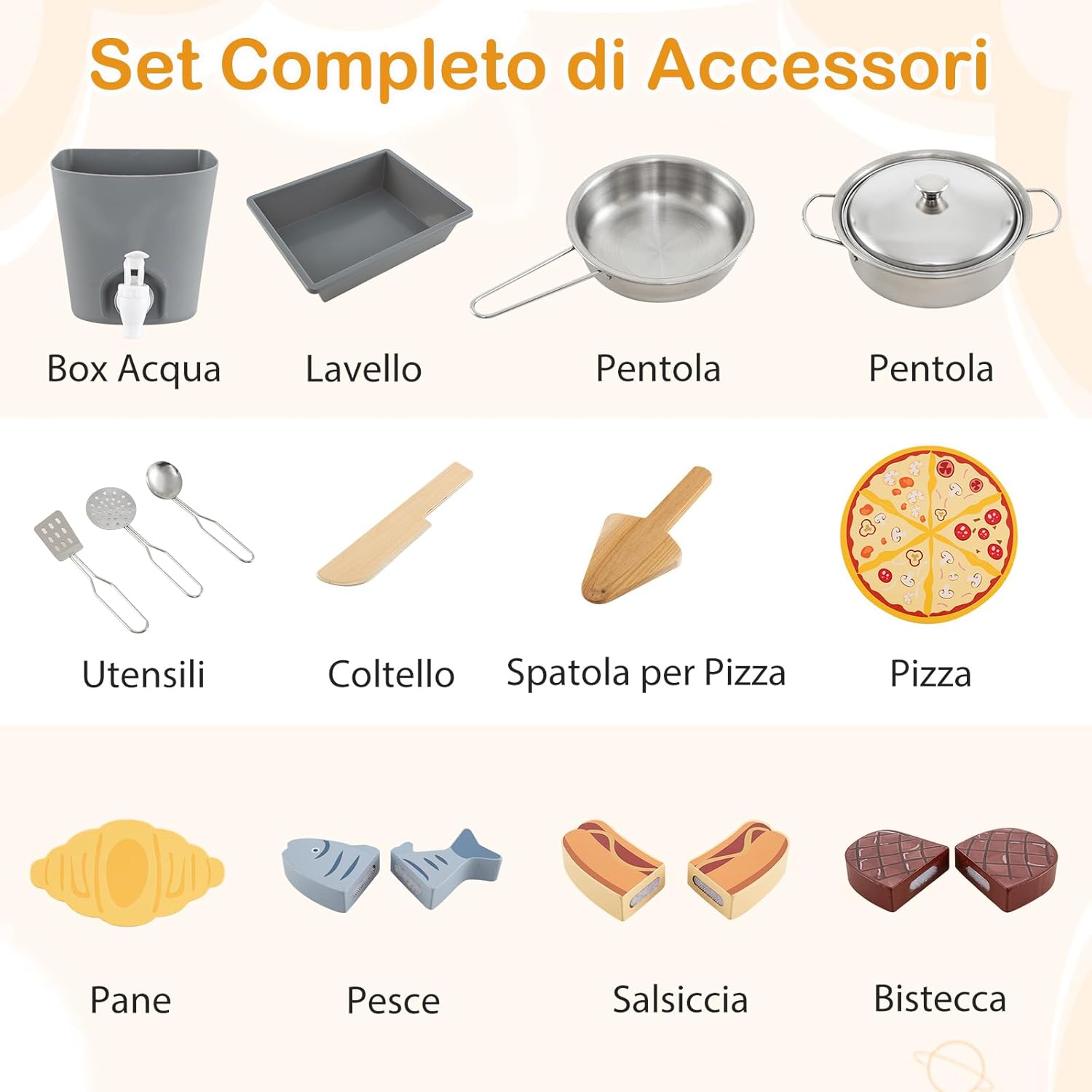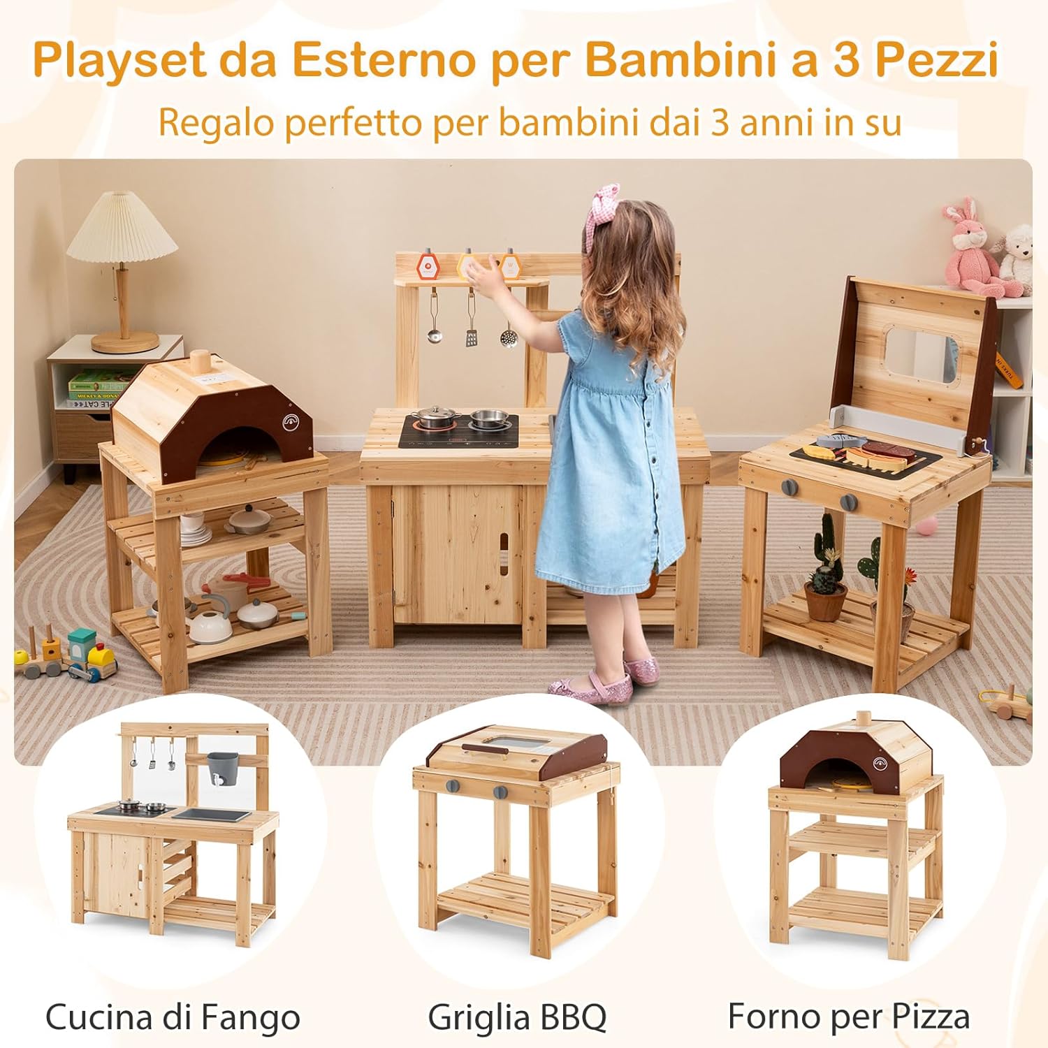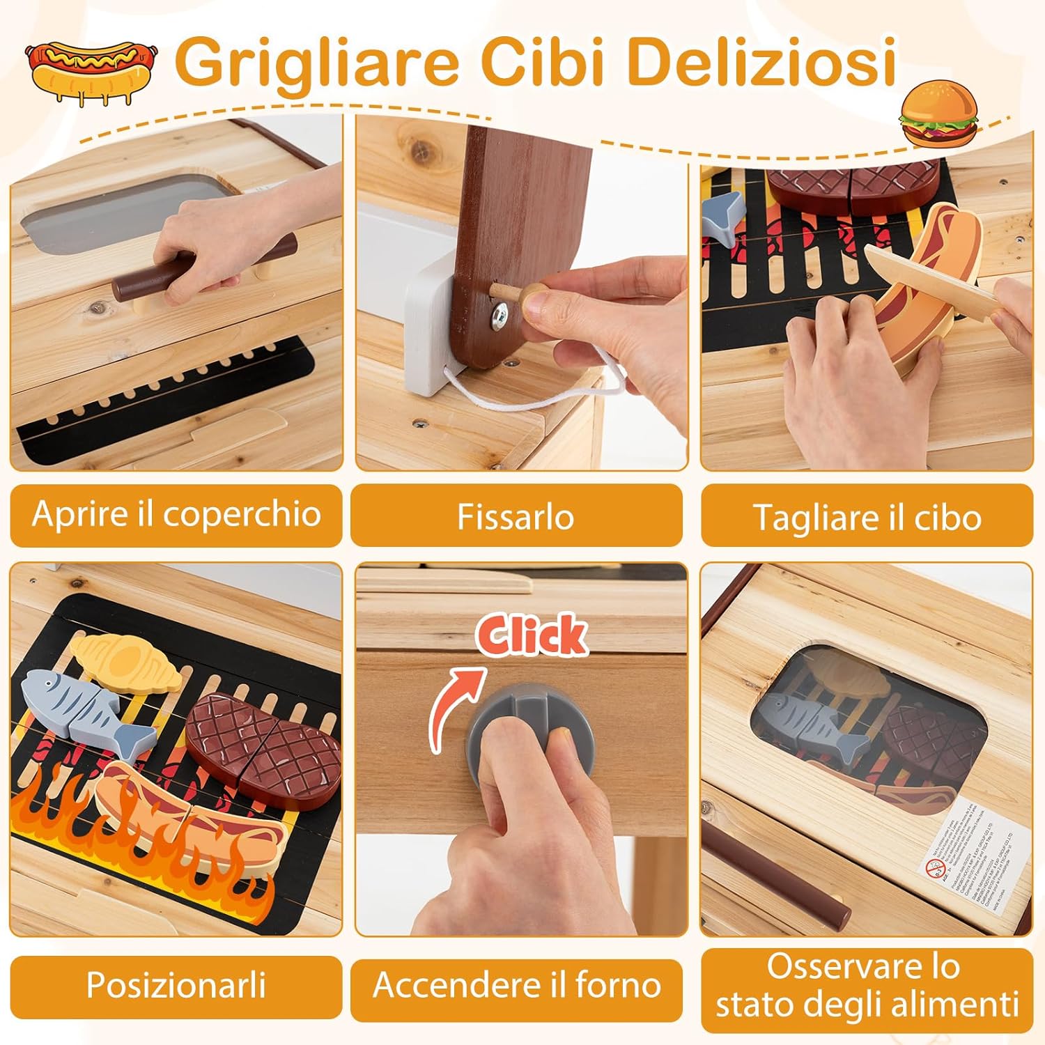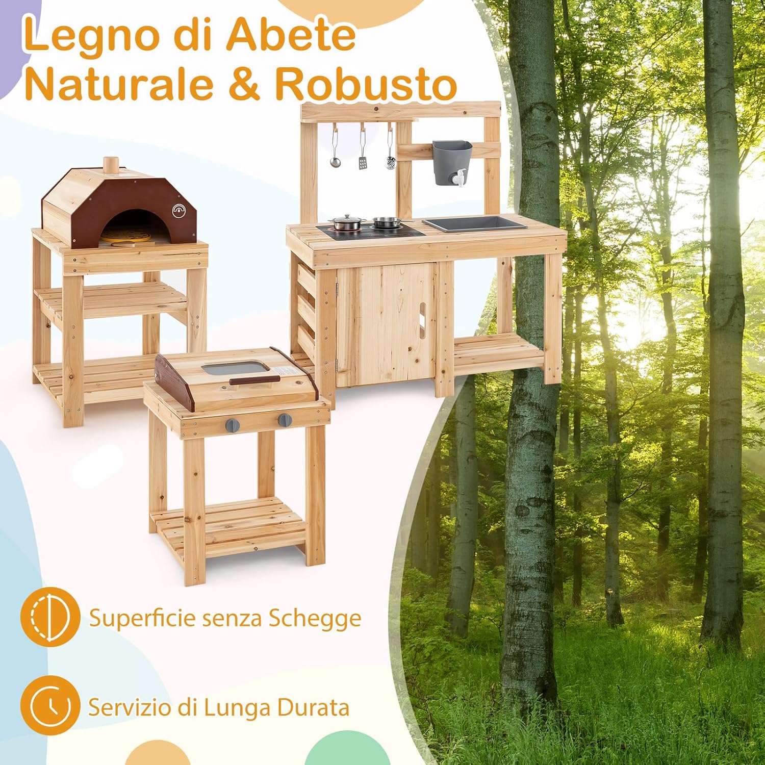 【Divertiti a Cucinare】La cucina in legno presenta 2 fornelli, un box dell’acqua con un vero rubinetto, lavandino e forno, immergendo i bambini nel mondo dell'arte culinaria. Fingendo di cucinare, i bambini possono seguire queste fasi: lavare i piatti, prendere gli utensili, friggere i piatti e preparare i dolci. 【Eccitante Avventura alla Griglia】È il momento per i piccoli maestri della griglia di aprire il coperchio della griglia BBQ, sistemare il cibo, accendere il fuoco per grigliare vari alimenti. I pomelli rotanti emettono un suono “clic”, mentre la finestra di osservazione consente ai bambini di osservare lo stato del cibo. 【Design Innovativo del Forno per Pizza】Il forno per pizza in legno vanta un termometro simulato, accesso comodo e ripiani per la conservazione, che lo rendono divertente per i piccoli chef fare le pizze. Il forno per pizza offre ai bambini ore interminabili di gioco entusiasta ed educativo, sviluppando abilità essenziali per la vita. 【Legno di Abete Naturale e Robusto】Realizzato in solido legno di abete, questo set da cucina da giardino 3 pezzi ha una superficie priva di schegge per un utilizzo sicuro. La finitura naturale si fonde splendidamente nell'area di gioco all'aperto, garantendo che resista alla prova del tempo. Il set da cucina in legno è una scelta affidabile per i bambini. 【Set da Gioco 3 Pezzi per Bambini】Questo set di gioco da chef include una cucina in legno, una griglia BBQ e un forno per pizza, insieme a accessori come una padella, una pentola, utensili, coltello, spatola per pizza, pizza, pane, pesce, salsiccia e bistecca. Perfetto come regalo per bambini dai 3 anni in su, il set da gioco all’aperto coinvolge i bambini in un gioco creativo.