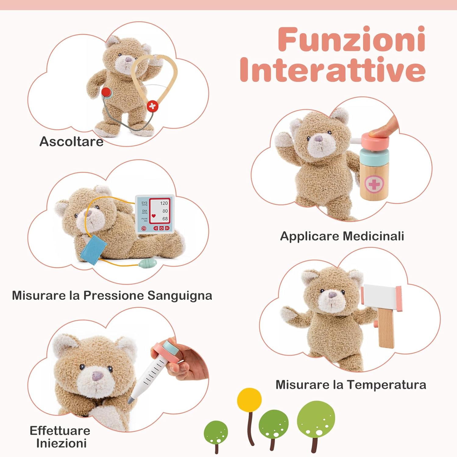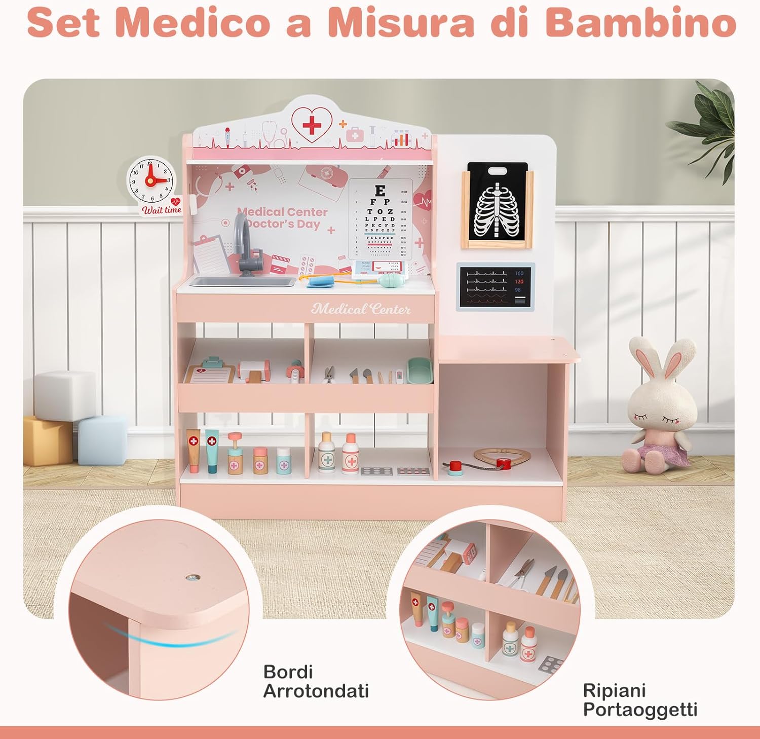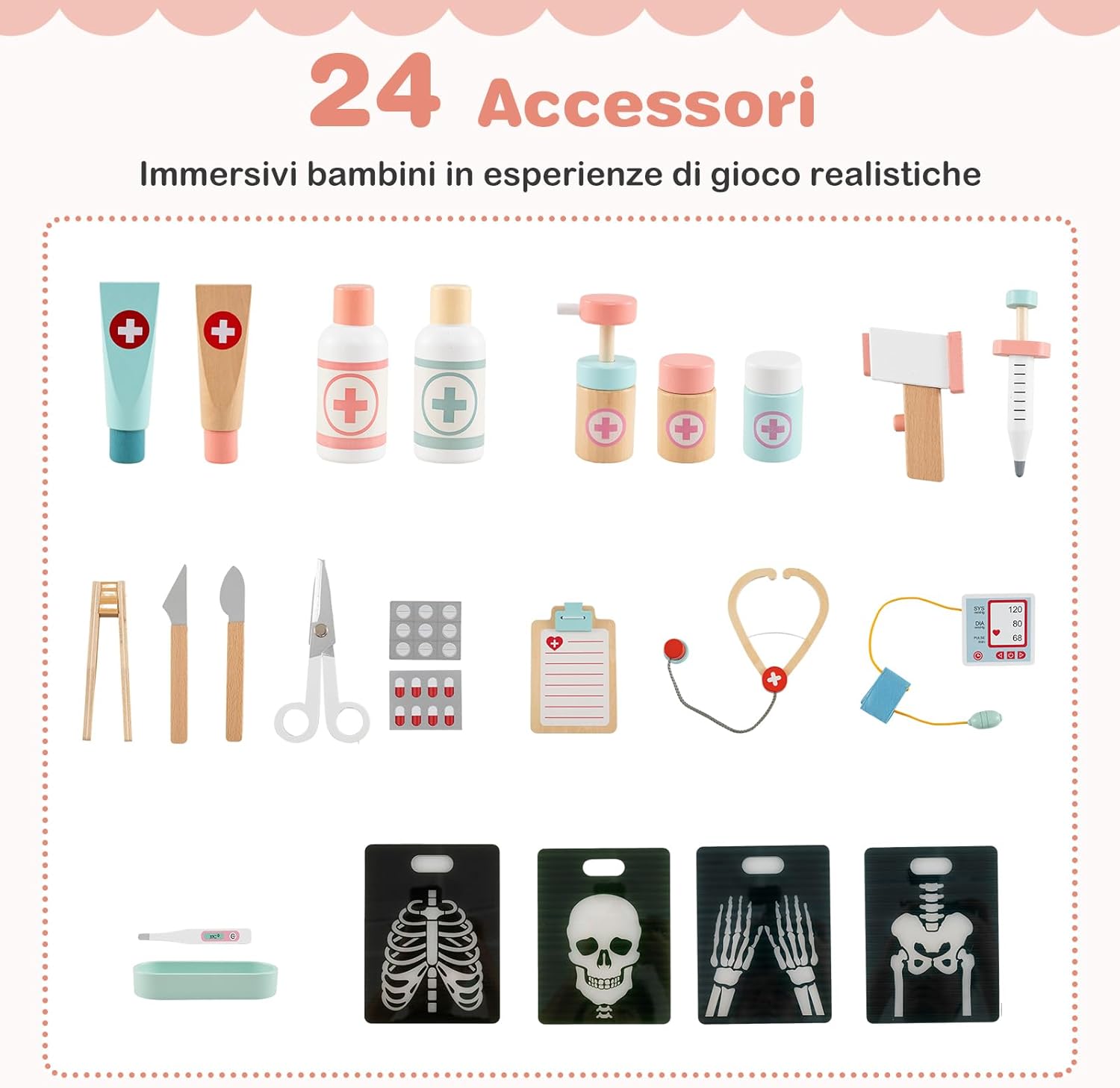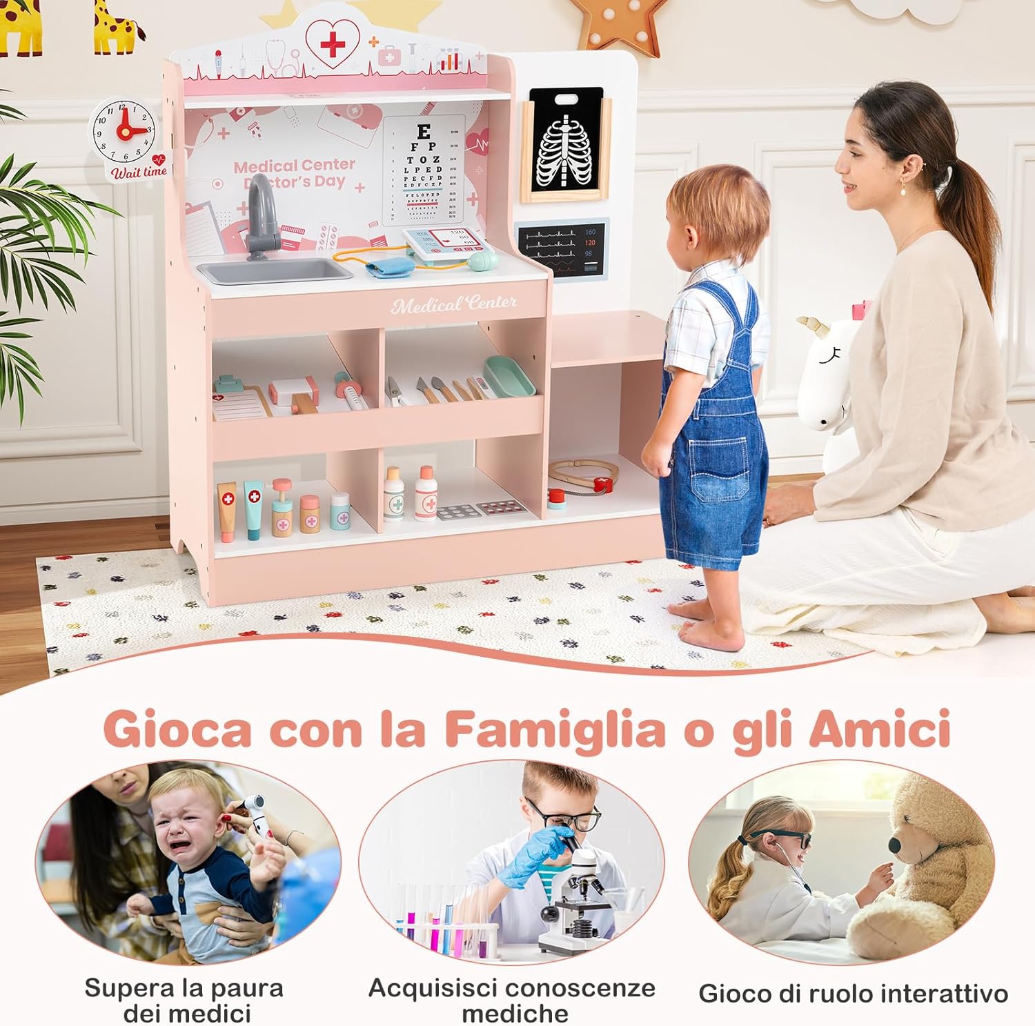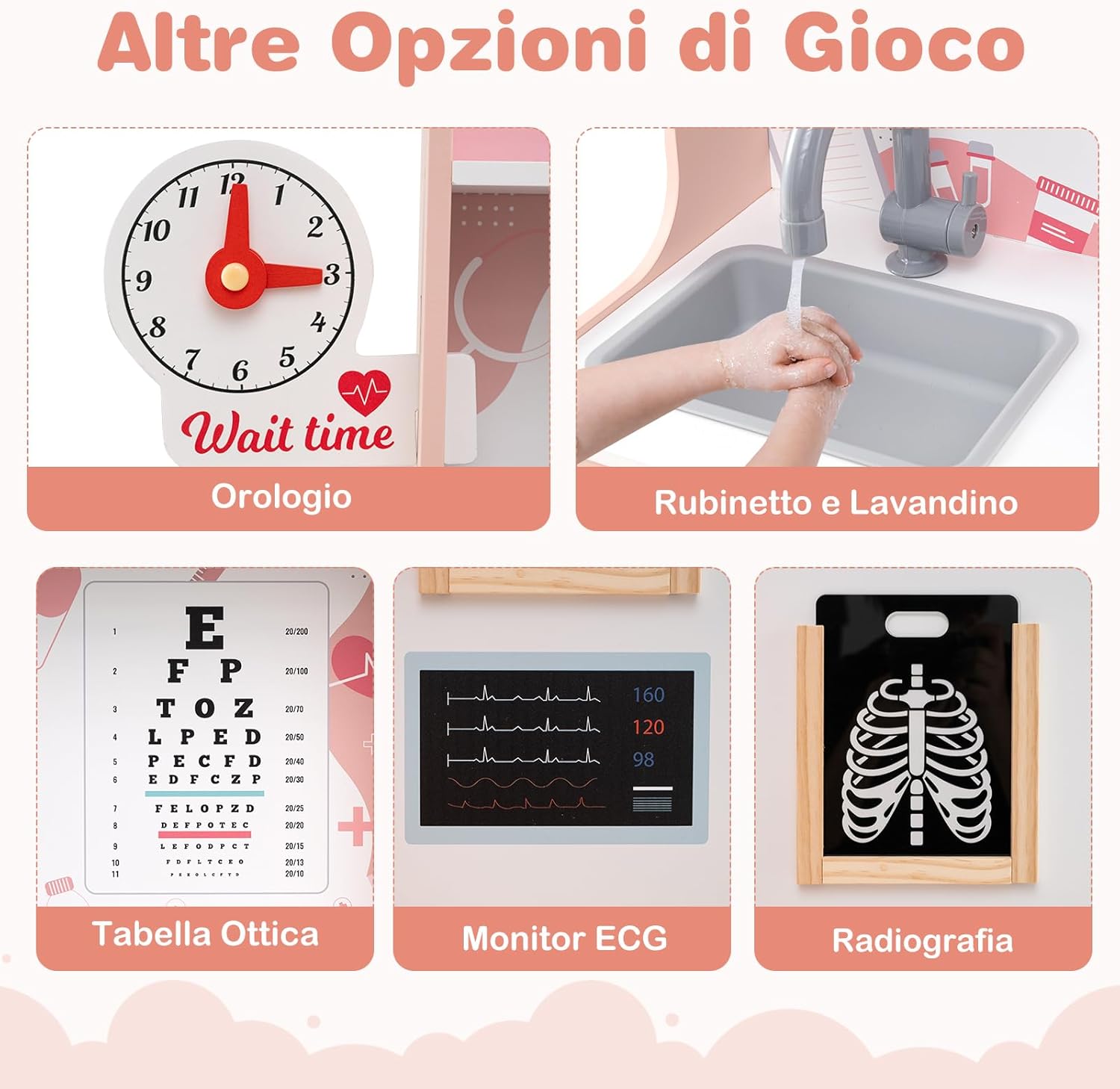 【Gioco Medico Realistico】Questo set da gioco del dottore in legno viene fornito con 24 accessori per il gioco di ruolo realistico. Che si tratti di ascoltare il battito cardiaco, misurare la pressione sanguigna o fare un'iniezione, ogni attività è progettata per imitare realisticamente le procedure mediche, aiutando il bambino a imparare mentre gioca. 【Strumenti per l'Apprendimento Coinvolgenti】 Con un sedile d'esame, i bambini possono invitare i loro amici come pazienti per un gioco interattivo. Inoltre, per equipaggiare il tuo futuro dottore, il set del centro medico adatto ai bambini include un orologio per insegnare la gestione del tempo, una tabella oculistica per esami della vista e un monitor ECG per un gioco medico avanzato. 【Organizzazione Ottimizzata】Questo ufficio ospedaliero finto è dotato di uno scaffale aperto, più ripiani espositivi e un compartimento spazioso per garantire che gli strumenti medici e gli accessori dei bambini siano riposti ordinatamente. Questo manterrà l'ordine e l'accessibilità durante i momenti di gioco di ruolo. 【Costruzione Sicura】Costruito pensando alla sicurezza dei bambini, questo kit da dottore in legno presenta bordi arrotondati e una base stabile per prevenire ribaltamenti, garantendo un ambiente di gioco sicuro. 【Divertimento Versatile e Interattivo】Questo set da gioco ospedaliero in legno non è solo un ufficio del dottore, ma anche un ospedale per animali domestici. Con la versatilità per accogliere sia amici pelosi che pazienti umani, incoraggia l'interazione sociale e l'empatia, supportando il gioco di squadra cooperativo e aiutando i bambini a superare le paure associate alle visite dal dottore.