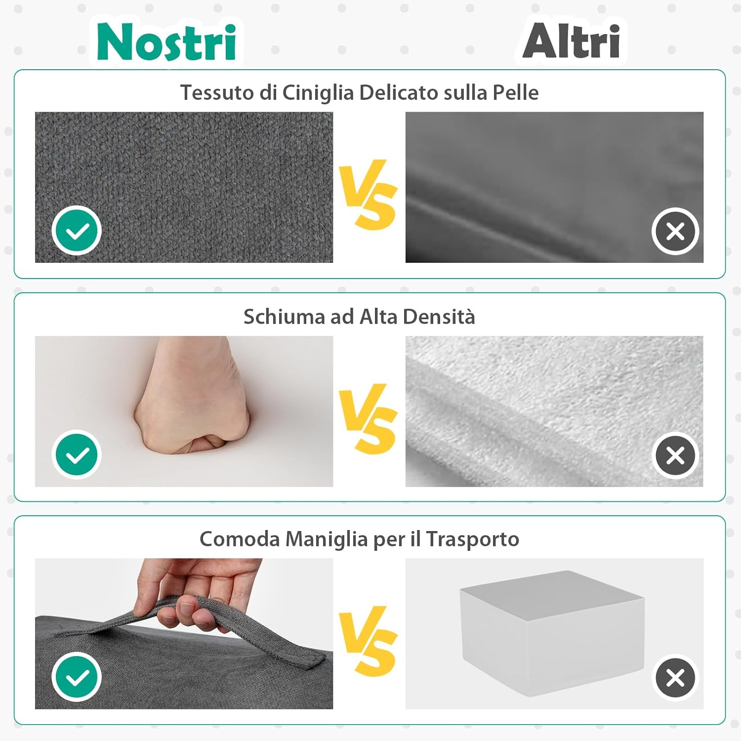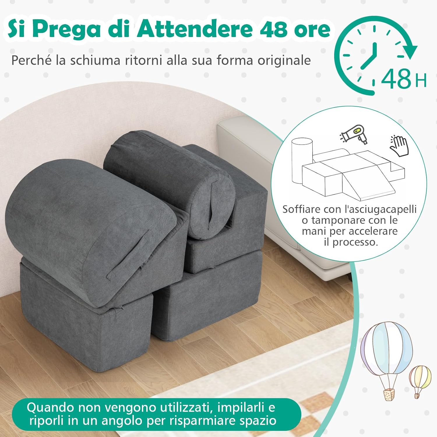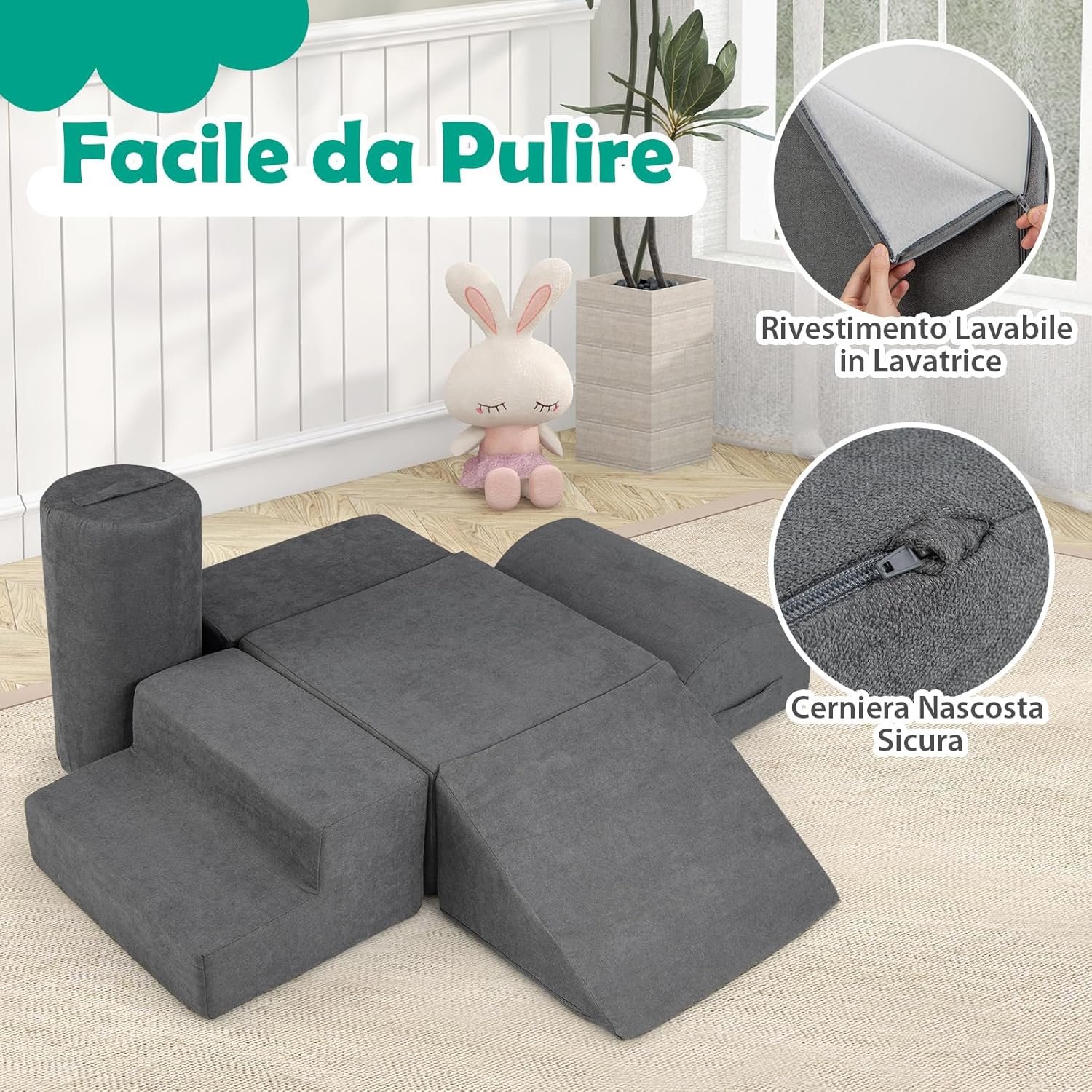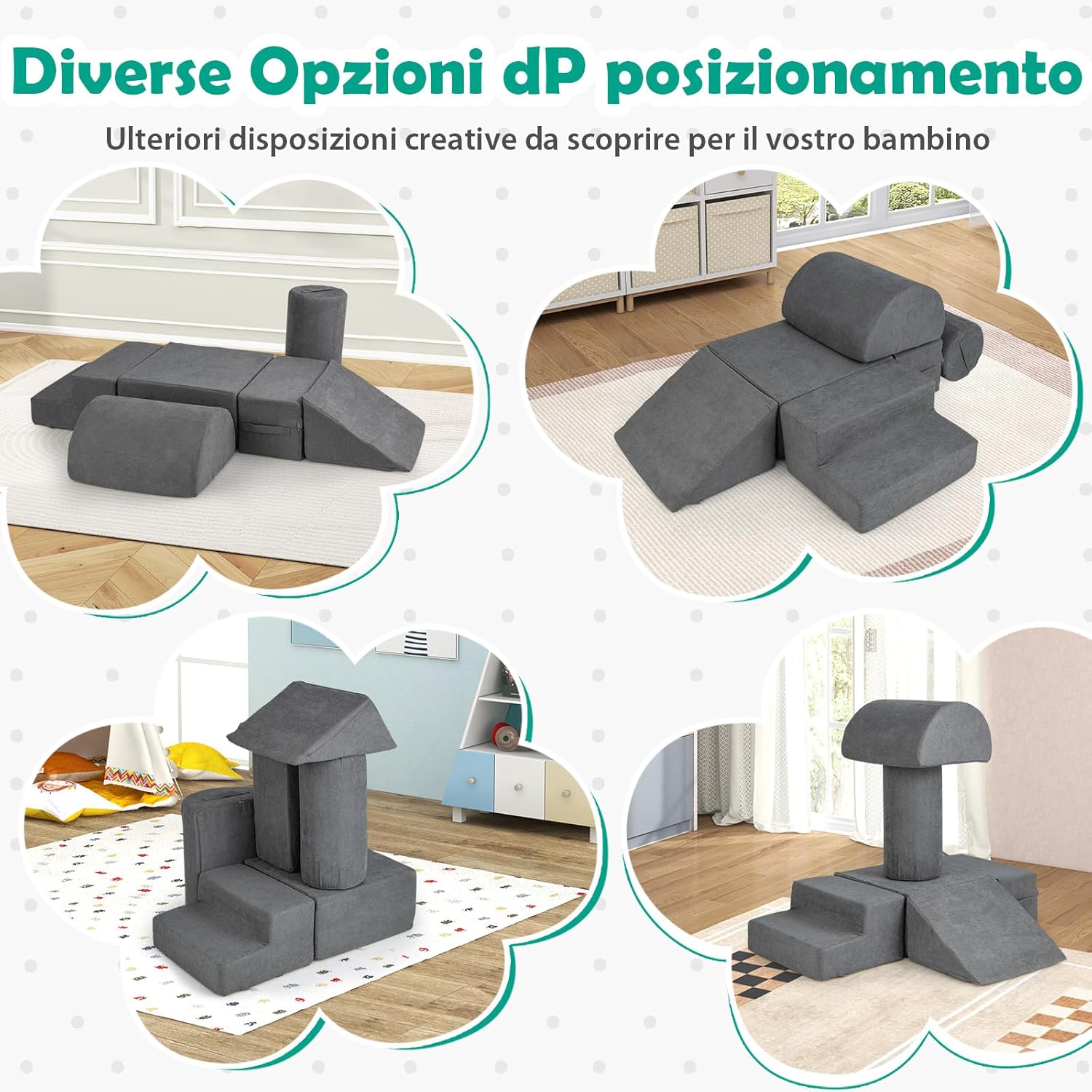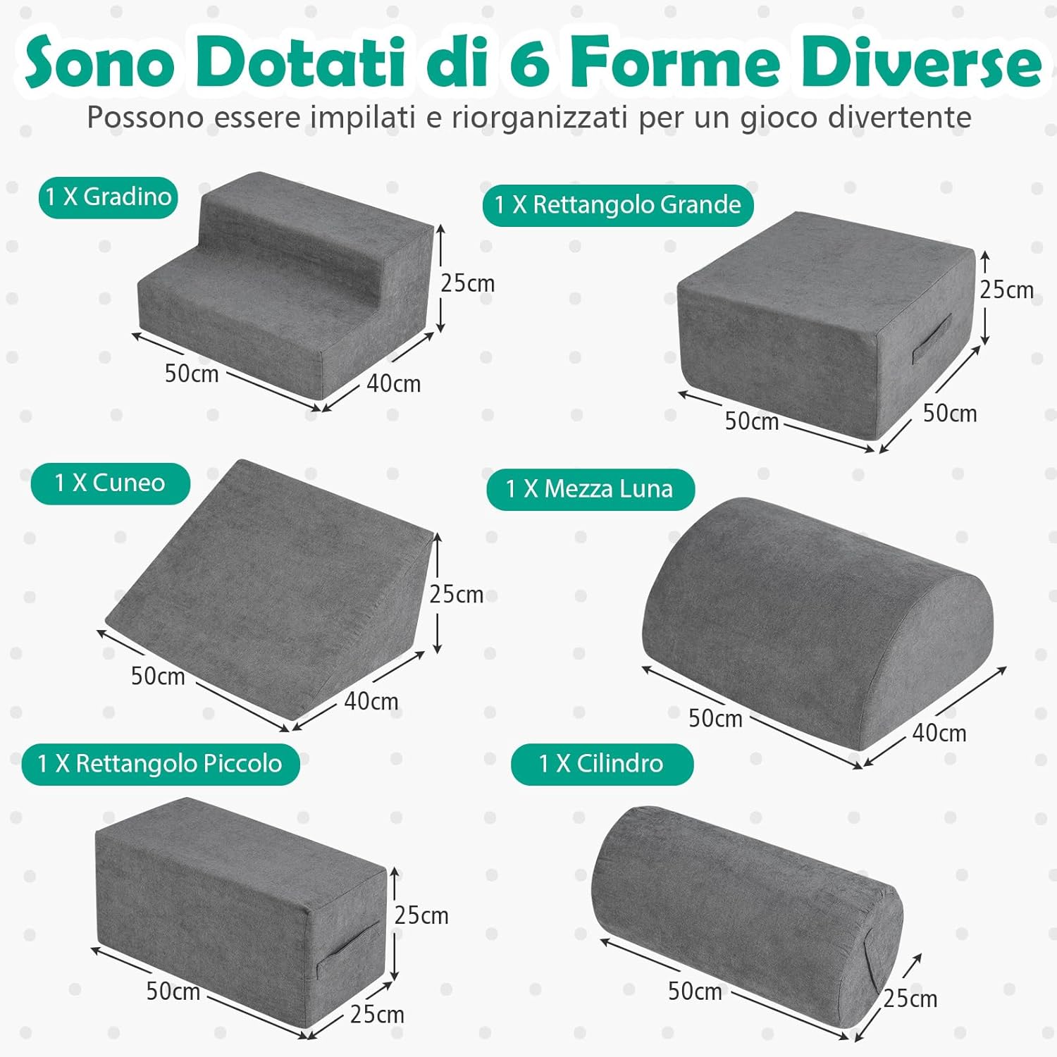 【Spugna ad Alta Densità】Riempiti con spugna ad alta densità, che ha una buona resilienza e supporto, questo set di gioco per scalare e gattonare offre un supporto solido per i tuoi bambini mentre giocano. Aspetta 48 ore affinché la spugna torni alla sua forma originale e usa un asciugacapelli o picchietta con le mani per accelerare il processo. 【Tessuto Ciniglia Amico della Pelle】Questi mattoncini da costruzione per bambini sono rivestiti in morbido tessuto ciniglia antiscivolo, garantendo un tocco accogliente e sicuro per il tuo piccolo. Le cerniere nascoste aggiungono un ulteriore livello di sicurezza per evitare graffi metallici. 【Set di Gioco Modulare a 6 Pezzi】Questa struttura di gioco morbida include 6 forme diverse, tra cui un gradino, un grande rettangolo, un piccolo rettangolo, un cuneo, un mezzo cerchio e un cilindro, che possono essere impilati e riarrangiati per un divertimento senza fine. I bambini possono costruire una fortezza, una casa e altre disposizioni creative da scoprire. 【Facile da Muovere e Mantenere】Ogni blocco è dotato di una maniglia per un facile spostamento e riconfigurazione. Le coperture sono removibili e lavabili in lavatrice, rendendo semplice mantenere il set di gioco per scalare pulito e accogliente, pronto per la prossima avventura di gioco del tuo piccolo. 【Regalo Educativo per Bambini】Come fantastico regalo per i più piccoli, questo set ostacoli di arrampicata rispetta elevati standard. È un'aggiunta divertente all'area di gioco del tuo bambino, sviluppando abilità motorie grossolane, coordinazione occhio-mano e altre importanti capacità fisiche e cognitive.