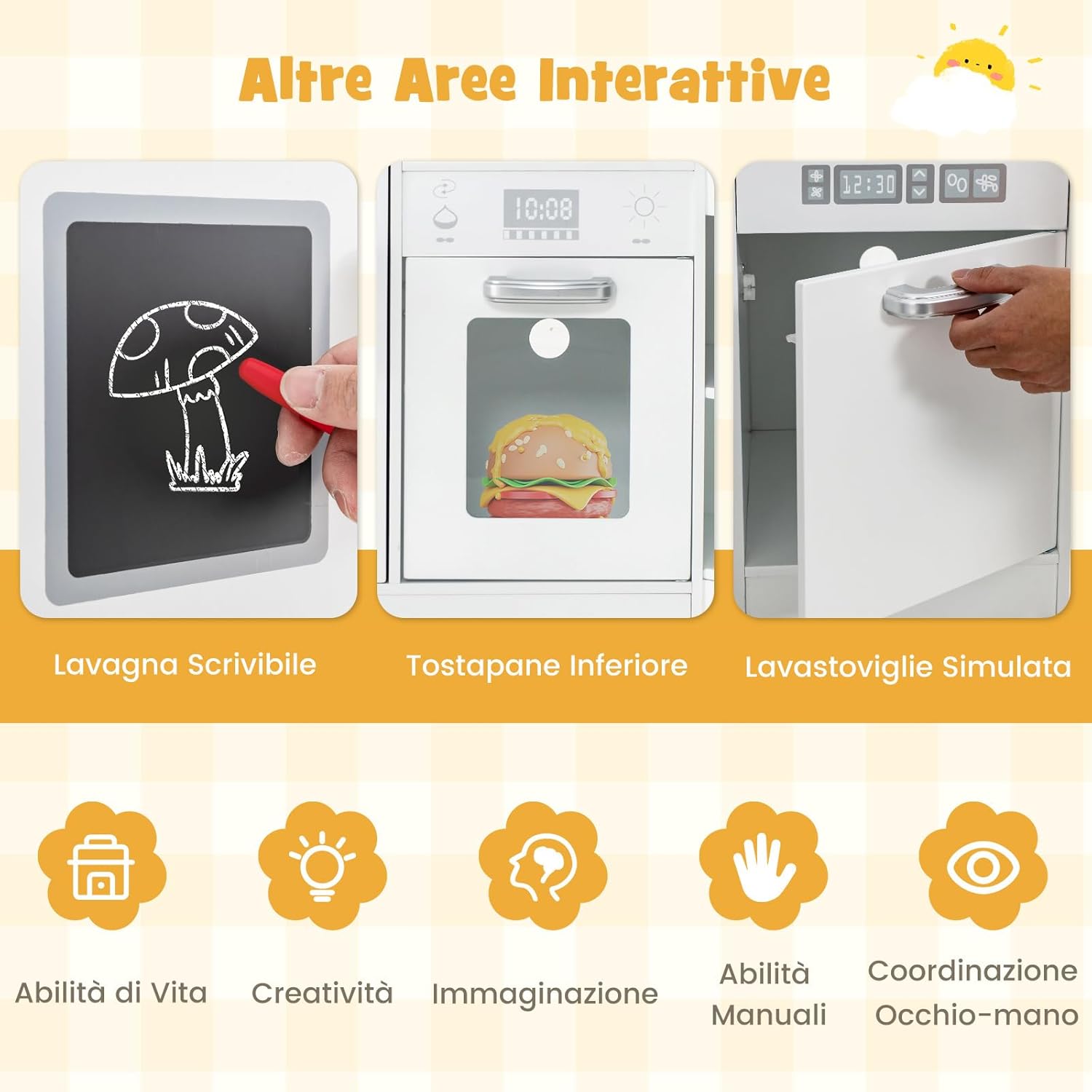 🍜【Lavabo separato】Il nostro set da cucina giocattolo per bambini ha un lavabo separato con un sistema di circolazione dell'acqua. Il rubinetto rotante e il lavabo staccabile consentono al tuo piccolo di fingere di lavare le verdure. 🍝【Suoni e luci diversi】Ci sono effetti sonori e luminosi realistici sul forno a microonde, sulla cappa aspirante e sui doppi fornelli con vapore. E le manopole girevoli emettono suoni quando i bambini le ruotano. 🍜【Più aree di gioco divertenti】Dotato di un produttore di ghiaccio, i bambini possono posizionare i cubetti di ghiaccio e premere per ottenere cubetti di ghiaccio. La lavastoviglie inferiore consente ai bambini di fingere di lavare i piatti. Possono anche disegnare o scrivere sulla lavagna. 🍝【Ampio spazio di archiviazione】Il ripiano superiore e i 2 armadietti aperti offrono spazio sufficiente per riporre vari giocattoli e cibo.I 3 ganci possono essere utilizzati per appendere le posate e mantenere la cucina in ordine. 🍜【Ottimo regalo per le tue festività per i tuoi bambini】Il set di cucina giocattolo per bambini è una scelta di regalo ideale per esercitare la capacità pratica dei bambini e stimolare la loro immaginazione.
