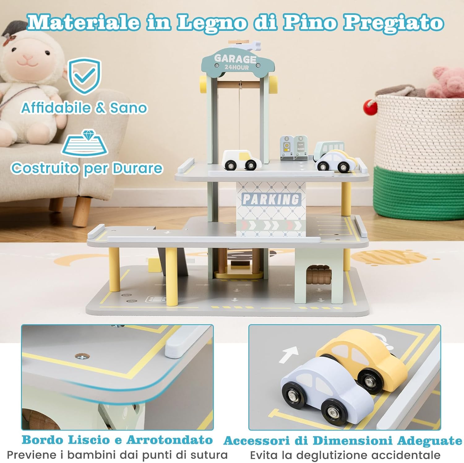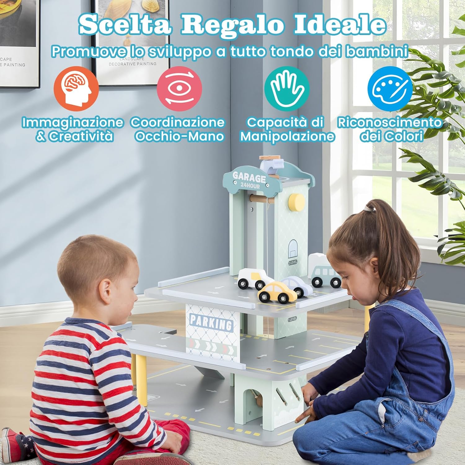 【Set di Gioco Completo】Questo set di garage per parcheggio a 3 strati è ricco di funzionalità per un divertimento senza fine, completo di 4 auto colorate e un elicottero. La combinazione di ascensore, elipista, stazione di servizio, lavaggio auto, pendenza e barra di sollevamento incoraggia ore di gioco immaginativo. 【Materiali di alta qualità】Realizzato in legno affidabile e sano, questo set di garage a 3 strati è costruito per durare e può resistere al gioco entusiasta dei bambini. Inoltre, i bordi lisci e arrotondati prevengono tagli, e gli accessori di dimensioni appropriate evitano la possibilità di inghiottimento accidentale. 【Caratteristiche Interattive】Migliora l'esperienza di gioco del tuo bambino con elementi interattivi come un ascensore divertente da usare e una barra di sollevamento. Queste caratteristiche non sono solo divertenti, ma sono anche perfette per lo sviluppo della coordinazione mano-occhio e delle abilità pratiche. 【Gioco Creativo Migliorato】L'elicottero e l'elipista inclusi nel set porteranno ulteriore divertimento. Inoltre, l'aggiunta del lavaggio auto e della stazione di servizio promuove l'immaginazione e la creatività del tuo piccolo. 【Giocattolo Educativo Ideale】Questo set di garage per parcheggio non è solo un giocattolo, ma un prezioso strumento educativo che promuove lo sviluppo completo dei bambini. Il set di gioco soddisfa standard elevati, rendendolo una scelta regalo ideale per i bambini.