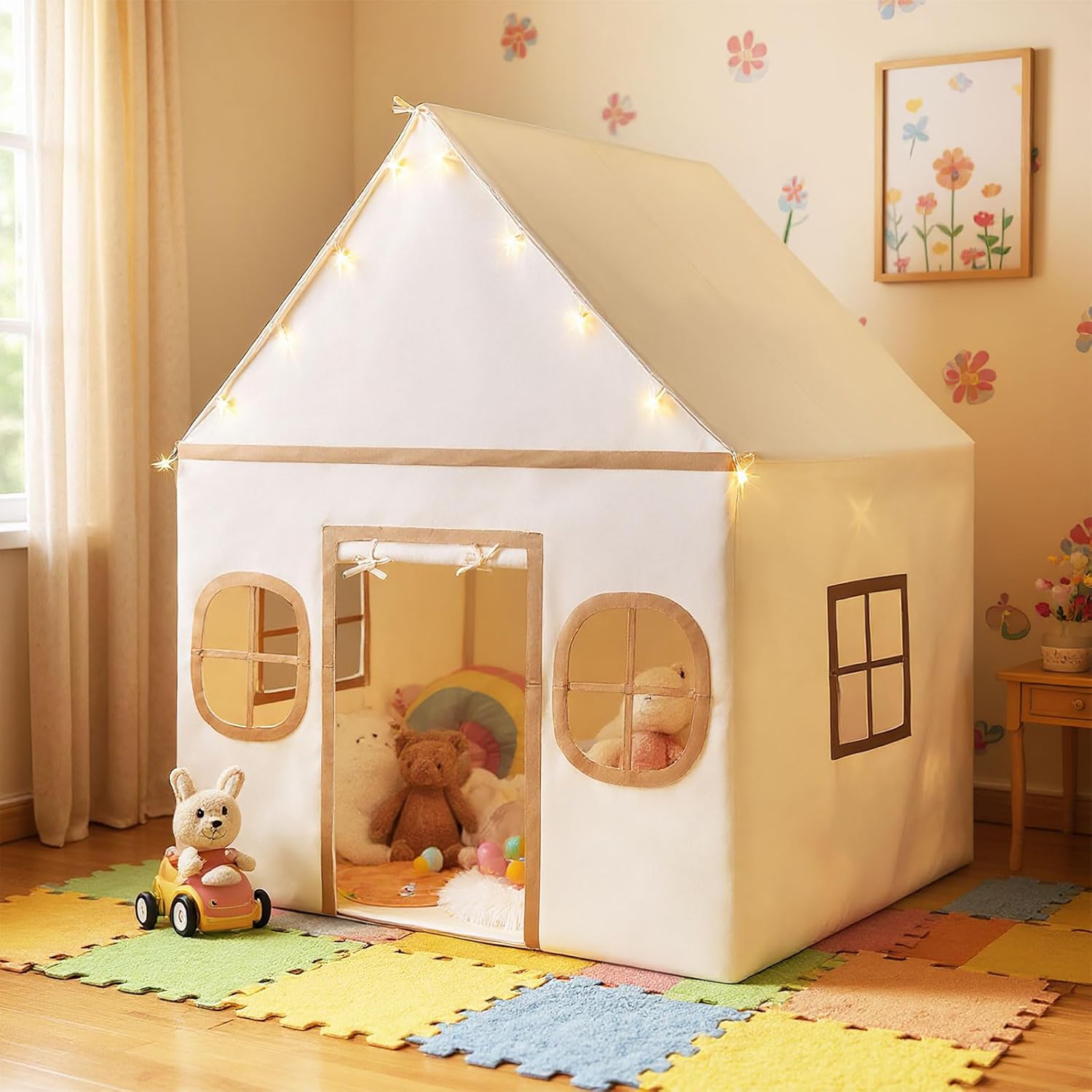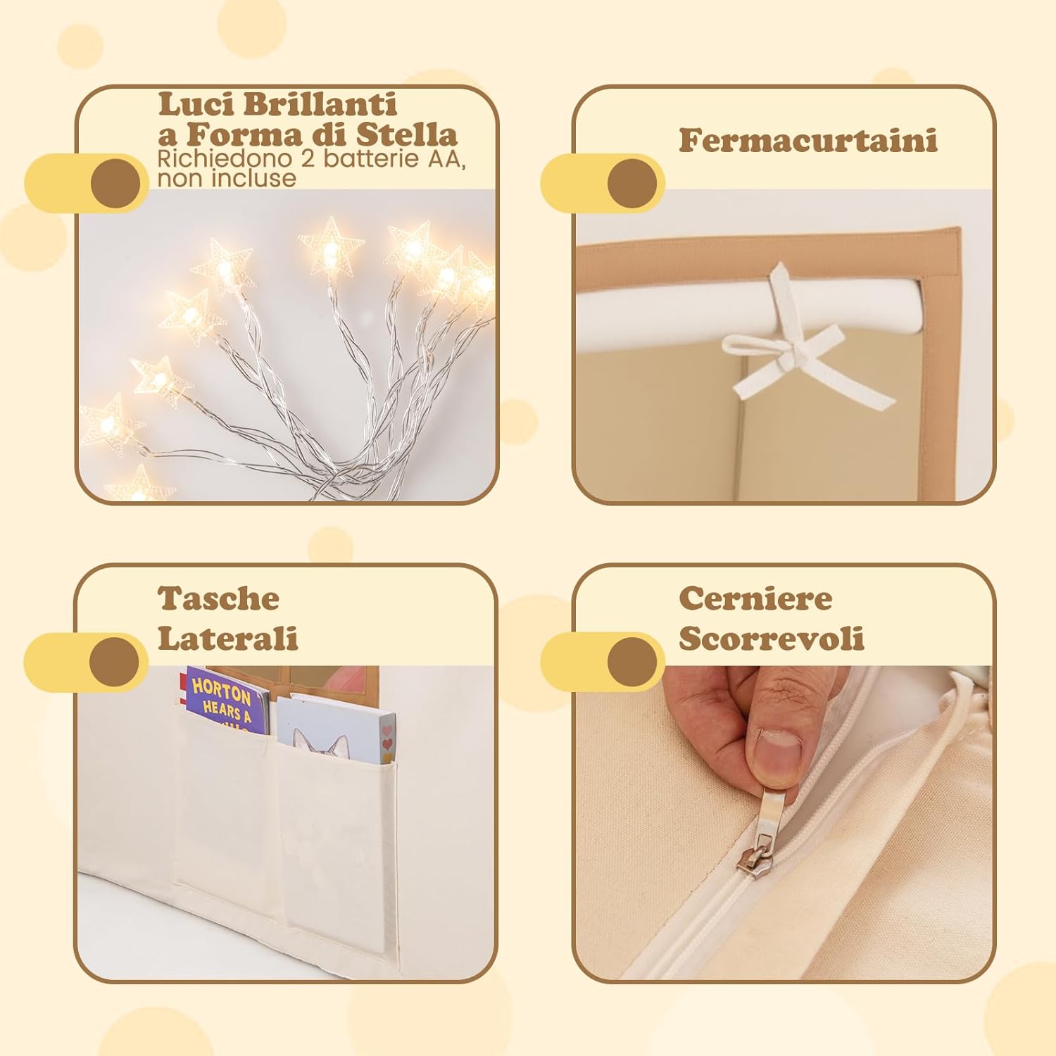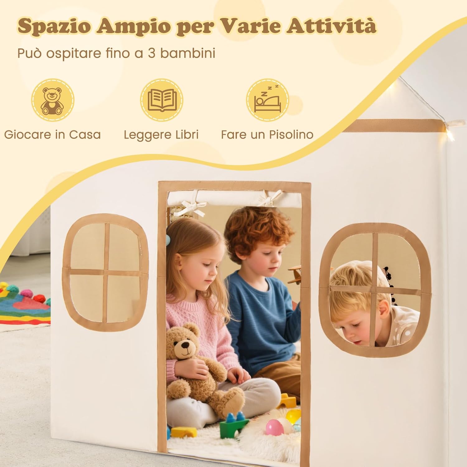 【Spazio Ampio per Bambini】La tenda da gioco misura 120 x 101 x 143 cm (L x P x A), può ospitare fino a 3 bambini contemporaneamente. Sarà un bel posto per giocare a casa, leggere libri o fare un pisolino, soddisfacendo le diverse esigenze dei bambini. 【Tappetino in Velluto Corallo Morbido】Il tappetino in velluto corallo è dotato di imbottitura in spugna per un tocco confortevole. Inoltre, il fondo antiscivolo impedisce di scivolare per garantire maggiore sicurezza. Quando non in uso, il tappetino può essere ripiegato in dimensione compatta per risparmiare spazio. 【Materiali Durevoli】Realizzata con tubi in PVC ispessito, la tenda da gioco per bambini rimane stabile e non si abbassa facilmente. è inoltre coperta con tessuto in cotone poliestere resistente all'usura per un uso a lungo termine. 【Caratteristiche Premurose】Ci sono 4 finestre per mantenere la tenda ventilata. 2 tasche laterali permettono ai bambini di riporre i loro articoli, come libri, giocattoli. Inoltre, la tenda viene fornita con luci a stella luminose per creare un'atmosfera magica e sognante. Nota: Le luci richiedono 2 batterie AA, non incluse. 【Regalo Ideale e Facile da Pulire】La tenda gioco è progettata appositamente per bambini dai 3 ai 10 anni. Sarà un'opzione regalo perfetta per i loro compleanni, Natale o altri festival. Inoltre, il tappetino lavabile e il cotone poliestere lavabile in lavatrice rendono la pulizia un gioco da ragazzi.