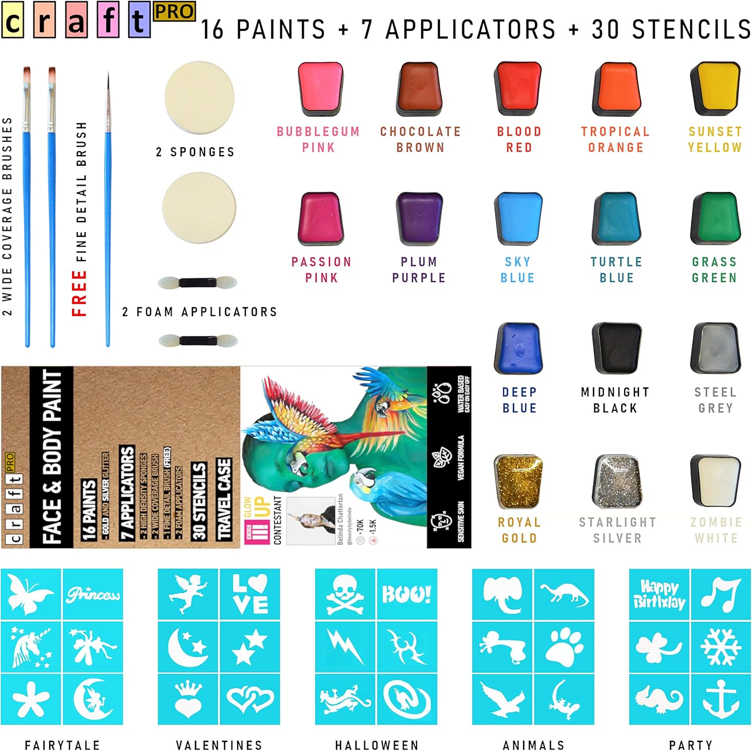 ✅ PACCO DA CONDIVIDERE 🎨 Include 16 colori per viso removibili e richiudibili, oltre a glitter color oro e argento. Include anche 7 applicatori, 30 stampini e un contenitore da viaggio compatto, leggero e sicuro 🖌️ Questo significa che ha un grande valore ed è perfetto per essere condiviso, così ci saranno meno discussioni e più divertimento! ✅ ADATTO PER LA PELLE SENSIBILE 💧 Tutti i nostri ingredienti di alta qualità sono per utilizzo cosmetico, testati in laboratorio e con certificazione FDA. Sono anche ipoallergenici, atossici, senza parabeni, senza profumo e senza alcool. Puoi essere sicuro che le nostre tinte per viso e corpo sanno essere amichevoli e gentili con la pelle sensibile 🥰 Come per tutti i cosmetici consigliamo di eseguire un piccolo test cutaneo prima del loro utilizzo. ✅ FACILE DA METTERE/DA TOGLIERE 👌 La nostra formula viso a base di acqua è facile da applicare. Attiva la tinta con un po’ d'acqua e mescola bene fino ad ottenere una crema. Inoltre, la tinta asciuga rapidamente e durerà (senza prurito) per diverse ore. Una volta arrivato il momento di pulire sarà facile risciacquare la pelle, i vestiti e gli applicatori senza lasciare macchie. Così non dovrai mai preoccuparti di te stesso o che i bambini combinino disastri! ✅ VEGAN + CRUELTY FREE 🌿 Le nostre tinte per il viso hanno una formula vegana al 100% e cruelty free, e il nostro packaging è riciclabile. Questi prodotti non sono mai testati su animali e vengono fabbricati in modo etico. Quindi puoi essere felice nel sapere che stai facendo del tuo meglio per essere un consumatore responsabile 🌍 ✅ GARANZIA DI 28 GIORNI 📦 Siamo orgogliosi della qualità della nostra palette di tinte per il viso. Se non sei soddisfatto al 100% puoi effettuare un reso entro 28 giorni dall'acquisto, senza farti domande! Ottieni la tua giornata SENZA RISCHI fino ad esaurimento scorte! ⏳