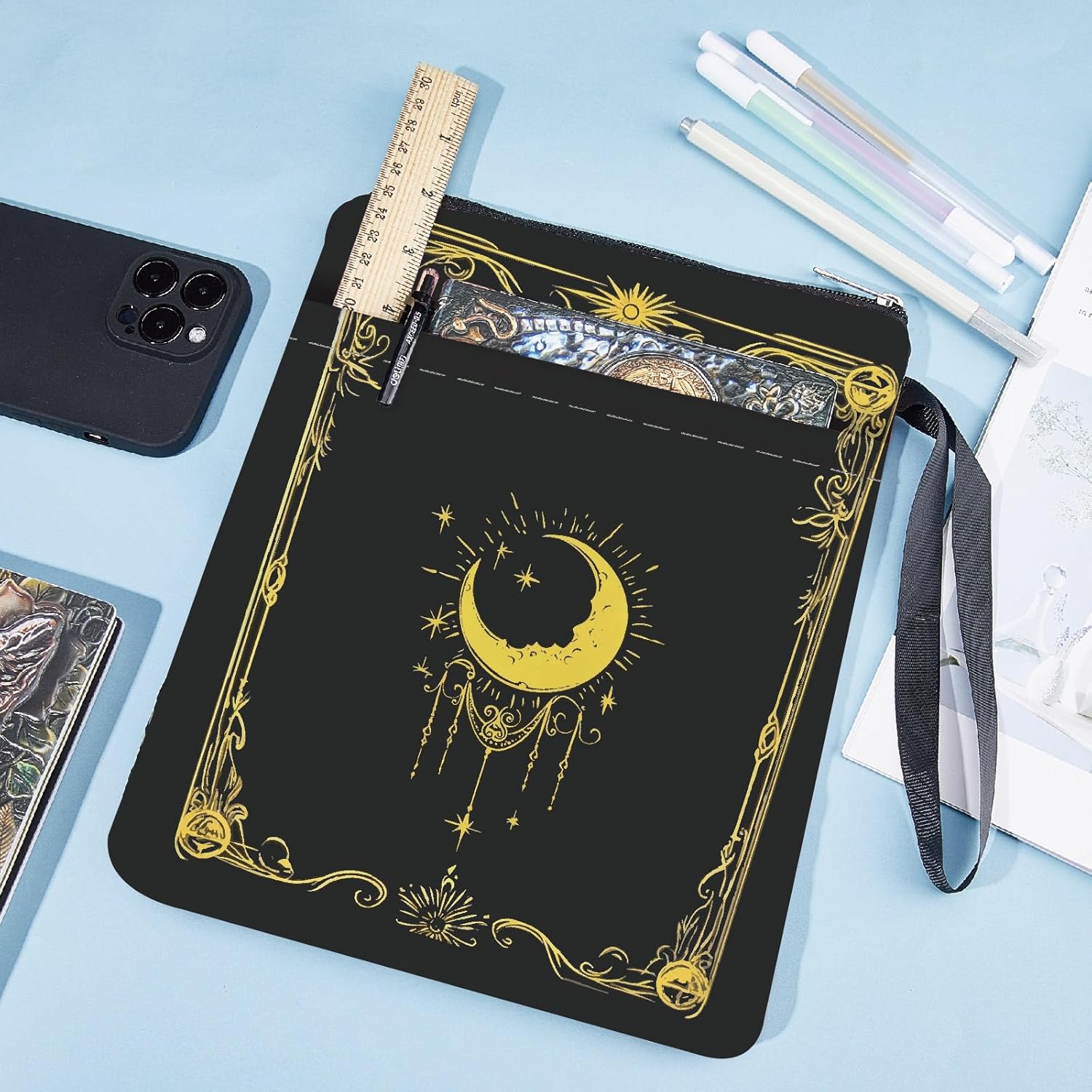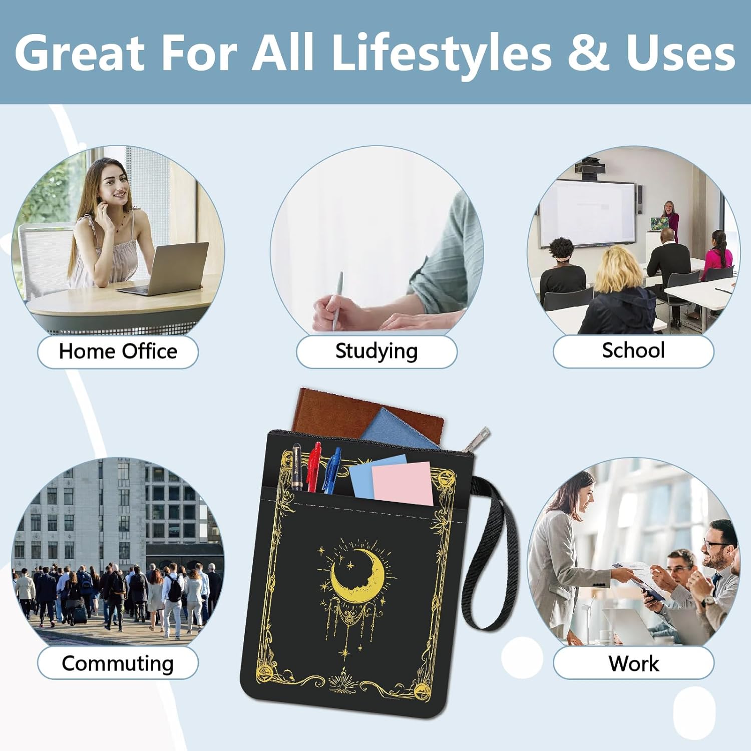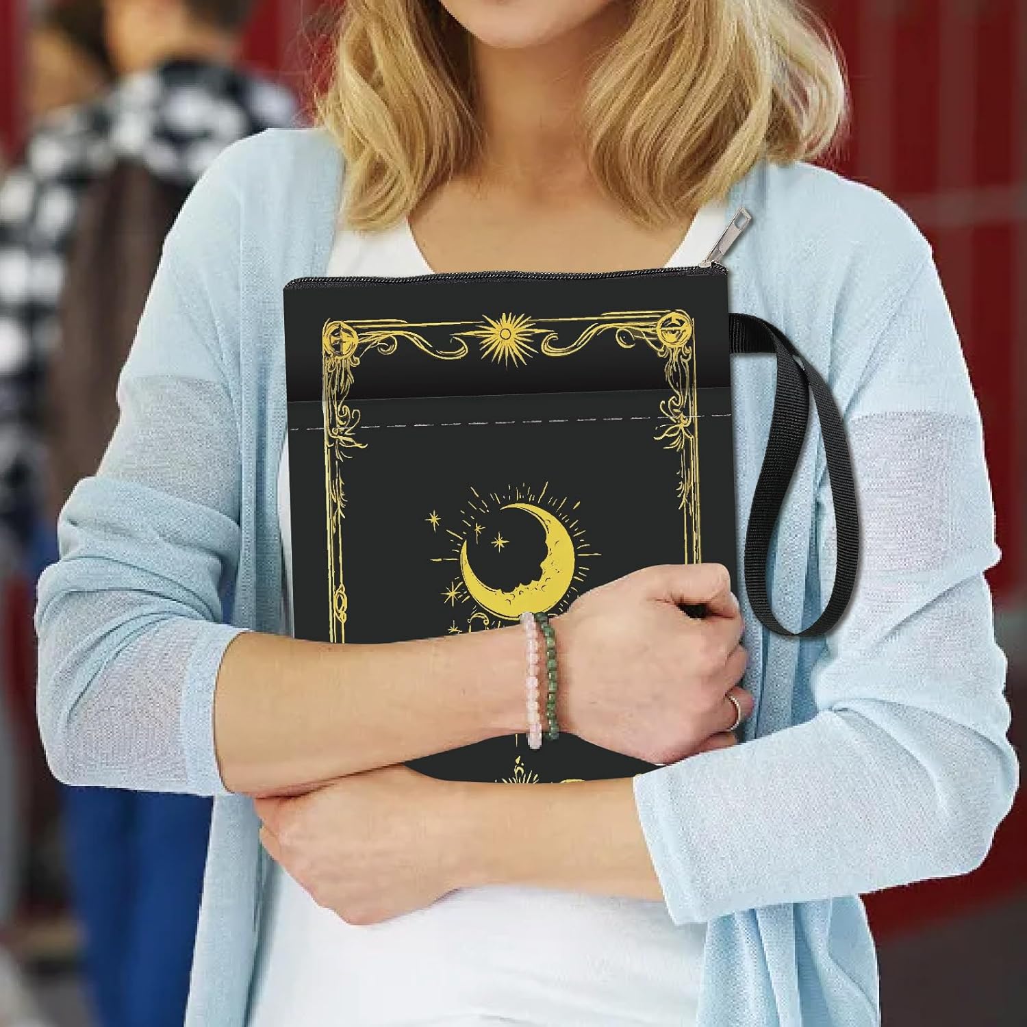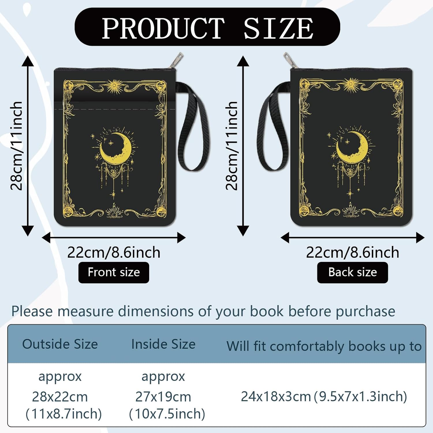 COPERTINA DEL LIBRO SOLE E LUNA: la copertina del libro fronte-retro presenta un elegante e innovativo motivo sole e luna, il tessuto del libro protegge il tuo libro dalla polvere o dalle pagine strappate e piegate. COPERTINA DEL LIBRO: 28 x 22 cm (11 x 8,7 pollici), la copertina del libro può ospitare comodamente libri fino a 9,5x7x1,3 pollici, come: tascabili standard, tascabili di massa e copertine rigide normali. Custodia per libri LAVABILE: la custodia per libri è realizzata in tessuto, leggera, pieghevole, resistente all'usura, non facile da deformare, lavabile e riutilizzabile. Il materiale impermeabile può impedire all'acqua di schizzare sul libro e di bagnarlo. CUSTODIA DEL LIBRO CON TASCA CON ZIP: La copertina del libro si chiude con una cerniera in modo che il libro non scivoli accidentalmente fuori dalla copertina. Ha una tasca portaoggetti nella parte anteriore, offre spazio sufficiente per accessori, quaderni, piccoli diari, articoli di cancelleria o altri piccoli oggetti decorativi. MOLTEPLICI USI: viaggiare, campeggiare, andare in biblioteca, la custodia può evitare che i tuoi libri preferiti vengano schiacciati o proteggere meglio il tuo tablet. Può essere utilizzato ovunque, come ufficio, parco o spiaggia. Può essere una custodia per Kindle, una custodia per libri, una protezione per libri, copertine per libri tascabili, custodia per libri con cerniera.