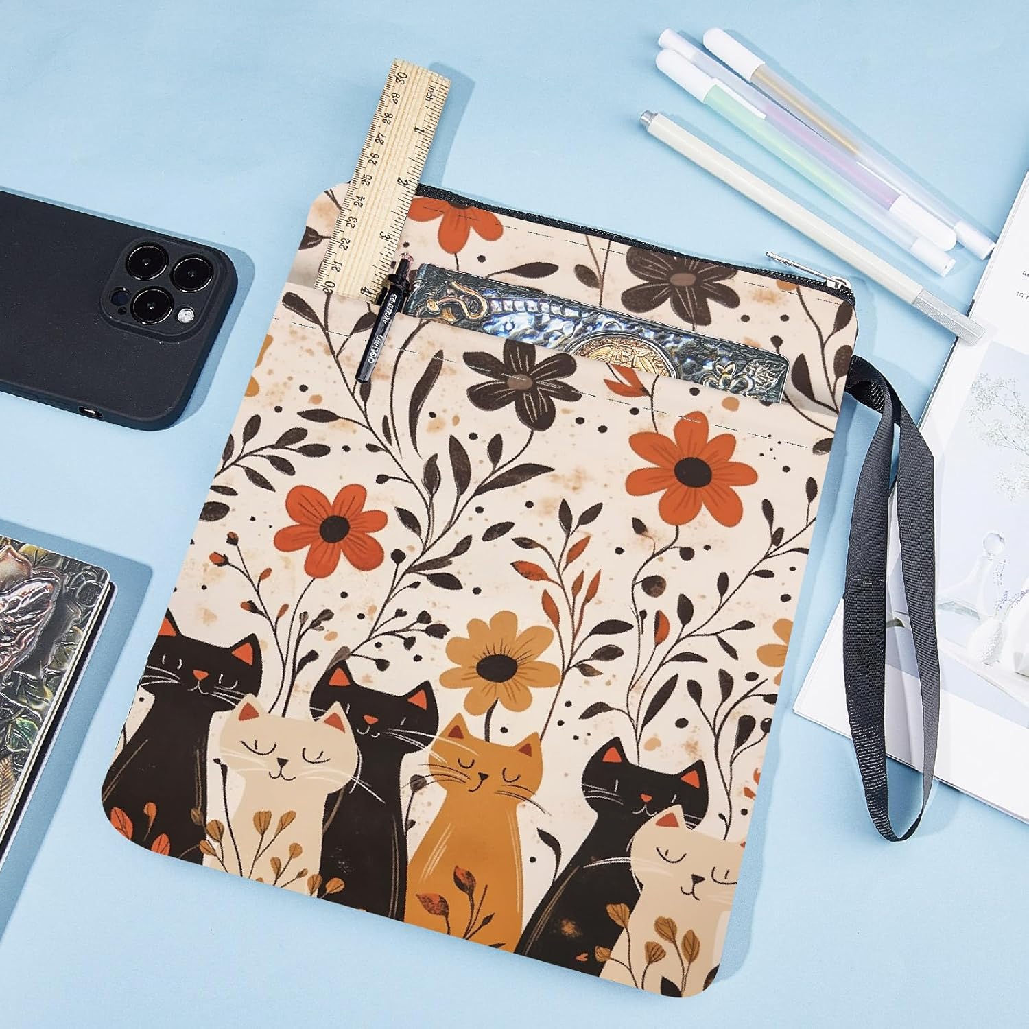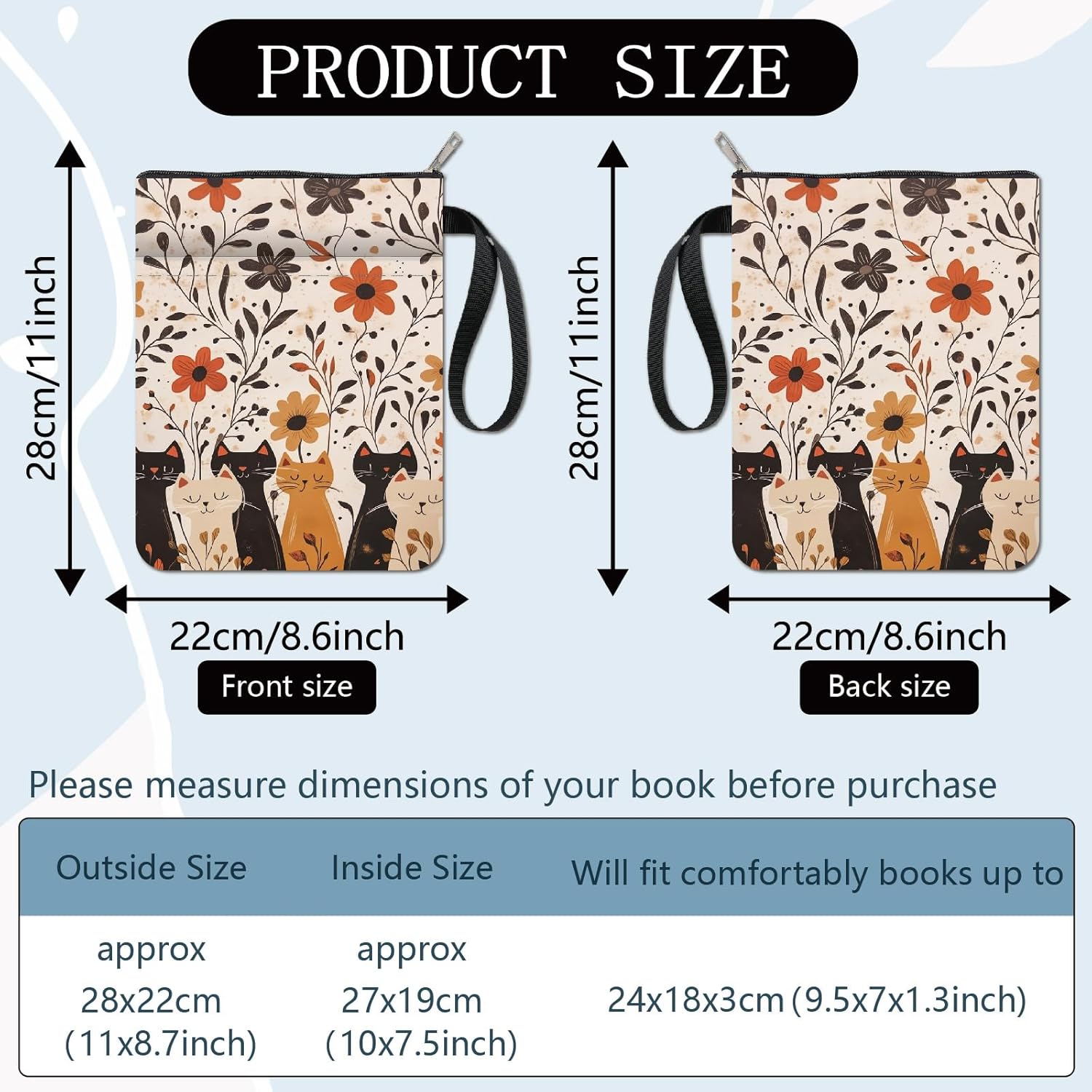 Motivo a gatti e fiori:la copertina del libro sui gatti ha un motivo a gatti e fiori., con atmosfera primaverile, sembrano delicati e belli, sarà fantastico proteggere i tuoi libri e fare un regalo fantastico per gli altri Dimensioni della custodia per libro floreale:circa 22cm (8.66 pollici) di larghezza, 28cm (11.02 pollici) di lunghezza, adatto per libri fino a 24 x 18 x 3cm (9.5 x 7 x 1.3 pollici), 1 pc Custodia in tessuto per libri:la custodia per libri con gatti è realizzata in tessuto, materiale liscio, forte copertura protettiva, garantire la sicurezza dei libri, non strappare non rompere, luce durevole, lavabile Spazio extra:la copertina del libro a fiori ha una tasca frontale extra per organizzare gli oggetti., che è perfetto per riporre accessori per libri come i cellulari, i Quaderni, piccoli diari, Stazionario, occhiali, segnalibri, anche i cosmetici, prodotti per la cura della pelle, eccetera Ampie applicazioni:la copertina del libro per gatti non è solo una custodia protettiva per i libri, ma anche come borsa per il trucco, borsa da viaggio per il trucco, è adatto ai lettori di libri, bibliotecari, insegnanti, lettori, amici, sorelle, colleghi, avvocati e così via