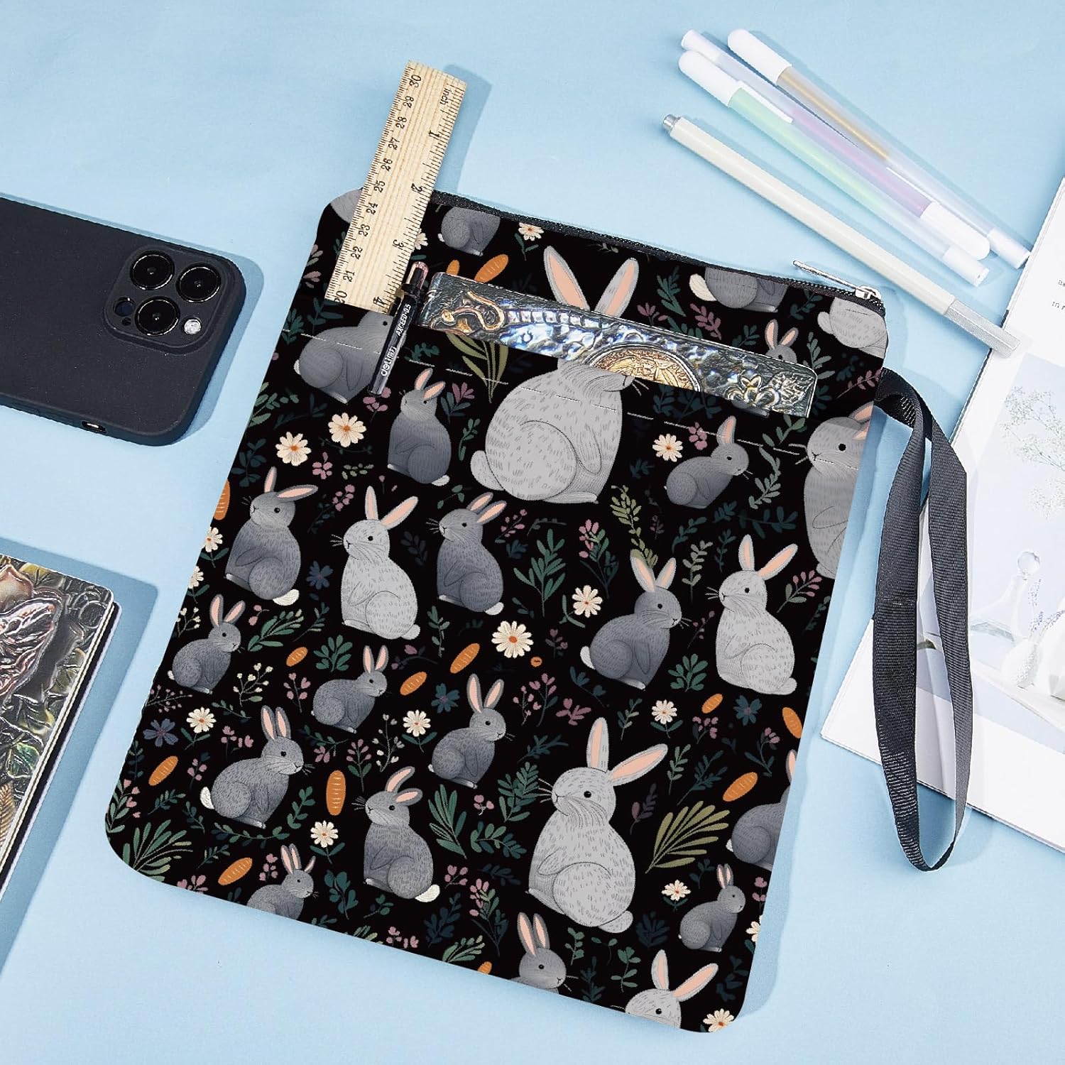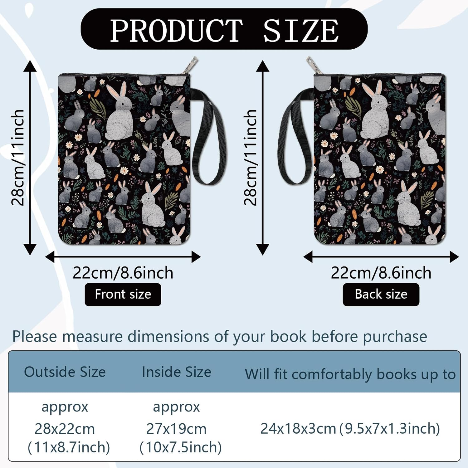 CUSTODIA PER LIBRI CONIGLIO:la copertina del libro ha un motivo elegante e innovativo, che protegge il tuo libro dalla polvere o dalle pagine strappate e piegate, ed è anche un regalo perfetto per gli amanti dei libri. DIMENSIONE:copertina del libro larga circa 8.66 pollice (22cm )., 11.02 pollice (28cm ) di lunghezza. Si adatta alla maggior parte dei libri autopubblicati, tascabili standard, tascabili di massa, e copertine rigide regolari. Assicurati di misurare il tuo articolo prima dell'acquisto per assicurarti che funzioni per te. TESSUTO LAVABILE:Realizzato in tessuto lavabile, la fodera nera è resistente allo sporco e presenta una chiusura con cerniera liscia di alta qualità per una maggiore protezione. Sottile e leggero, non ingombra il tuo libro, può facilmente scivolare nella tua valigetta, zaino o altra borsa. TASCA EXTRA SULLA MANICA:questa copertina del libro non può contenere solo libri, la tasca extra sulla manica può contenere anche penne, occhiali, segnalibri, bloc notes, cuffie e altri accessori, pratico e bello in uno. AMPIO UTILIZZO:queste custodie per libri possono essere utilizzate per proteggere i libri, libri di testo o quaderni ed è adatto agli studenti, insegnanti, scrittori, studiosi, librerie o chiunque ami i libri o voglia distinguerli facilmente.