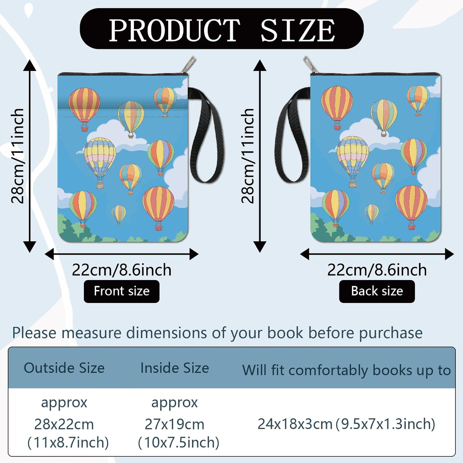 CUSTODIA PER LIBRI A MONGOLFIERA:la copertina del libro ha un motivo elegante e innovativo, che protegge il tuo libro dalla polvere o dalle pagine strappate e piegate, ed è anche un regalo perfetto per gli amanti dei libri. DIMENSIONE:copertina del libro larga circa 8.66 pollice (22cm )., 11.02 pollice (28cm ) di lunghezza. Si adatta alla maggior parte dei libri autopubblicati, tascabili standard, tascabili di massa, e copertine rigide regolari. Assicurati di misurare il tuo articolo prima dell'acquisto per assicurarti che funzioni per te. TESSUTO LAVABILE:Realizzato in tessuto lavabile, la fodera nera è resistente allo sporco e presenta una chiusura con cerniera liscia di alta qualità per una maggiore protezione. Sottile e leggero, non ingombra il tuo libro, può facilmente scivolare nella tua valigetta, zaino o altra borsa. TASCA EXTRA SULLA MANICA:questa copertina del libro non può contenere solo libri, la tasca extra sulla manica può contenere anche penne, occhiali, segnalibri, bloc notes, cuffie e altri accessori, pratico e bello in uno. AMPIO UTILIZZO:queste custodie per libri possono essere utilizzate per proteggere i libri, libri di testo o quaderni ed è adatto agli studenti, insegnanti, scrittori, studiosi, librerie o chiunque ami i libri o voglia distinguerli facilmente.