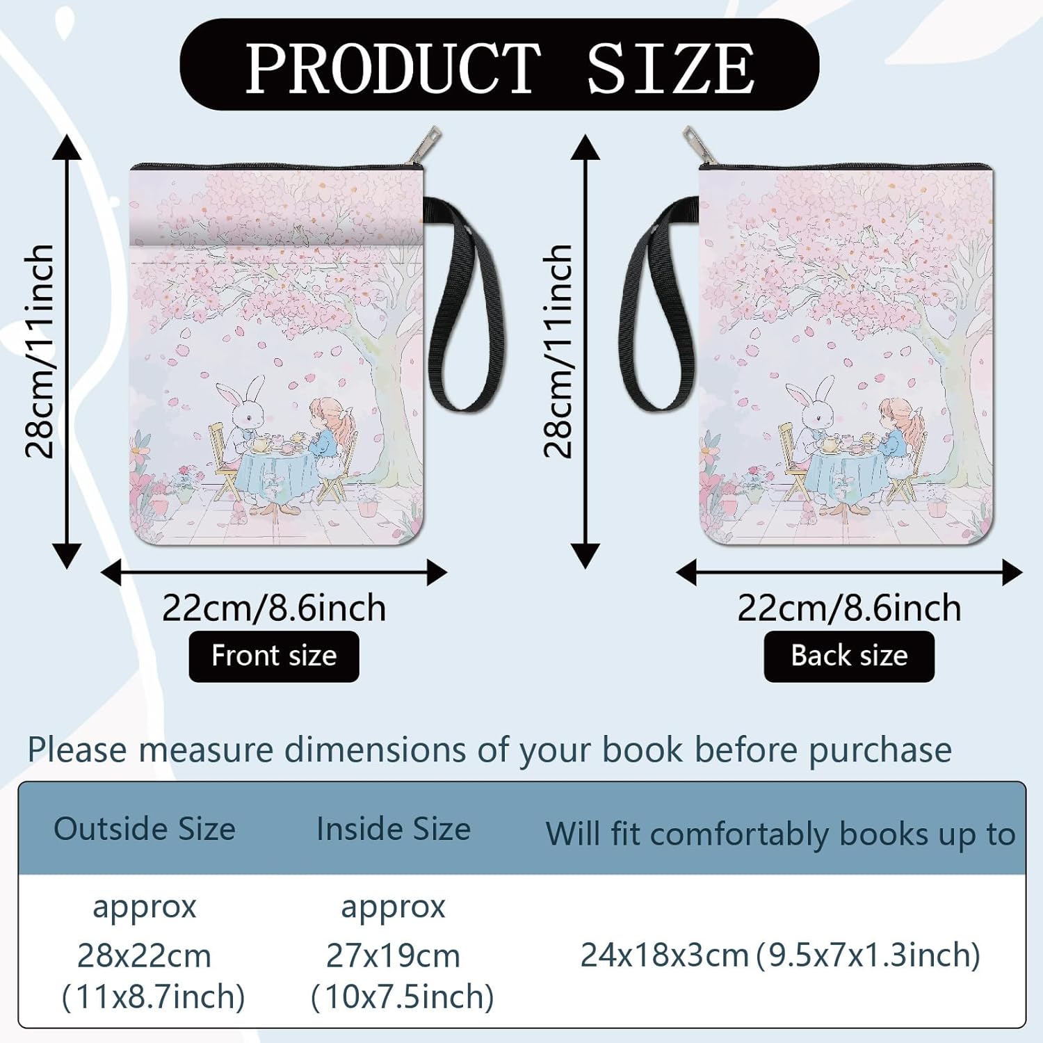 Dimensioni della custodia del libro:dimensioni della custodia del libro circa 11x8.6 pollice (28x22cm ), copertine per libri adatte a copertine di libri normali per la maggior parte dei libri, tascabili standard, libri tascabili ad alto volume, e copertine rigide. Si prega di leggere le dimensioni prima dell'acquisto, non adatto per libri di formato king size. Custodia per libri con cerniera:la custodia per libri è realizzata in tessuto, riutilizzabile, resistente all'usura, non facile da deformazione e contrazione, leggero, può proteggere bene il tuo libro, la custodia per libri è dotata di una cerniera di alta qualità che aggiunge ulteriore protezione al tuo libro, proteggere il contenuto dallo scivolamento fuori. Tasca extra per la custodia del libro:la copertina del libro non può contenere solo libri, la tasca extra sulla manica può contenere anche penne, occhiali, segnalibri, bloc notes, cuffie e altri accessori, pratico e bello in uno. Custodia per libro coniglio:motivo cartone animato con albero rosa e fiore di coniglio per il tè pomeridiano, adorabile e squisito, le copertine dei libri possono proteggere il tuo libro dalla polvere o dalle pagine strappate e piegate, è anche un regalo perfetto per gli amanti dei libri. Ampie applicazioni:la custodia per libri può proteggere i tuoi libri preferiti dallo sporco o dalle pieghe, o proteggi meglio la tua penna. Può essere utilizzato ovunque, come l'ufficio, parco o spiaggia. Può essere una custodia per libri, protettore del libro, copertine di libri per tascabili, copertina a libro con cerniera. Può anche essere un regalo per gli amanti dei libri, lettori, amici.