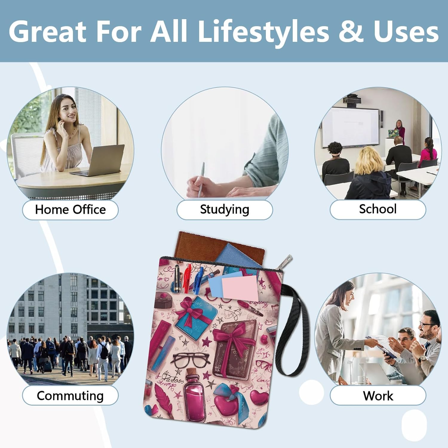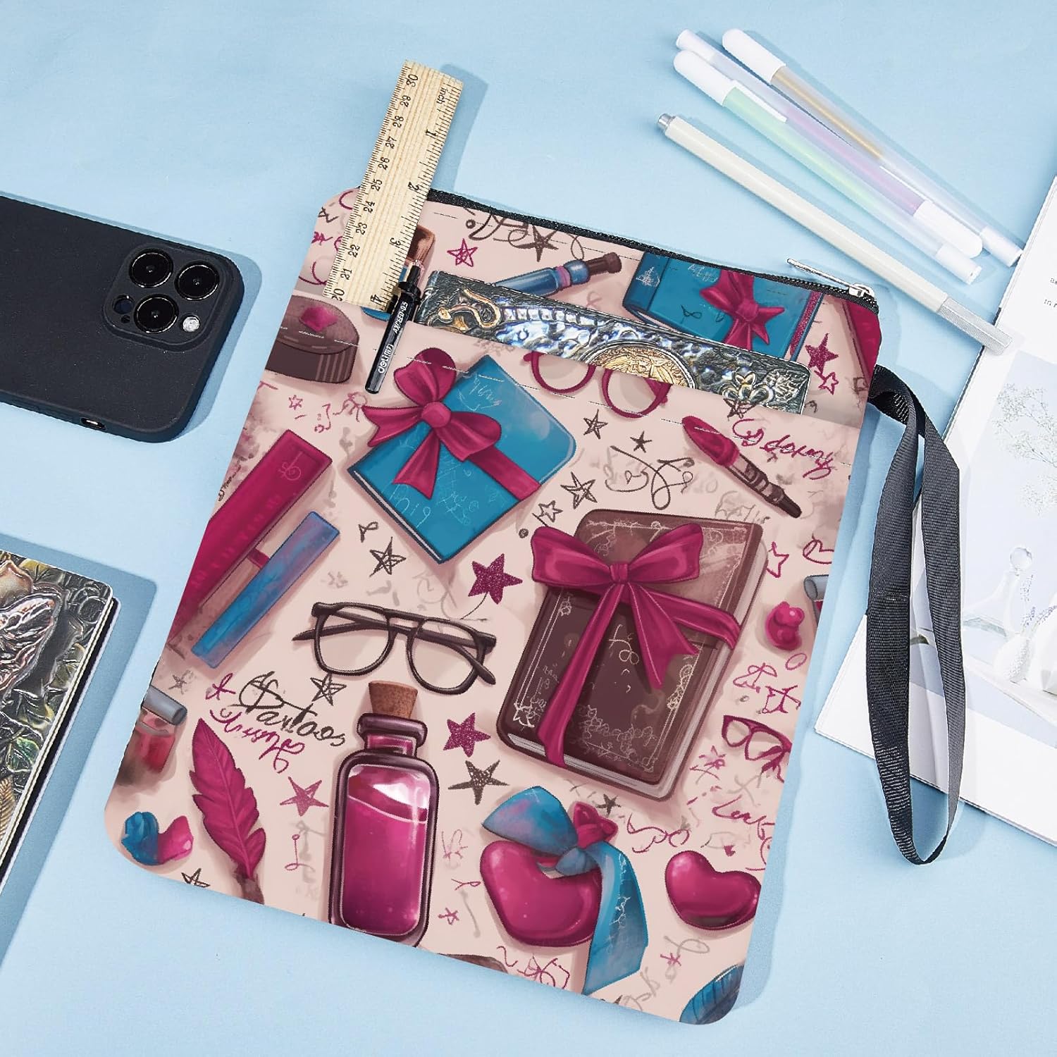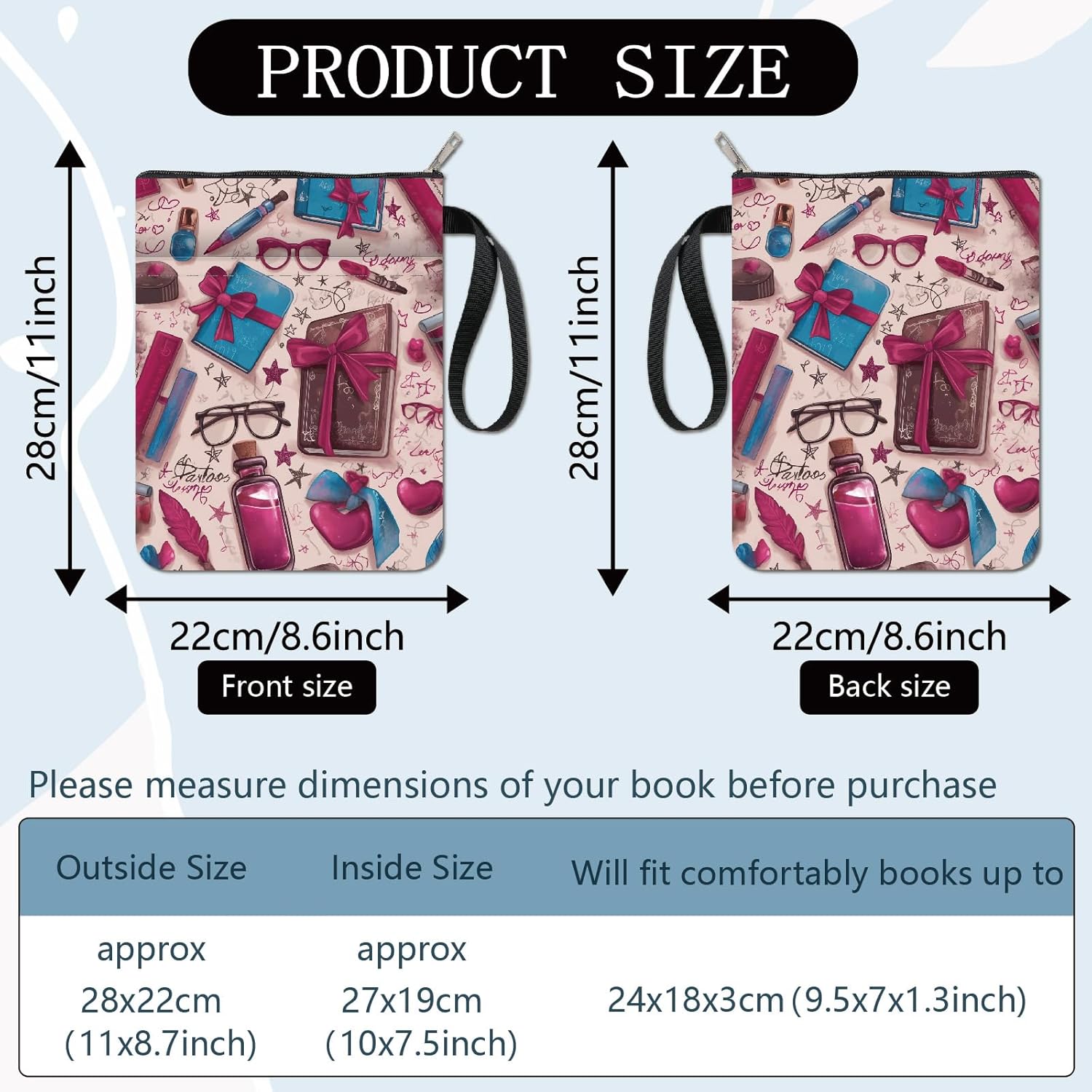 Copertina del libro in vetro fronte-retro: la copertina del libro ha una cerniera liscia e una corda portatile. Vetro, libro e penna sono stampati su entrambi i lati. Copertina del libro impermeabile con motivo chiaramente stampato: la copertina del libro è realizzata in tessuto impermeabile, protegge i libri da polvere e acqua e la copertina dagli strappi. Custodia per libri riutilizzabile per il lavaggio. Dimensioni: esterno circa 28 x 22 cm (11 x 8,7 pollici). Interno circa 10 x 7,5 pollici (27 x 19 cm). Adatto a libri fino a 24 x 18 x 3 cm (9,5 x 7 x 1,3 pollici). Assicurati di misurare i libri prima di acquistare la protezione del libro con tasca extra: la parte anteriore della copertina del libro è progettata con una piccola tasca, penna, cellulare, auricolare, occhiali da sole, chiavi e piccoli oggetti possono essere messi in tasca, per mantenere le cose organizzate. Ottimo regalo: la copertina del libro è un regalo ideale per gli amanti dei libri, amici, sorelle, insegnanti, infermiere, avvocati, medici, colleghi. Anche una buona scelta per matrimoni durante la festa della mamma, anniversari, lauree, feste, anniversari, regali di ringraziamento, libri con copertina rigida, libri tascabili, libri morbidi, libri di francobolli, romanzi e così via. Quando sono fuori, puoi mettere i tuoi libri o quaderni preferiti nello scaffale per libri, rendendo le cose facili da trasportare