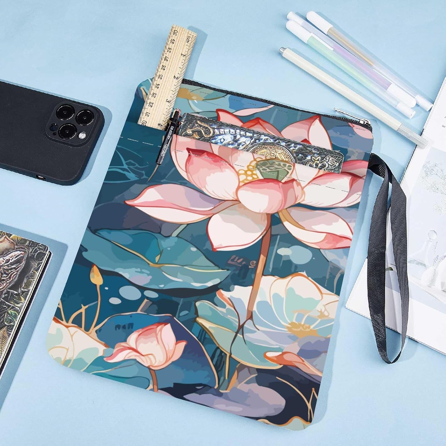 CUSTODIA PER LIBRI LOTUS:la copertina del libro ha un motivo elegante e innovativo, che protegge il tuo libro dalla polvere o dalle pagine strappate e piegate, ed è anche un regalo perfetto per gli amanti dei libri. DIMENSIONE:copertina del libro larga circa 8.66 pollice (22cm )., 11.02 pollice (28cm ) di lunghezza. Si adatta alla maggior parte dei libri autopubblicati, tascabili standard, tascabili di massa, e copertine rigide regolari. Assicurati di misurare il tuo articolo prima dell'acquisto per assicurarti che funzioni per te. TESSUTO LAVABILE:Realizzato in tessuto lavabile, la fodera nera è resistente allo sporco e presenta una chiusura con cerniera liscia di alta qualità per una maggiore protezione. Sottile e leggero, non ingombra il tuo libro, può facilmente scivolare nella tua valigetta, zaino o altra borsa. TASCA EXTRA SULLA MANICA:questa copertina del libro non può contenere solo libri, la tasca extra sulla manica può contenere anche penne, occhiali, segnalibri, bloc notes, cuffie e altri accessori, pratico e bello in uno. AMPIO UTILIZZO:queste custodie per libri possono essere utilizzate per proteggere i libri, libri di testo o quaderni ed è adatto agli studenti, insegnanti, scrittori, studiosi, librerie o chiunque ami i libri o voglia distinguerli facilmente.