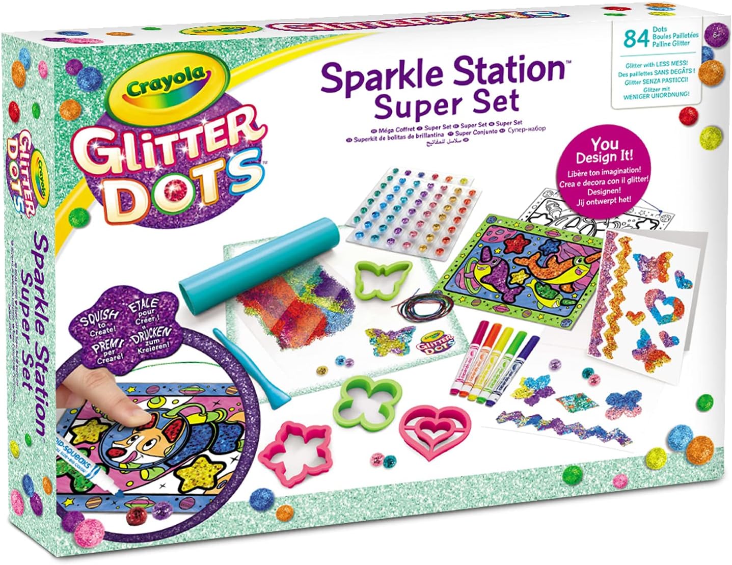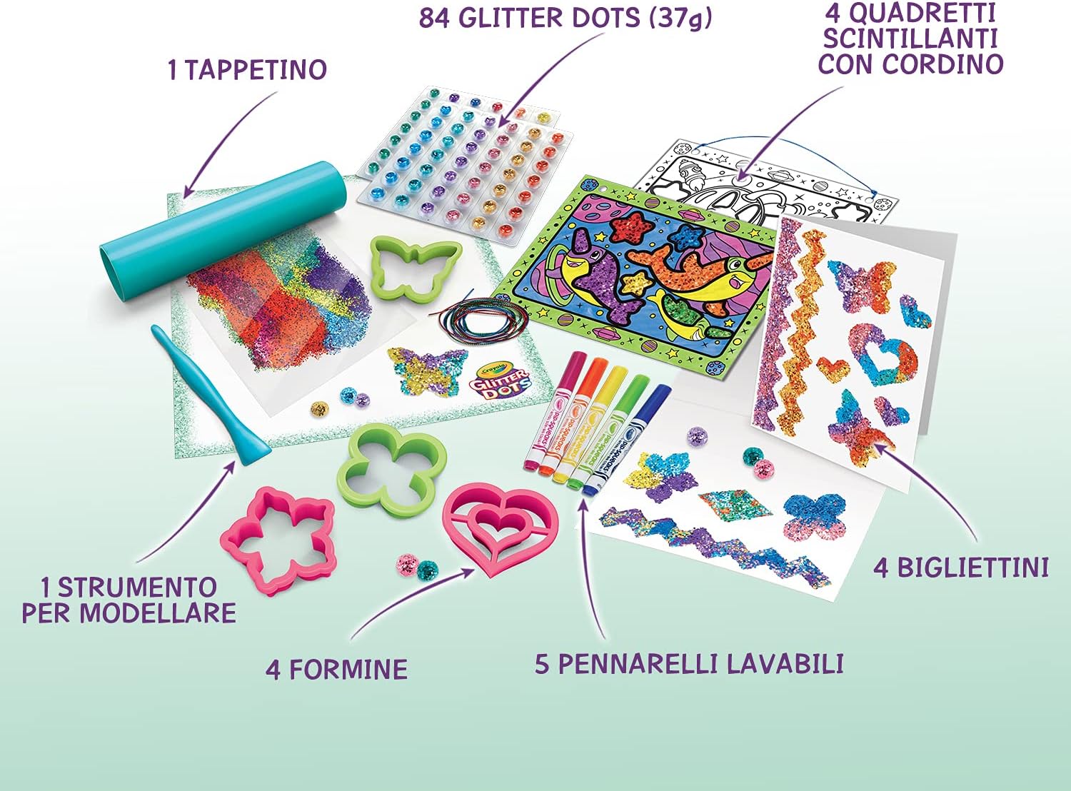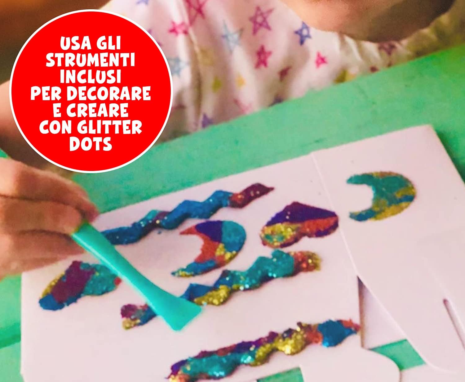 I GLITTER DOTS sono perline da 10 mm realizzate con un materiale malleabile e completamente scintillante. PREMI CON LE DITA E INIZIA A CREARE: si modella facilmente con le dita e si applica su varie superfici (carta, cartone, legno, vetro). SCATENA LA TUA CREATIVITÀ: contiene tutto il necessario per creare decorazioni scintillanti con i punti glitter e gli strumenti per modellare inclusi. Cartoncini, cartelli e quadrati da colorare e appendere, progetti scolastici e tanto altro. LUNGA DURATA: La chiusura sigillata di ogni punto glitter impedisce al materiale di seccarsi. SICURO E ATOSSICO: pensato per bambini e bambine dai 6 anni in su