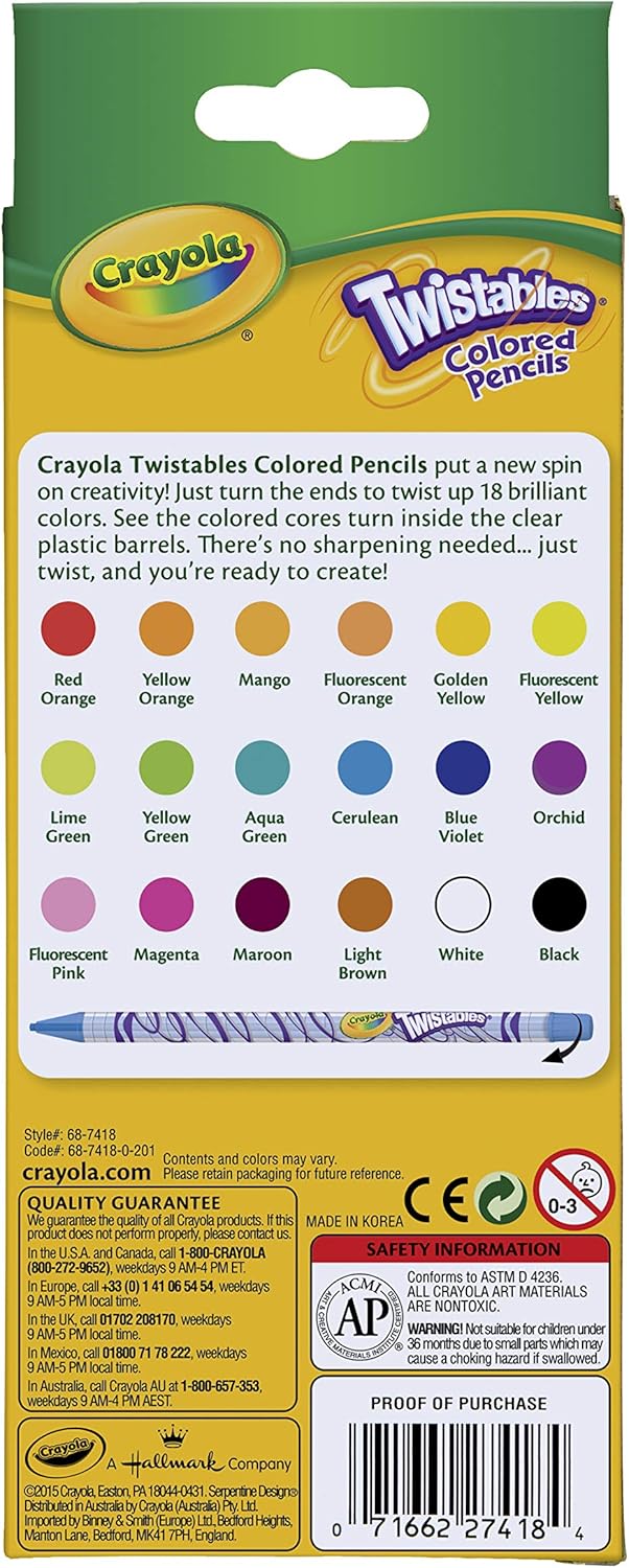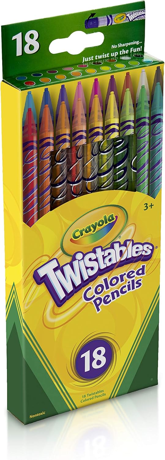Design a spirale per non affilare: estendi facilmente la punta della matita ruotandola, senza bisogno di un temperamatite. 18 tonalità assortite per una creatività versatile: offre una vasta gamma di colori per disegnare, delineare o sfumare. La canna resistente protegge il nucleo: progettato per resistere all'uso regolare e aiutare a ridurre la rottura. Pulito e facile da usare: i twistables aiutano a mantenere le mani pulite e le aree artistiche in ordine durante il tempo creativo. Perfetto per casa, scuola o viaggio: un'opzione compatta e pronta all'uso per colorare ovunque l'ispirazione colpisca.
