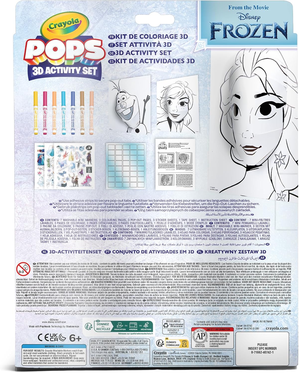 CRAYOLA POPS, IL NUOVO MODO DI COLORARE: le pagine da colorare diventano 3D! COLORA, COSTRUISCI, MOSTRA! ENTRA NEL MAGICO MONDO DI FROZEN: nella confezione troverai Elsa, Anna e Olaf da colorare e trasformare in personaggi tridimensionali super realistici! FACILE E DIVERTENTE: basta colorare lo sfondo e il cartoncino con i pennarelli inclusi, staccare la parte pretagliata inserendo le linguette negli appositi spazi e… POP! Il personaggio diventa 3D ed emerge dalla pagina! MOSTRA LA TUA ARTE: appendi le tue creazioni 3D in cameretta e mostra il sorprendente risultato. Aggiungi gli adesivi per rendere i disegni ancora più particolari e creativi PRATICA CONFEZIONE RICHIUDIBILE che permette di portare tutto il necessario con sé: 3 cartoncini di sfondo 25 x 21,6 cm, 3 cartoncini POP 3D, 7 pennarelli lavabili, 3 fogli di adesivi, Nastro adesivo