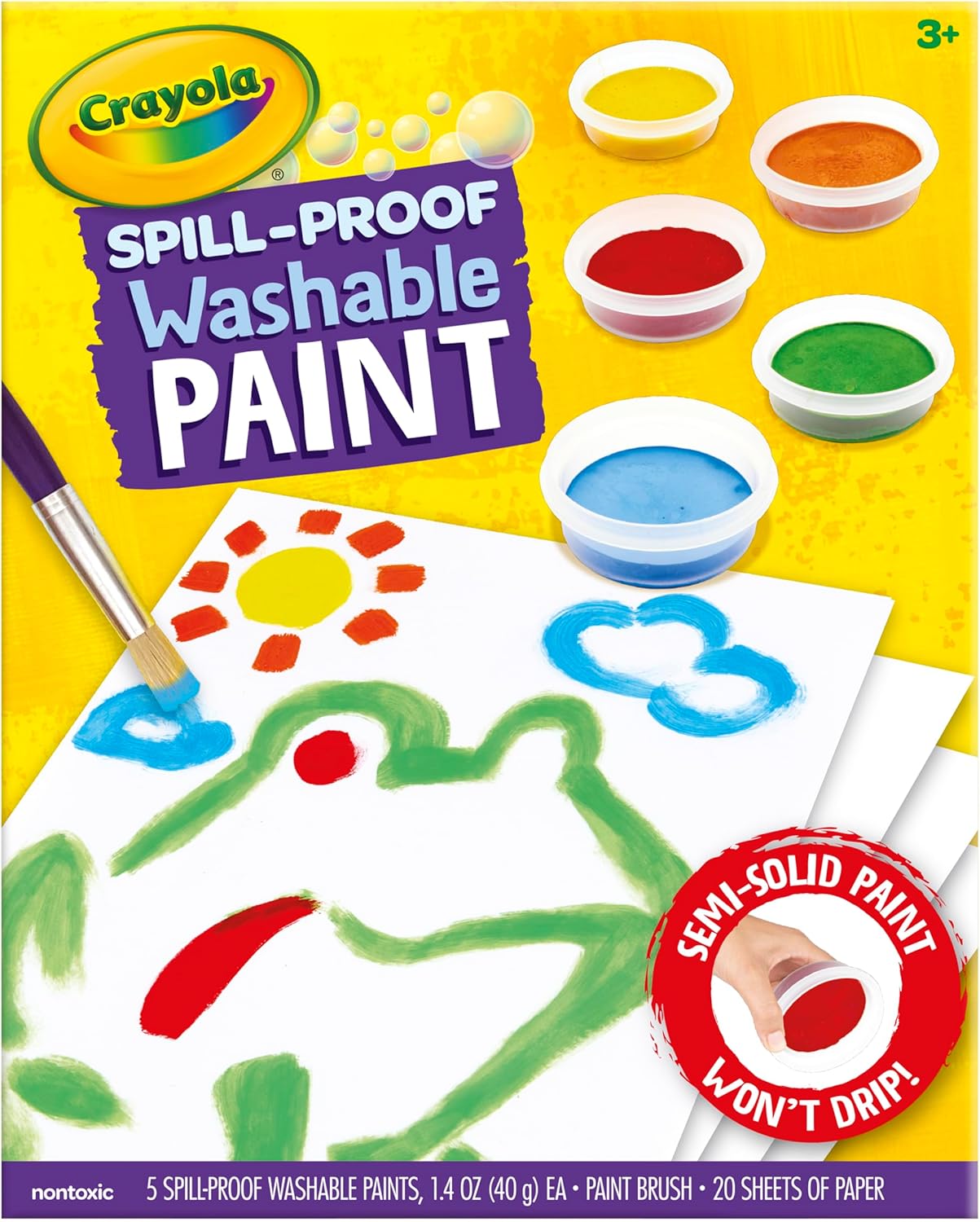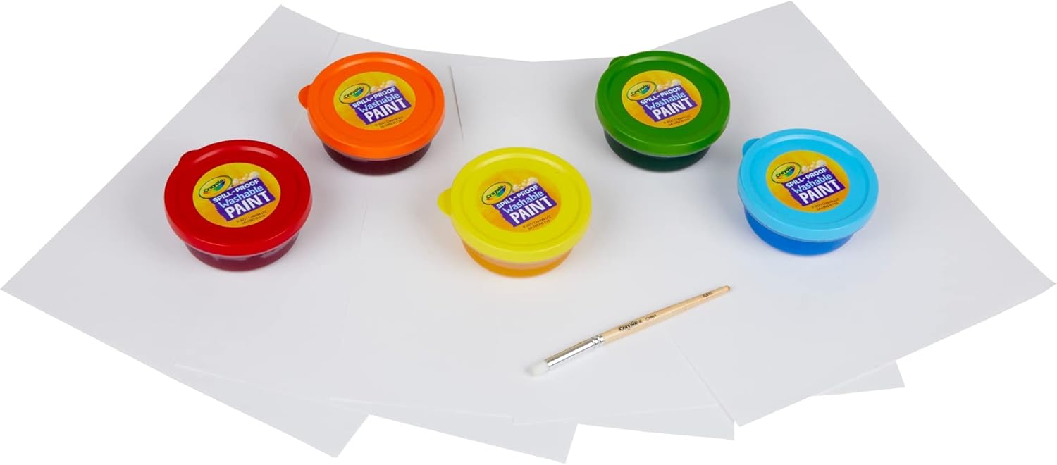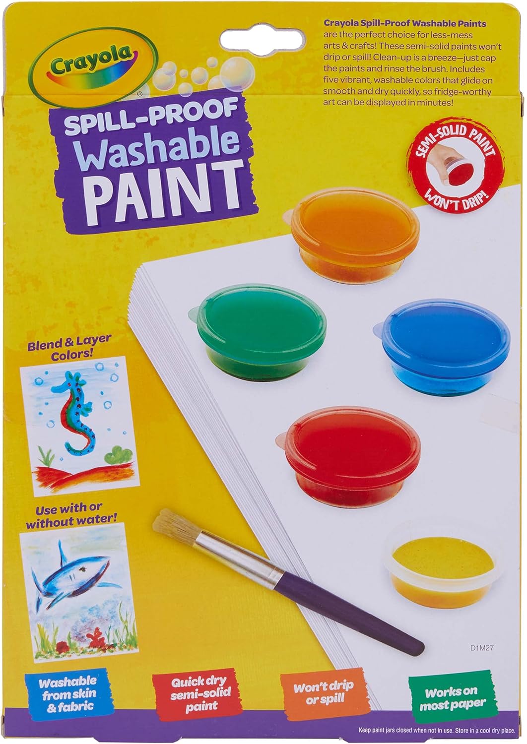 Set di vernici per bambini: dispone di 5 vernici lavabili a prova di fuoriuscite in barattoli riutilizzabili, 1 pennello, 20 fogli di carta e 1 foglio di istruzioni. Forniture artistiche a prova di fuoriuscita: le vernici semi-solide impediscono fuoriuscite, gocce e disordine. Le vernici meno disordinate sono ideali per artisti in erba e richiedono poca installazione o pulizia. Vernice lavabile: le vernici lavabili CRAYOLA si lavano dalla pelle e dalla maggior parte dei vestiti lavabili. CRAYOLA Colori: questi vivaci colori CRAYOLA funzionano sulla maggior parte della carta e si asciugano rapidamente per evitare sbavature. Sicuro e non tossico: vernice sicura e atossica per bambini dai 3 anni in su