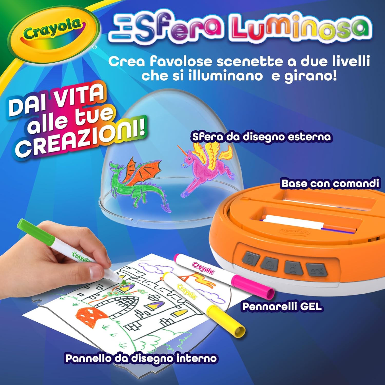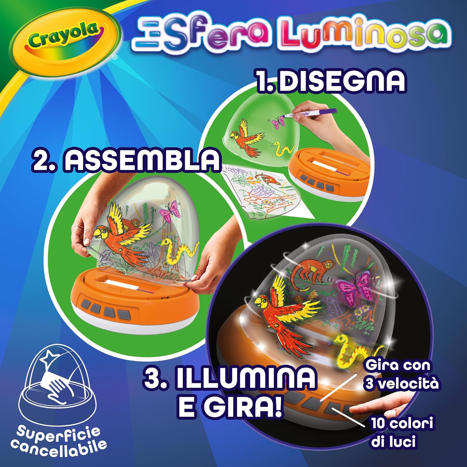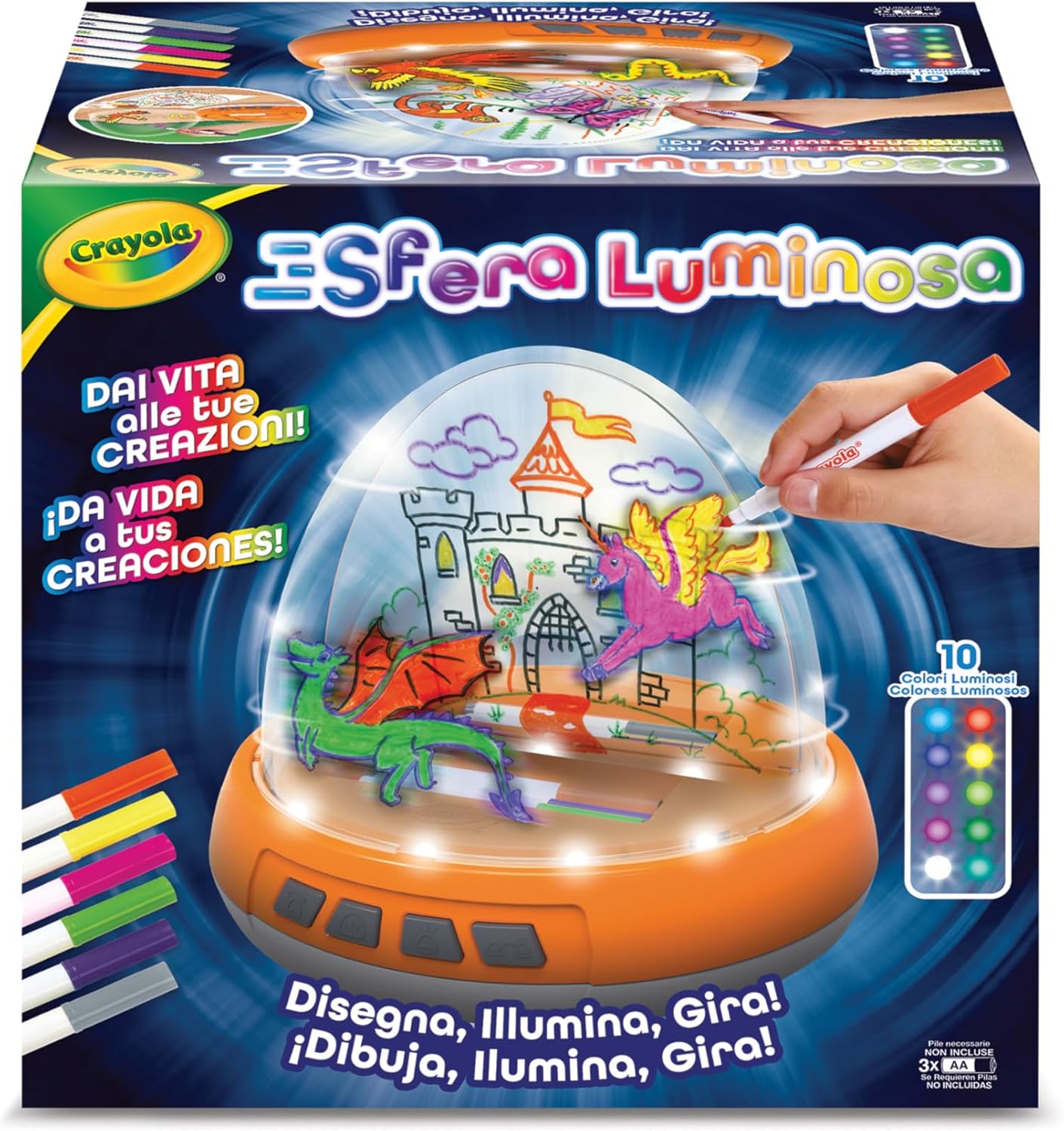 LA FANTASIA SI ACCENDE in un'esplosione di colori per creare favolosi disegni che si illuminano e girano! Disegna sulla cupola e sul pannello interno per creare effetti straordinari a due livelli. Tre diverse velocità di rotazione e dieci colori diversi con tante modalità di illuminazione DISEGNA, ILLUMINA, GIRA: per un gioco con così tante possibilità, è incredibile quanto sia facile iniziare! Una volta installate le batterie, la base della cupola luminosa è pronta per essere utilizzata con l'aggiunta del pannello interno e della cupola esterna, che scorrono in posizione FACILE, CREATIVO, DIVERTENTE: I bambini possono disegnare a mano libera con i pennarelli gel e poi spegnere la luce! Premendo il pulsante, la cupola ruota a tre velocità distinte: lenta, media o veloce. Spostando il cursore della funzione luce, si può illuminare il pannello interno, la cupola esterna, entrambi o un mix creando l'illusione di un'animazione con luci lampeggianti FACILE MANUTENZIONE: Le due superfici da disegno si puliscono con un po' d'acqua e un panno per creare e ricreare all'infinito. Una volta terminato, i bambini possono riporre i pennarelli nei due scomparti della base luminosa OTTIMA IDEA REGALO PER BAMBINI E BAMBINE DAI 7 ANNI: per compleanno, festività e qualsiasi tipo di occasione questo set sarà un gradito regalo. Funziona con 3 pile AA (non incluse)