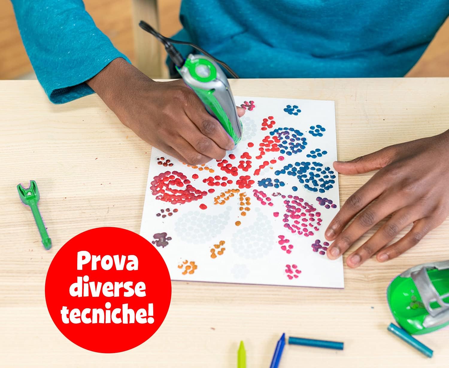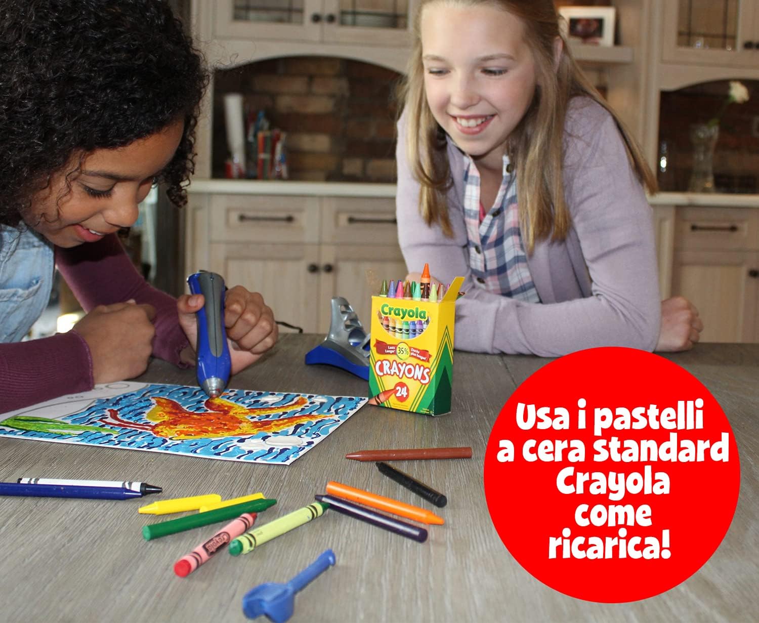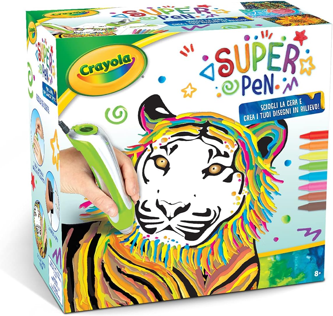 CRAYOLA SUPER PEN: la penna magica che permette di sciogliere i pastelli a cera per creare disegni in rilievo, dona a tutte le tue opere d’arte un effetto testurizzato e trasforma i tuoi disegni in veri e propri quadri impressionisti CREA IN TUTTA SICUREZZA: la Super Pen è completamente sicura per i bambini di età superiore agli 8 anni, poiché la sua punta non scotta e mantiene una bassa temperatura costante che permette un’erogazione continua della cera, così puoi creare evitando scottature; inoltre la cera si asciuga immediatamente quando viene a contatto con la superficie CREATIVITA’ SENZA LIMITI: facilissima da usare, devi solo inserire i tuoi pastelli Crayola (senza l'involucro), collegare il dispositivo e attendere che la luce diventi verde per iniziare a creare i tuoi disegni; la cera fusa permette di scrivere, colorare, decorare e disegnare su ogni tipo di superficie (cartone, vetro, legno, ceramica, tela...) con una finitura goffrata unica REGALO CREATIVO: ottimo come regalo di compleanno o altre occasioni speciali, per bambini e bambine a partire da 8 anni INFORMAZIONI UTILI: include 1 Super Pen con base d’appoggio e adattatore, 8 pastelli a cera Crayola, 1 strumento multifunzione, 3 fogli guida 20x25 cm; pericolo di soffocamento - contiene piccole parti; da usare solo con pastelli a cera Crayola