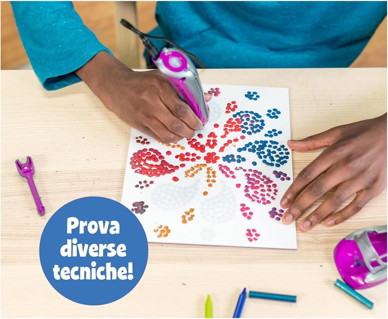 CRAYOLA SUPER PEN: la penna magica che permette di sciogliere i pastelli a cera per creare disegni in rilievo CREA IN TUTTA SICUREZZA: la punta non scotta e mantiene una bassa temperatura costante che permette un’erogazione continua della cera, inoltre la cera si asciuga velocemente quando viene a contatto con la superficie CREATIVITA’ SENZA LIMITI: facilissima da usare, basta solo inserire i tuoi pastelli Crayola (senza l'involucro), collegare il dispositivo e attendere che la luce diventi verde per iniziare a creare i tuoi disegni; la cera fusa permette di scrivere, colorare, decorare e disegnare su ogni tipo di superficie (cartone, vetro, legno, ceramica, tela...) REGALO CREATIVO: ottimo come regalo di compleanno o altre occasioni speciali, per bambini e bambine a partire da 8 anni INFORMAZIONI UTILI: include 1 Super Pen con base d’appoggio e adattatore, 8 pastelli a cera Crayola, 1 strumento multifunzione, 3 fogli guida 20x25 cm; pericolo di soffocamento - contiene piccole parti; da usare solo con pastelli a cera Crayola