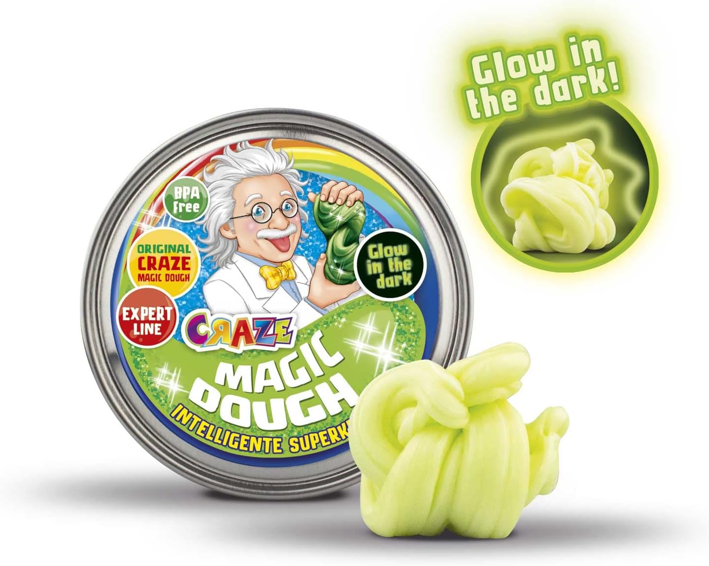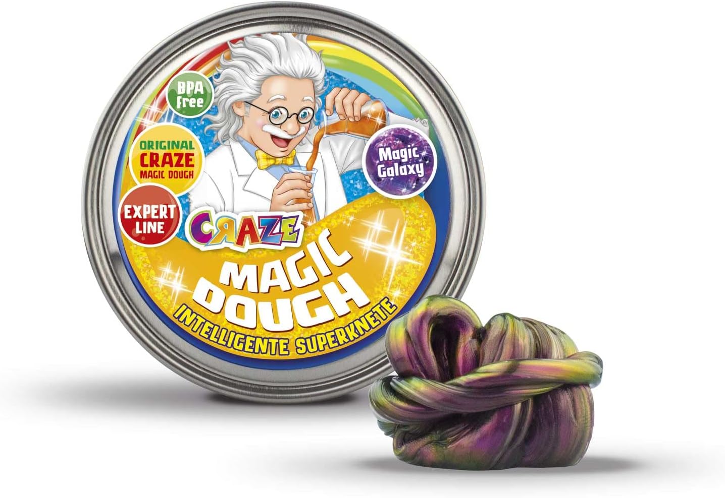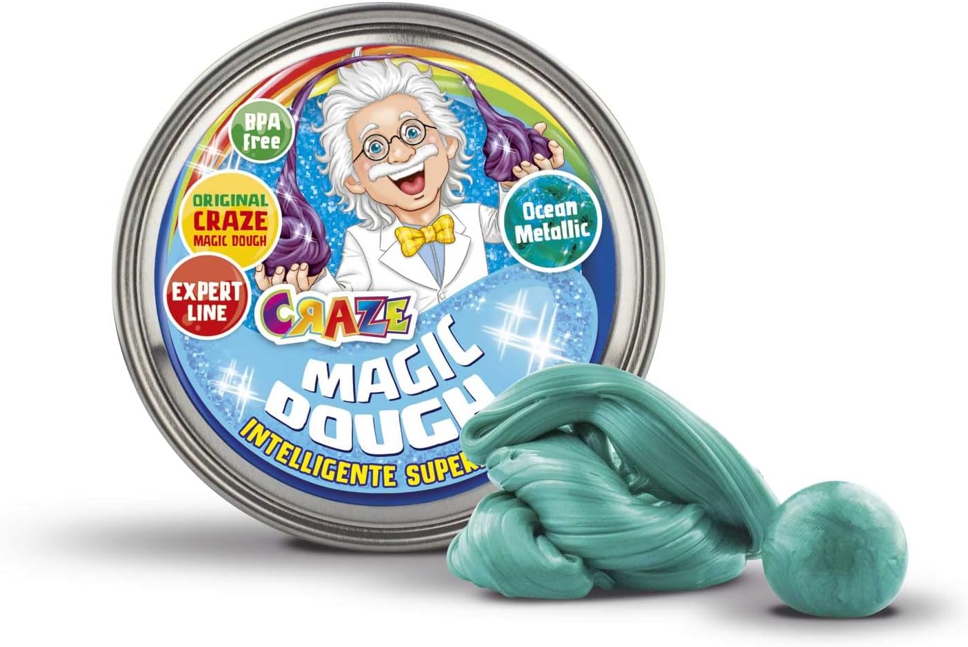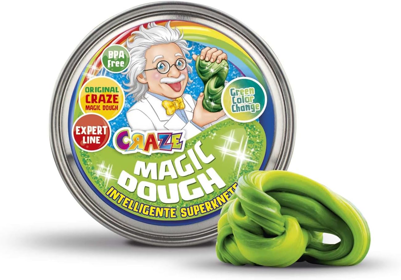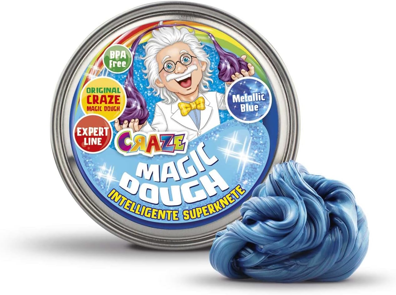 Attività manuali per bambini: la pasta da modellare CRAZE MAGIC DOUGH è la nuova tendenza degli hobby creativi! Smart Dough è estremamente elastico, molto facile da modellare e rimbalza come una palla di gomma! La magica argilla da modellare di CRAZE non solo può essere impastata e modellata, ma anche tagliata e strappata. Lo stucco rimane flessibile e non si secca. Il Professore Esperto CRAZE MAGIC DOUGH, per tutti i giovani esperti di pasta da modellare! Lo stucco è disponibile in 6 straordinari effetti speciali: Blu metallizzato, Fluorescente, Magic Galaxy o Bicolore Verde, Rosso Lava e Oceano Metallico. Preselezione non possibile. Lasciati sorprendere e colleziona tutte le varianti! CRAZE Pasta da gioco per bambini di altissima qualità: la pasta Smart originale è prodotta secondo una formula tedesca, senza tossine o ingredienti dannosi per i bambini. Sicuro da usare e garantito senza BPA e glutine. Puoi portare la tua scatola di accessori per pasta da modellare ovunque con te: in ufficio, al ristorante, a un incontro con gli amici. È anche un grande hobby per la casa. Contenuto: circa 70 g di pasta da modellare in una pratica e colorata scatola. Per un gioco creativo: incoraggia la creatività dei tuoi piccoli con l'argilla da modellare! L'impasto intelligente promuove la coordinazione, le capacità motorie e l'immaginazione.