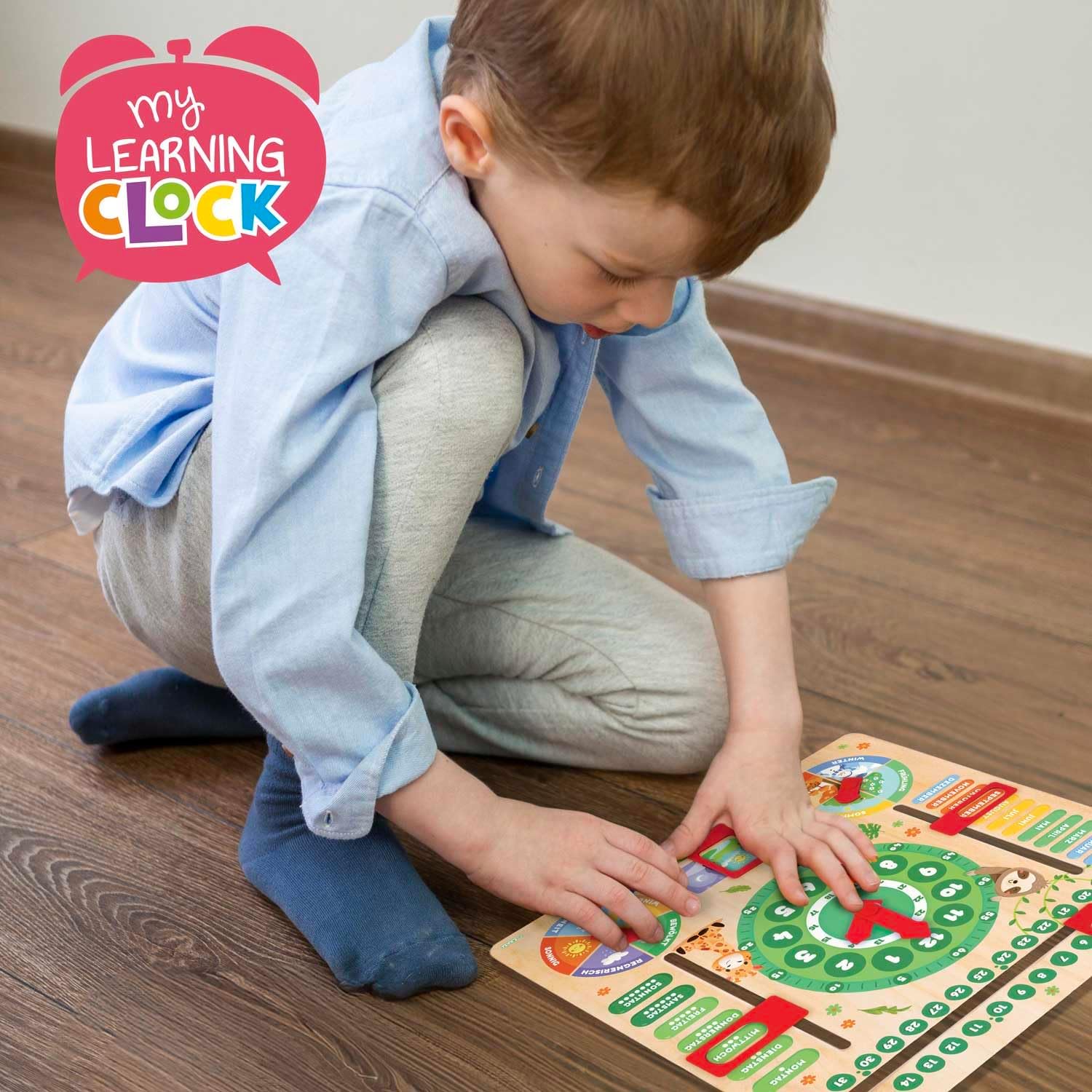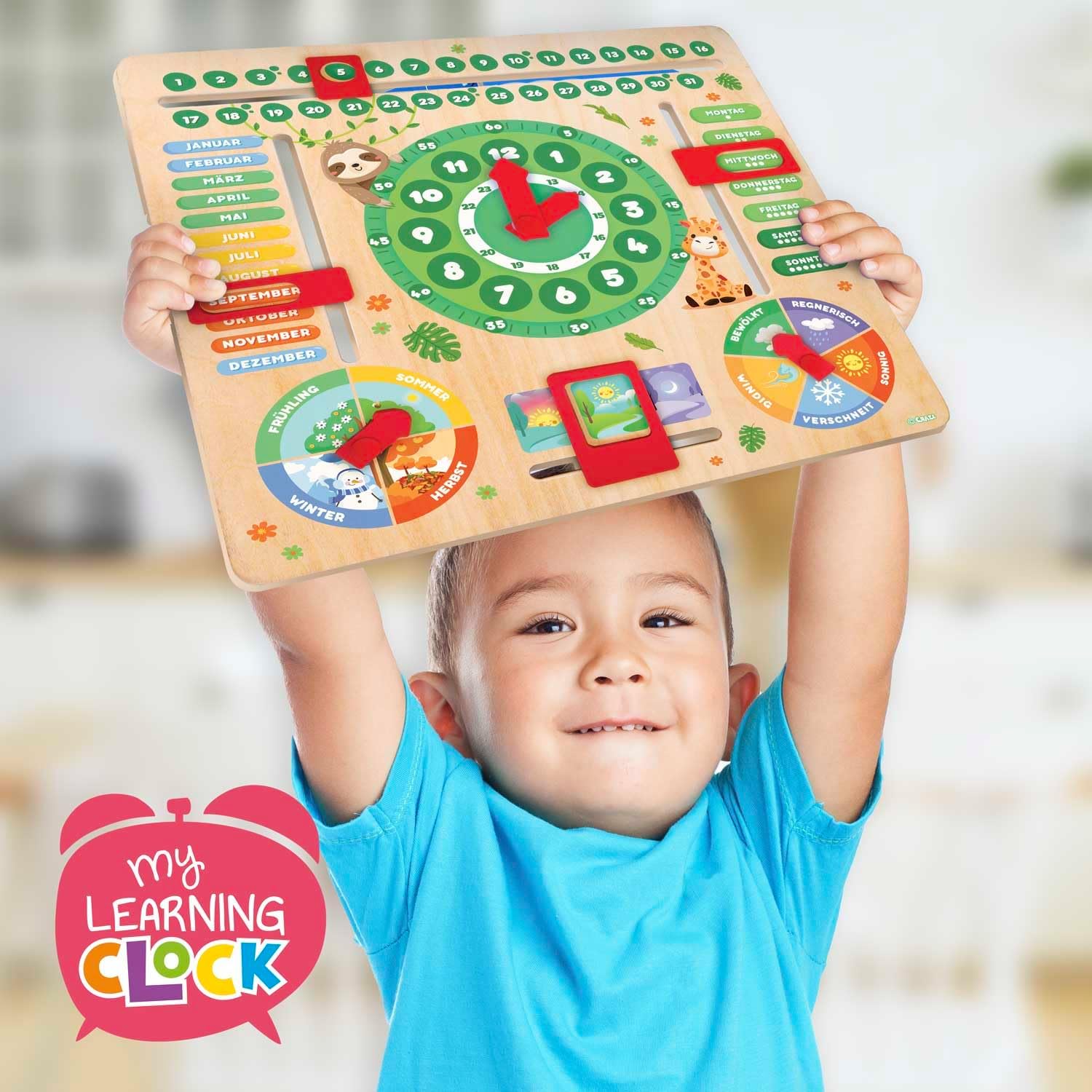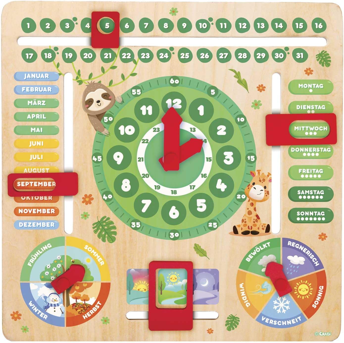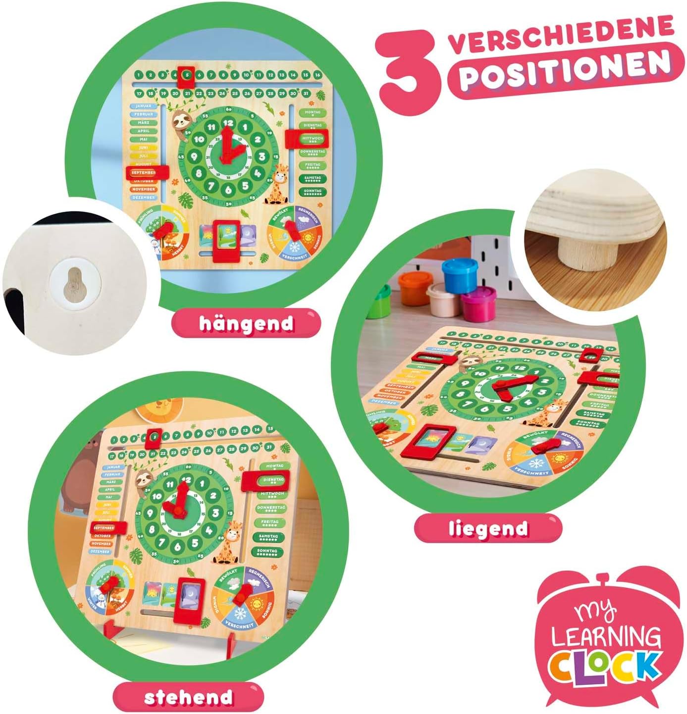 Orologio didattico (ore, giorni, stagioni, mesi, numeri). Realizzato in legno con supporto rimovibile. Tema DOLCI ANIMALI - Lingua tedesca Giocare insieme e imparare in modo creativo: Metodo di apprendimento rispettoso dei tempi in ore e minuti. I bambini possono imparare i concetti di tempo, giorni, date, mesi, tempo e stagioni in modo divertente. I quadranti dell'orologio didattico aiutano i bambini a capire presto come leggere l'ora. Piccole frecce e caselle permettono di cambiare l'ora, imparare i giorni del mese e della settimana, giocattoli per scoprire le stagioni, il tempo e gli orari della giornata. Collega i colori del mese con le stagioni. Impara i giorni della settimana (colore diverso per il fine settimana!) Simpatico tema degli animali: il simpatico design degli animali rende l'apprendimento più piacevole e cattura l'attenzione dei più piccoli - Impara con i piccoli animali! Tre modalità di utilizzo: freestanding (con base rimovibile), montato a parete o da tavolo