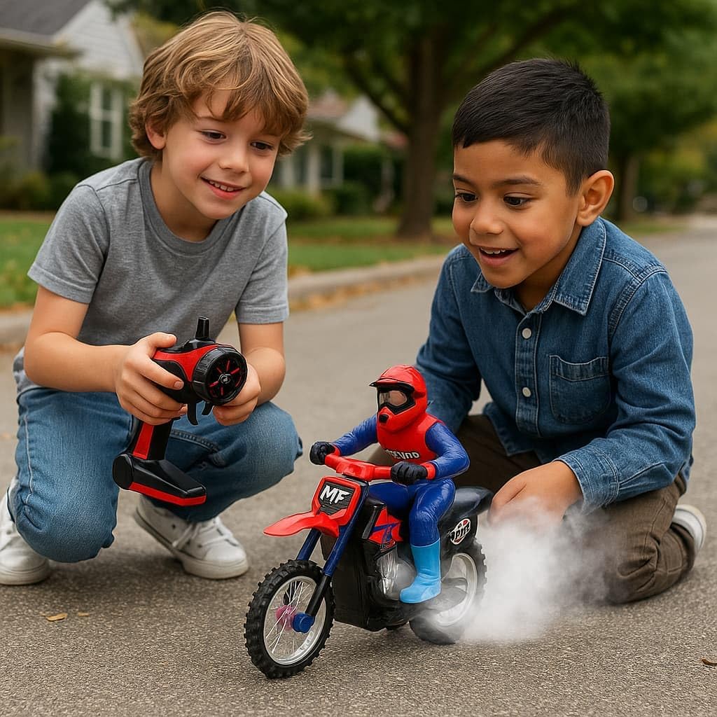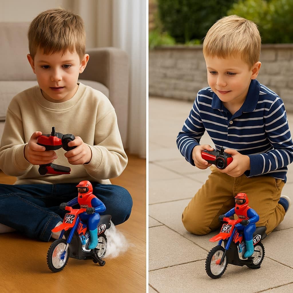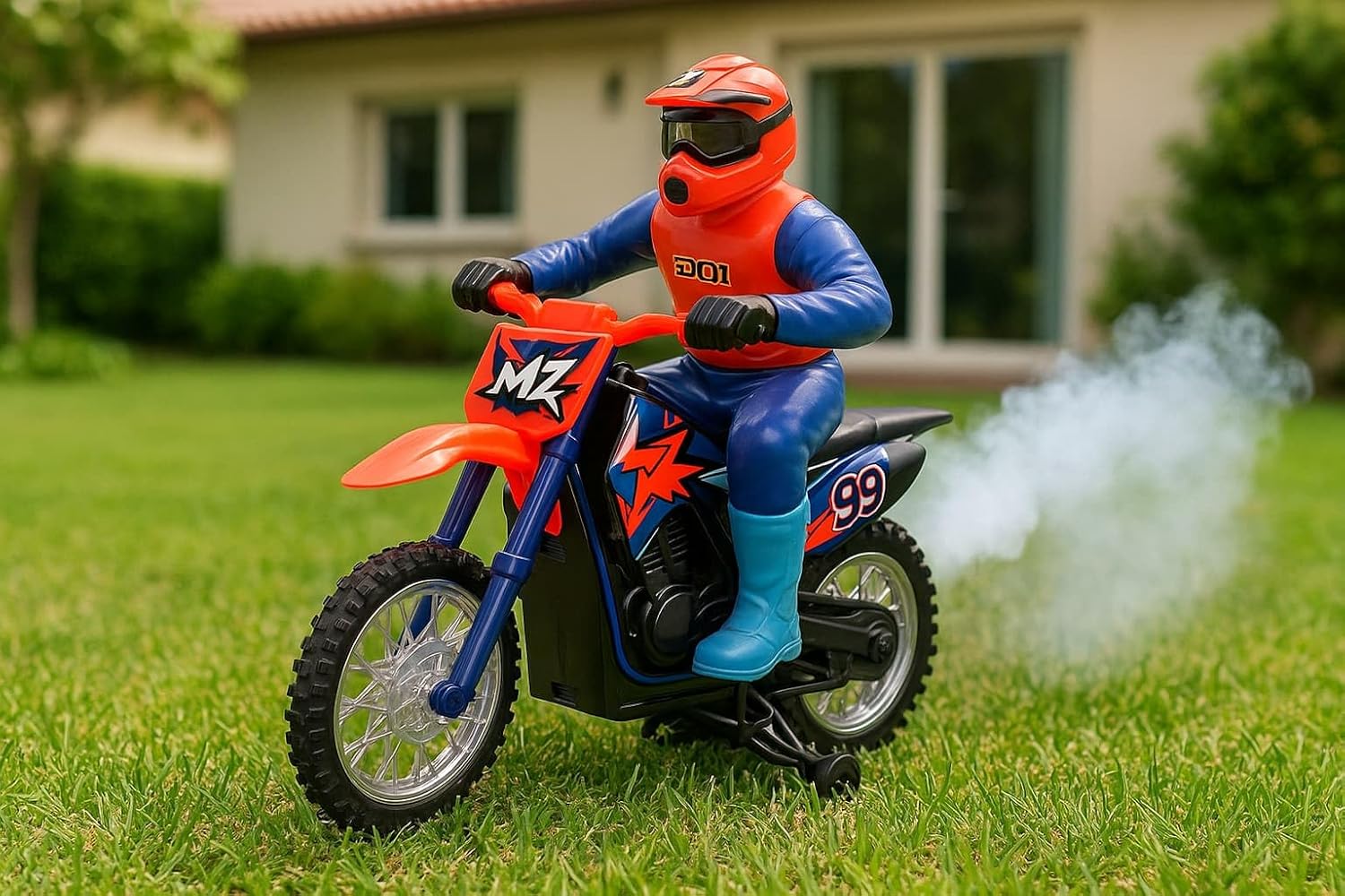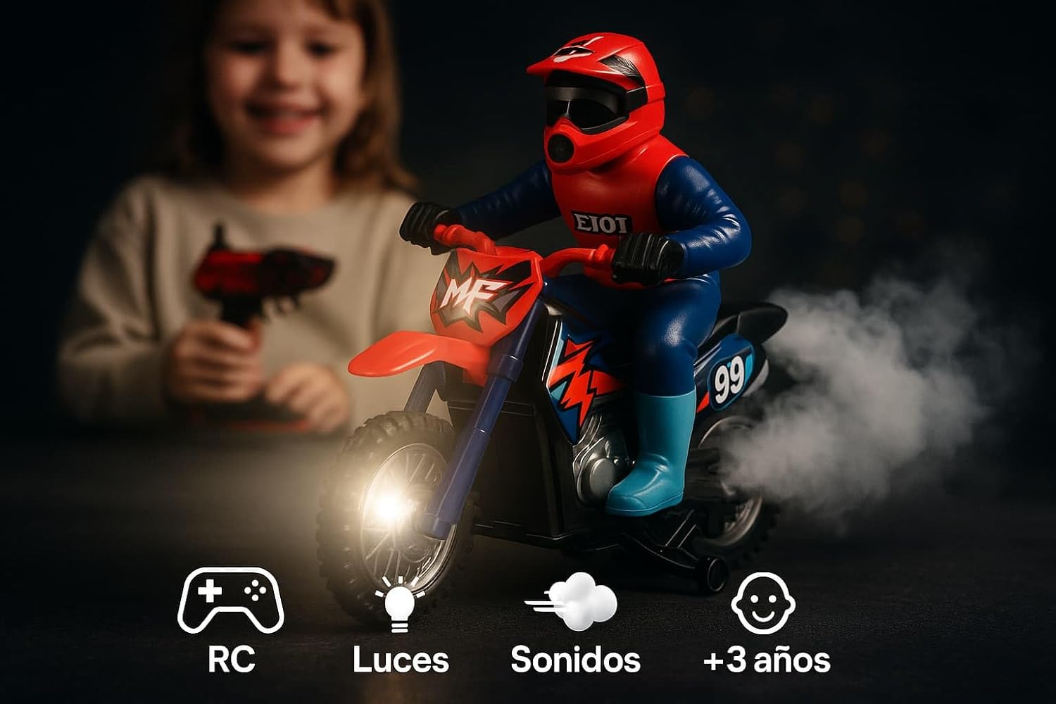 Motocicletta RC telecomandata con telecomando - Motocicletta giocattolo in scala 1/10 progettata per ragazzi e ragazze dai 3 anni in su. Facile da controllare grazie al radiocomando, ideale per far divertire i più piccoli con i loro primi veicoli telecomandati sviluppando la coordinazione e le capacità motorie. Luci, suoni ed effetto fumo realistico - Dotato di effetti accattivanti che simulano una vera moto: luci anteriori, suoni e un originale effetto fumo che stupisce i bambini. Questi dettagli aumentano il divertimento e creano un'esperienza di gioco molto più coinvolgente e divertente, perfetta per ore di divertimento a casa. Design per bambini sicuro e durevole: realizzata con materiali di alta qualità e bordi arrotondati, questa moto RC è progettata per un uso intensivo da parte dei più piccoli. La sua struttura robusta resiste agli urti e alle cadute, garantendo un giocattolo durevole, sicuro ed affidabile che accompagnerà i bambini in ogni momento di gioco. Scala 1/10 con dettagli realistici - Con grandi dimensioni e un design fedele a una vera moto, questa versione in miniatura promuove il gioco di ruolo, l'immaginazione e la creatività dei bambini. Perfetto per i bambini appassionati di veicoli, che possono provare a guidare la propria moto telecomandata dall'aspetto realistico. REGALO PERFETTO PER RAGAZZI E RAGAZZE: questo veicolo telecomandato è il regalo ideale per compleanni, Natale o occasioni speciali. Con la sua combinazione di luci, suoni ed effetti, offre ore di intrattenimento interattivo e incoraggia il divertimento della famiglia, rendendolo una scelta educativa e coinvolgente per i più piccoli.
