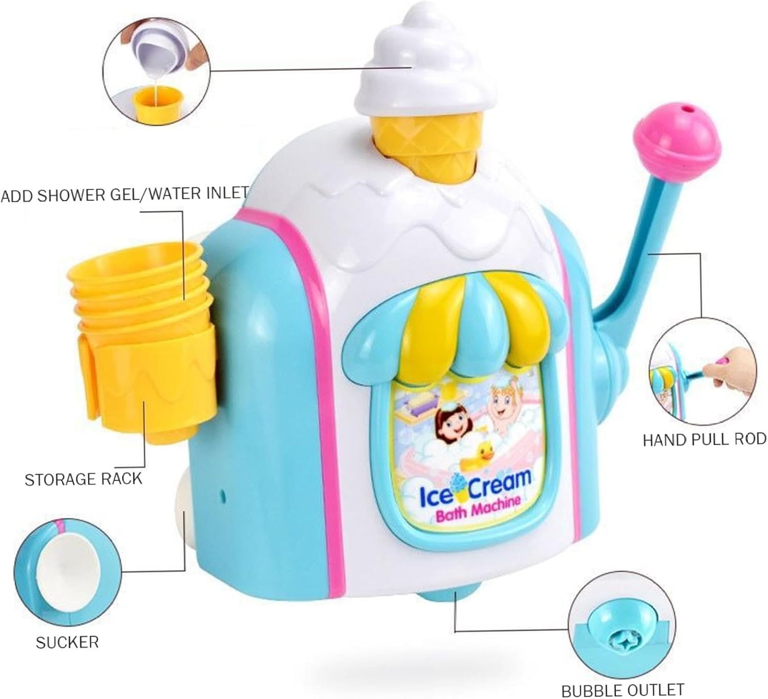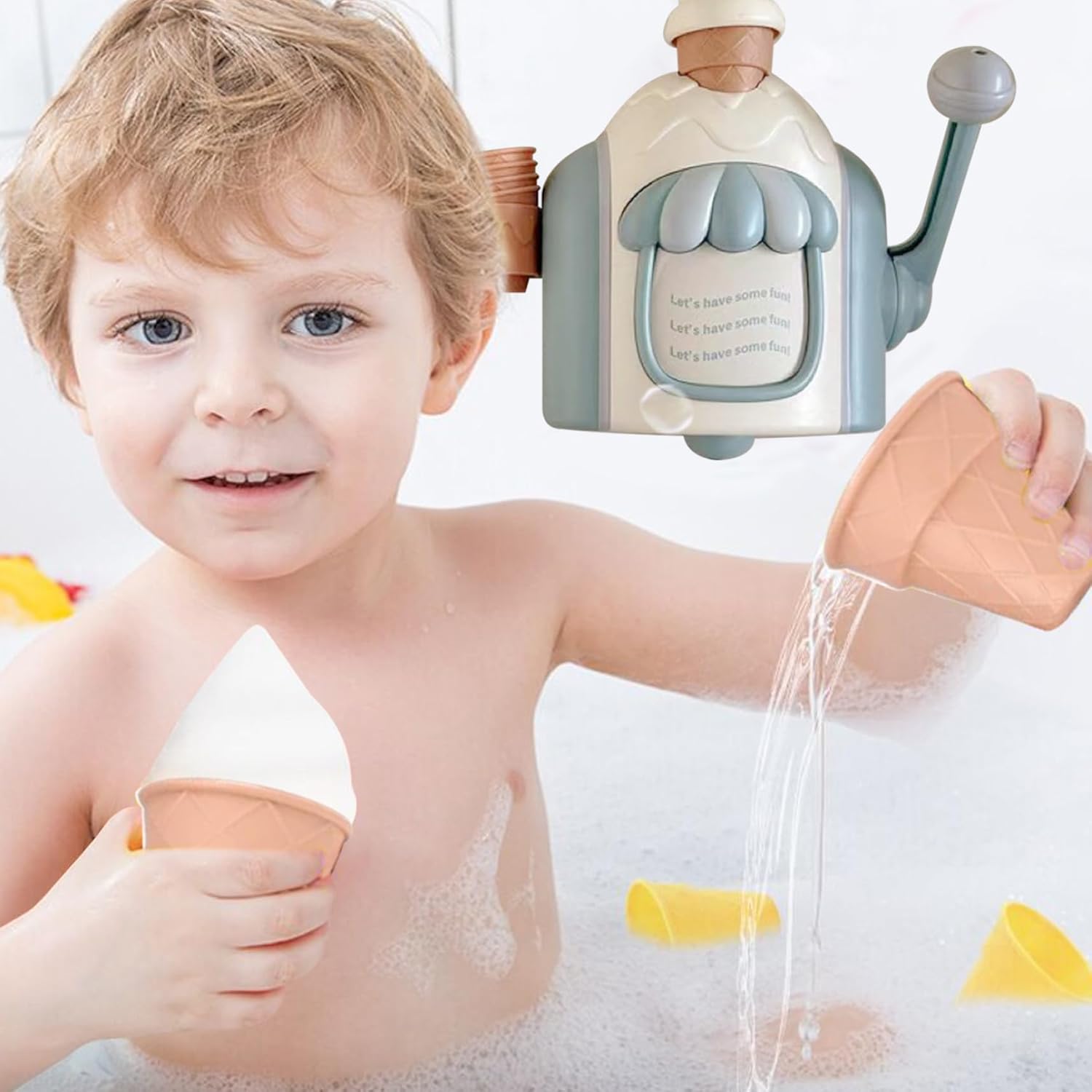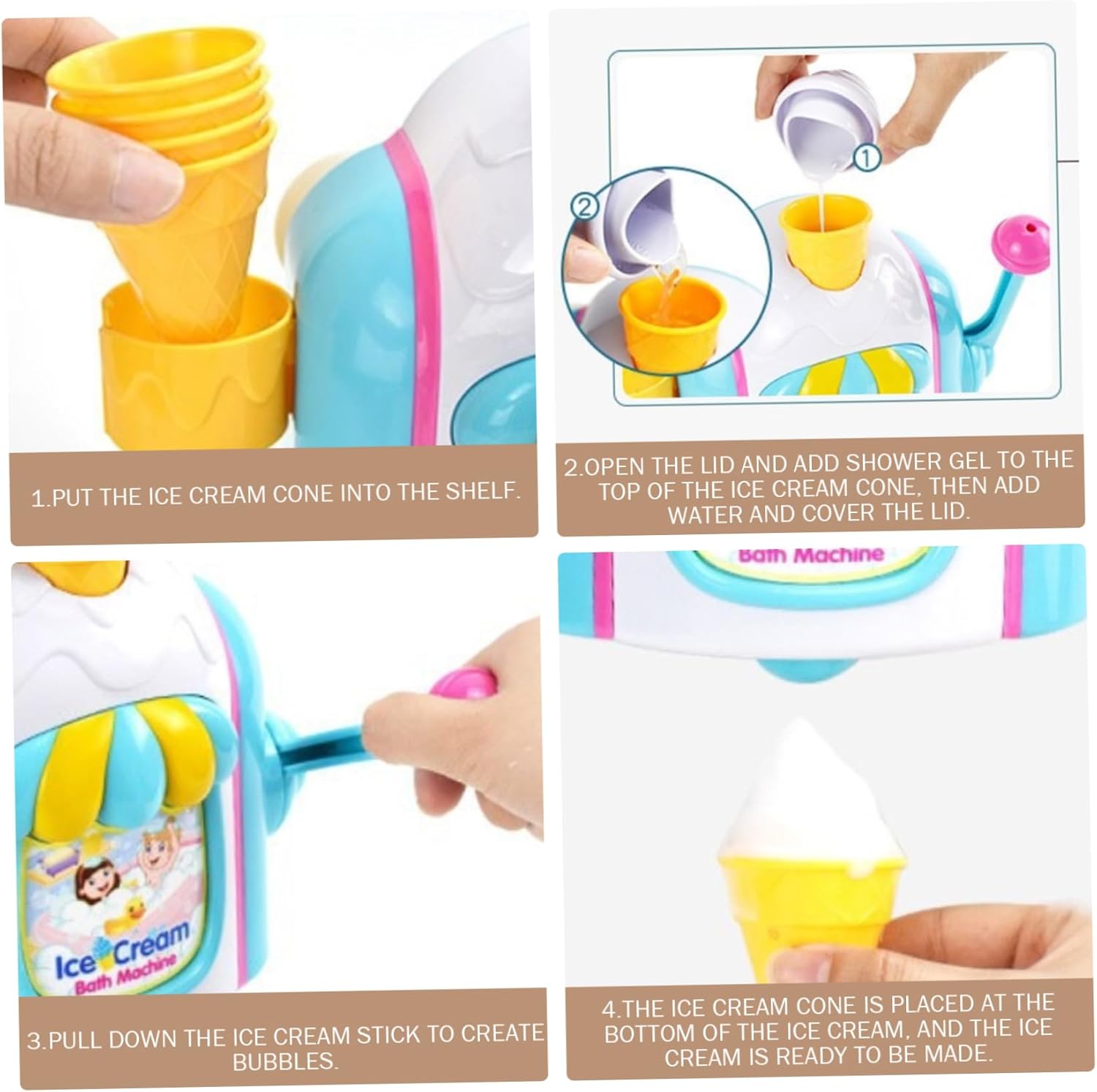 Gioco divertente e interattivo: il Bath Ice Cream Foam Maker trasforma il momento del bagno in un'esperienza deliziosa consentendo ai bambini di creare schiuma frizzante con una semplice pressione della leva, incoraggiando il gioco sensoriale fantasioso che rende il lavaggio dei piatti divertente per ragazzi e ragazze. Design sicuro e stabile: realizzato in plastica sicura per i bambini e priva di BPA, questo giocattolo per gelato è robusto e leggero, garantendo che resista al divertimento attivo del bagnetto senza rompersi o rappresentare pericoli per i bambini piccoli. Controllo della schiuma regolabile: personalizza facilmente la quantità di bolle prodotte premendo la leva a metà per una schiuma delicata o completamente per uno scoppio ricco di bolle, offrendo ai genitori il controllo sull'ambiente del bagno per soddisfare le preferenze e la sicurezza del loro bambino. Comodo portaoggetti a ventosa: dotato di potenti ventose e di un pratico portaoggetti, il creatore di bolle può essere fissato saldamente alla parete della vasca, mantenendo il giocattolo organizzato, a portata di mano e riducendo al minimo il disordine nel bagno. Set da gioco completo incluso: viene fornito con una macchina per il bagno del gelato e quattro coni gelato colorati che aggiungono un ulteriore livello di divertimento, consentendo ai bambini di mescolare e abbinare mentre migliorano il gioco di ruolo fantasioso e lo sviluppo sensoriale nell'acqua.
