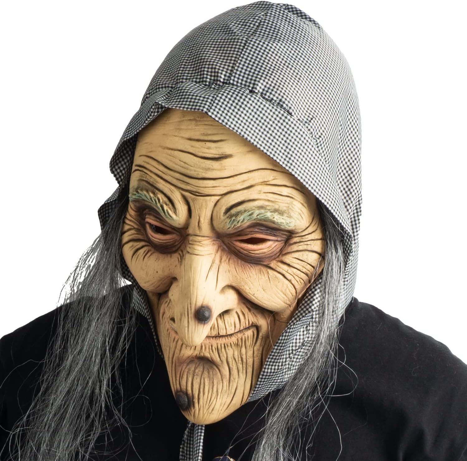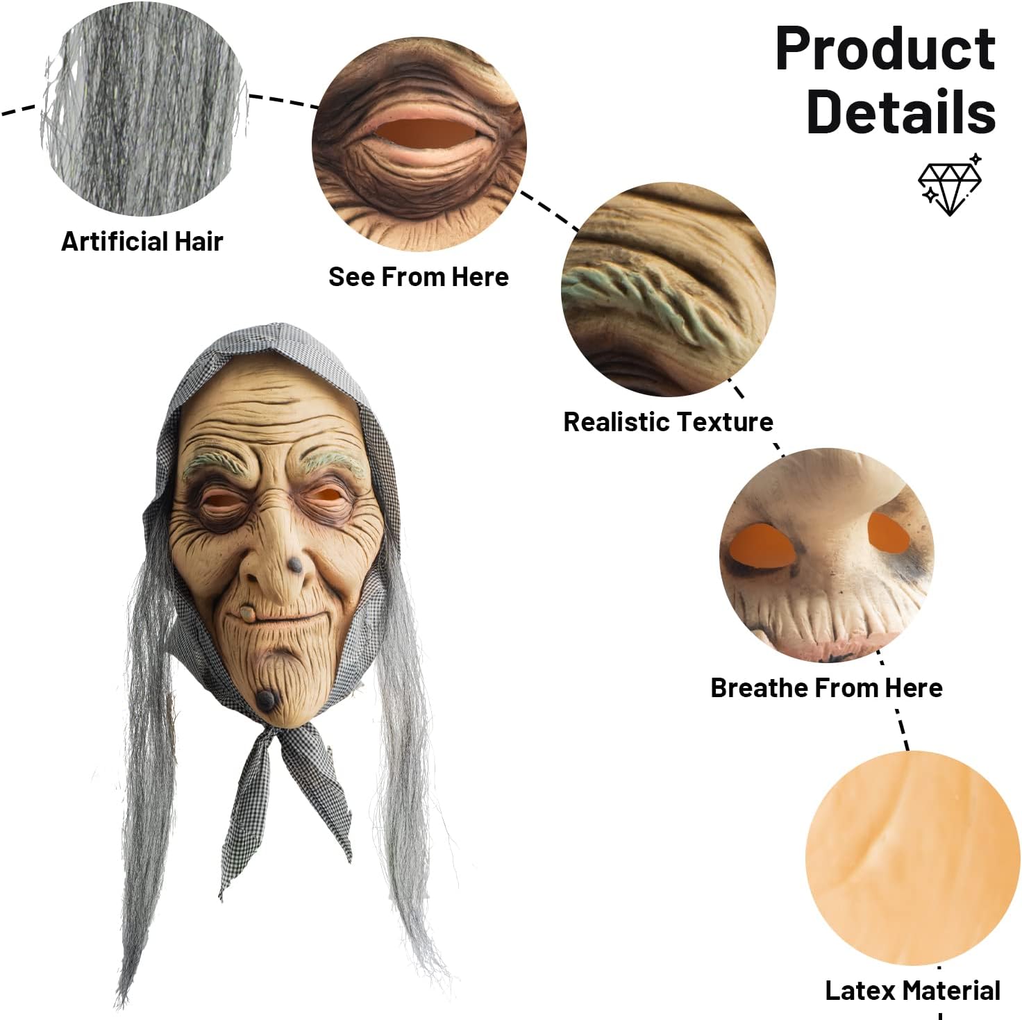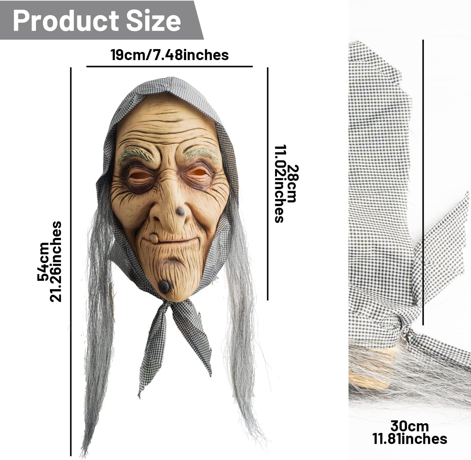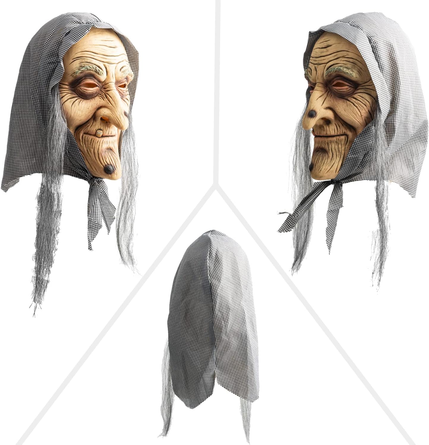 CreepyParty Vecchia Maschera da Strega con Capelli e Foulard Maschera in Lattice a Testa Piena Realistica Umana per la Festa in Costume di Carnevale Halloween