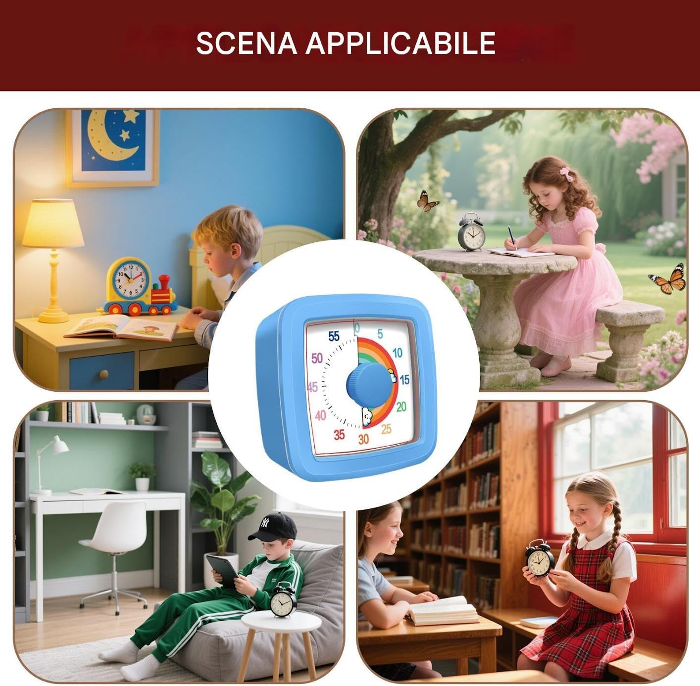 Compagno di Studio:Rimuove completamente il suono udibile del ticchettio, offrendo un ambiente silenzioso a 0 decibel per sessioni di apprendimento e permettendo ai bambini di concentrarsi più efficacemente Funzionamento Pratico: Offre operatività semplice grazie alla grande manopola e ai pulsanti grafici chiari, che semplificano accensione/spegnimento e regolazione del senza configurazioni complesse o supporto genitoriale continuo. 5. Monitoraggio Visivo del : Il timer visivo presenta un anello colorato di avanzamento e un display digitale, rendendo chiaramente visibile lo scorrere del . Incoraggia l'apprendimento autonomo e costruisce un ritmo per il completamento dei compiti, sviluppando una comprensione concreta del e integrando naturalmente le abilità di gestione nella routine quotidiana. Adatto a Più Scenari: per studio e letture, sviluppa abilità di organizzazione grazie a timer regolabili, avvisi sonori divertenti e gestione efficace dei tempi di gioco Apprendimento Interattivo: Design tematico con animali giocosi mantiene l'attenzione dei bambini, motivandoli ad esplorare e sviluppare interesse precoce per le attività rali