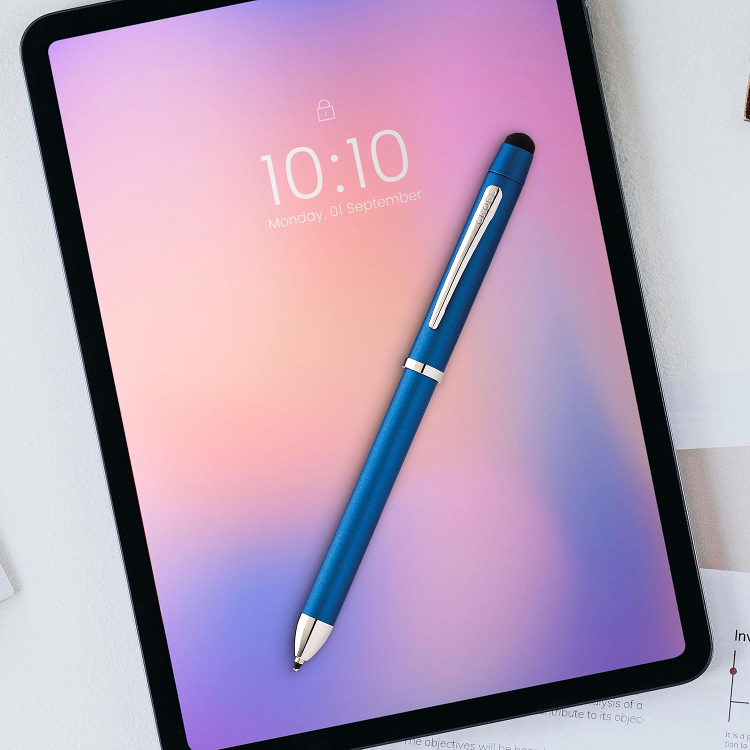 Design classico e stilizzato con tre opzioni di scrittura: penna a sfera nera, penna a sfera rossa e matita meccanica Il tappo svitatore nasconde una pratica gomma per la matita meccanica Meccanismo di azione di rotazione Compatibile con la maggior parte dei dispositivi touchscreen