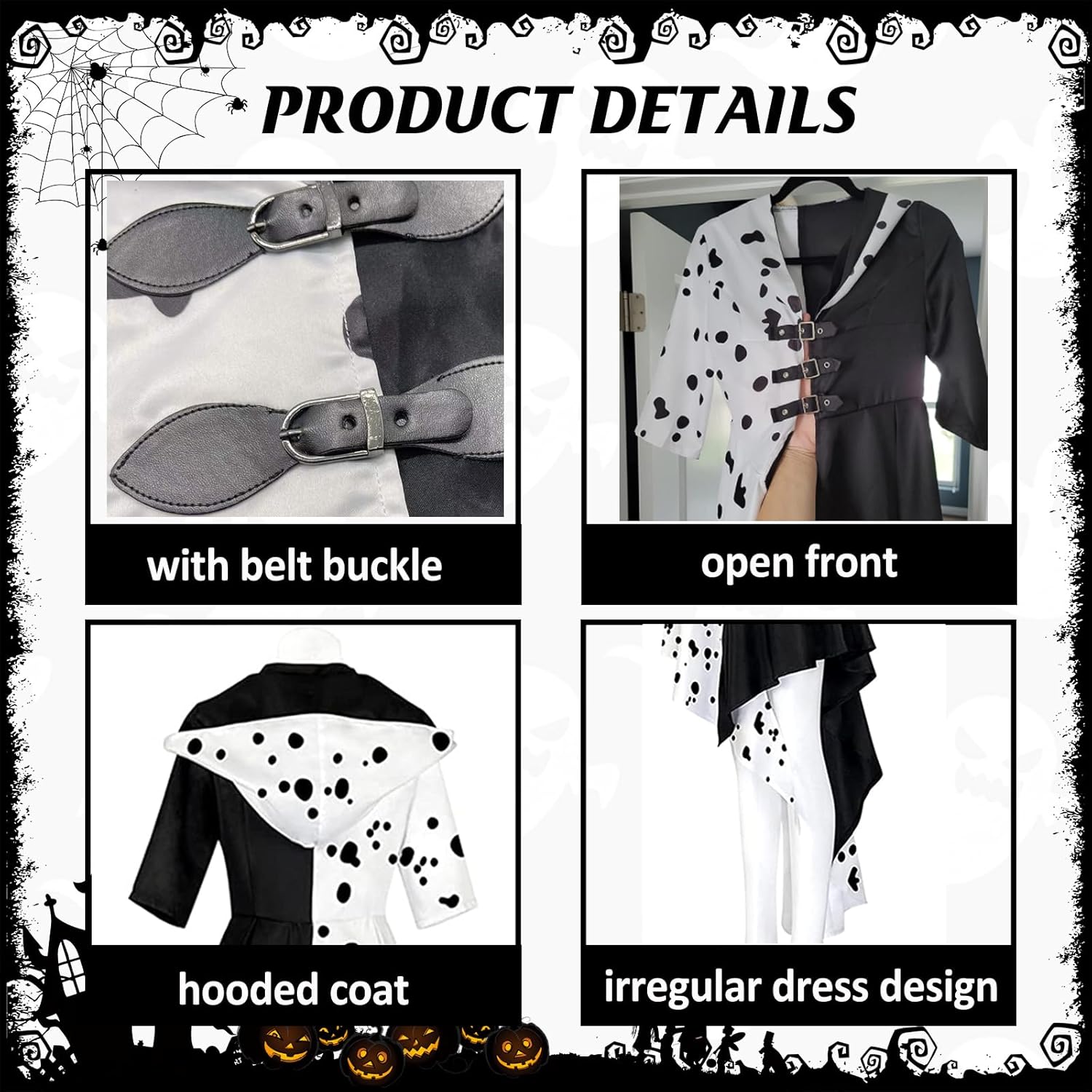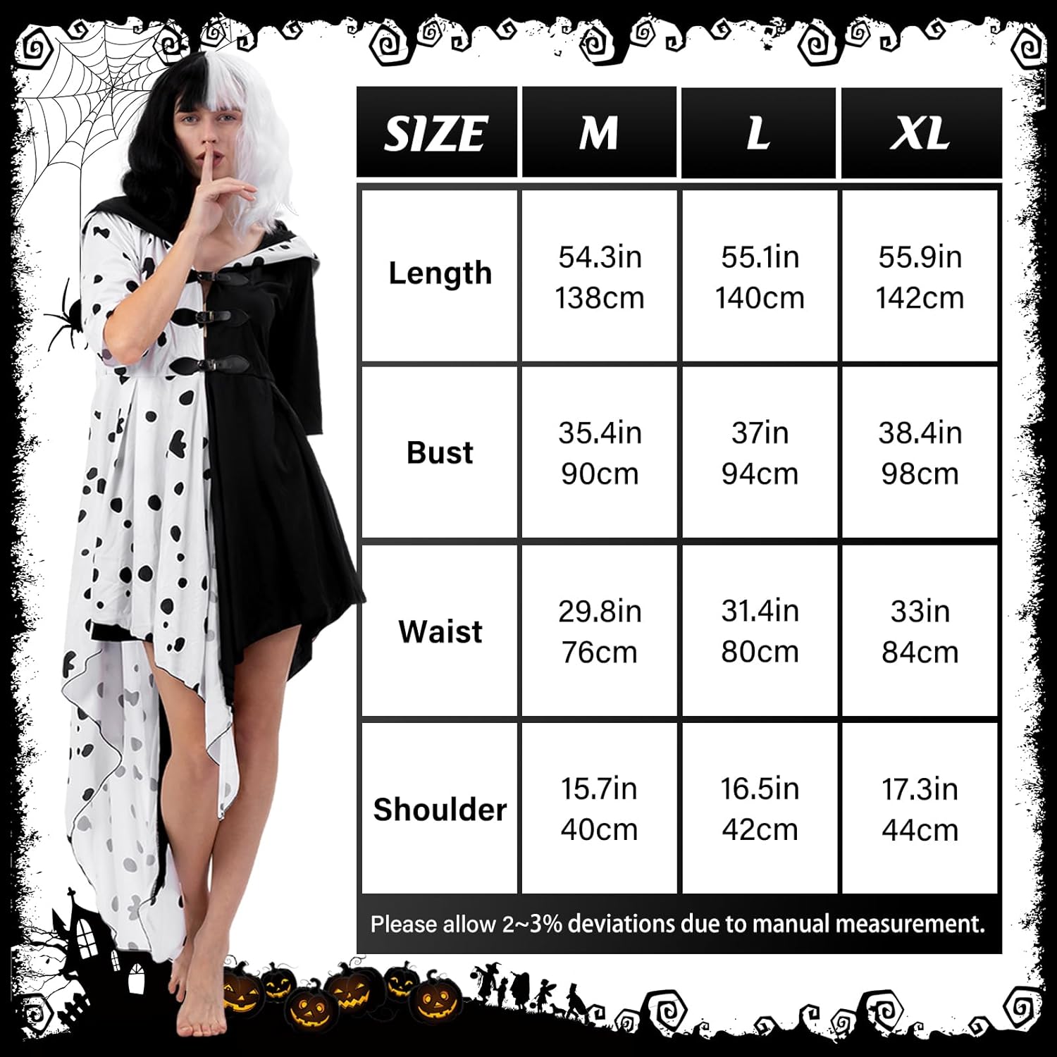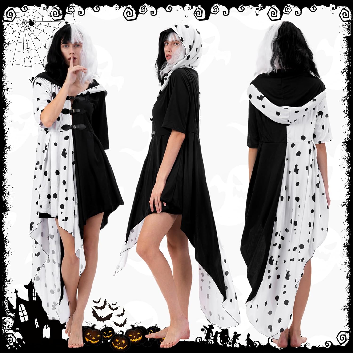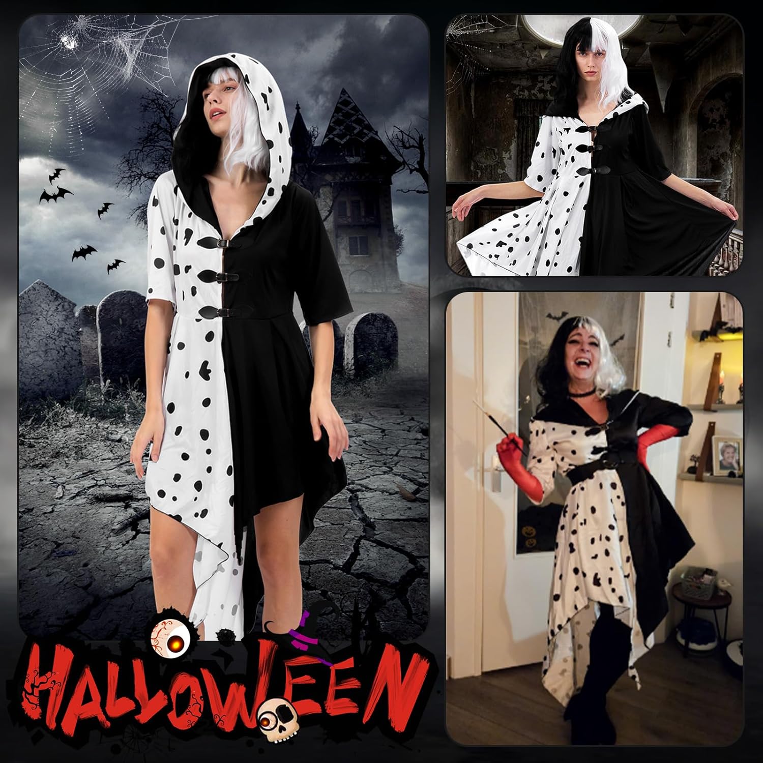 Cruella Devil Costume Donna: Anime Cosplay per Cruella Deville Adulti Abito, Cappotto con Cappuccio in Stile Abito, Cardigan Vestito Evil Madame per Halloween Carnevale Festa Mardi Gras