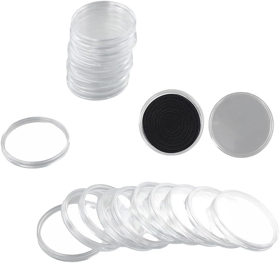 Materiale plastico ispessito: realizzate in plastica ispessita, queste scatole per capsule per monete sono di lunga durata e offrono un uso duraturo. La struttura robusta protegge efficacemente da polvere e ossidazione. Guarnizioni regolabili: ogni capsula per monete ha un diametro interno di 46 mm e viene fornita con guarnizioni regolabili. Queste guarnizioni possono essere facilmente regolate per adattarsi a monete di dimensioni che vanno da 16 mm a 46 mm, una vestibilità sicura e aderente. Design trasparente: le capsule trasparenti per monete consentono visibilità e visualizzazione del tuo . Mostra la tua collezione di monete mantenendole al sicuro da polvere e danni. Confezione conveniente: questo set include 10 capsule per monete, ognuna dotata di guarnizioni nere. Il design compatto e portatile lo rende facile da riporre e organizzare il tuo . Compatibilità con diverse dimensioni delle monete: con le guarnizioni regolabili, queste capsule per monete sono adatte per diametri di 16 mm, 20 mm, 25 mm, 27 mm, 30 mm, 33 mm, 38 mm e 46 mm. Non sono necessarie soluzioni di archiviazione aggiuntive.