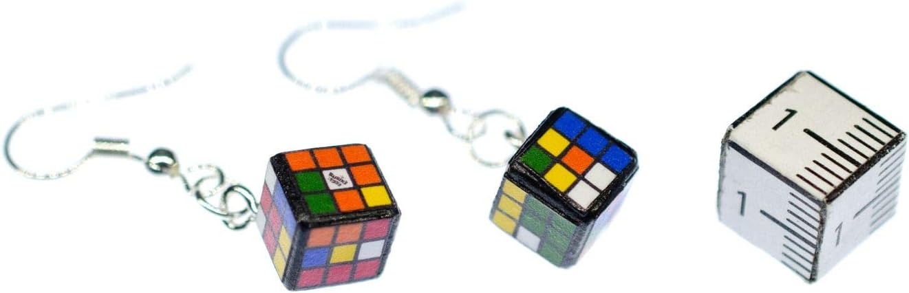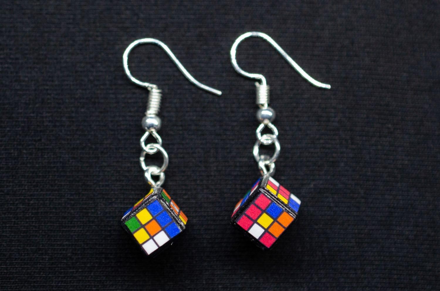 Graziosi orecchini con un piccolo cubo magico. Il cubo non può ruotare. Materiale: legno, carta. Dimensioni del modello (lato più lungo): 8 mm. Contenuto: 1 paio di orecchini
