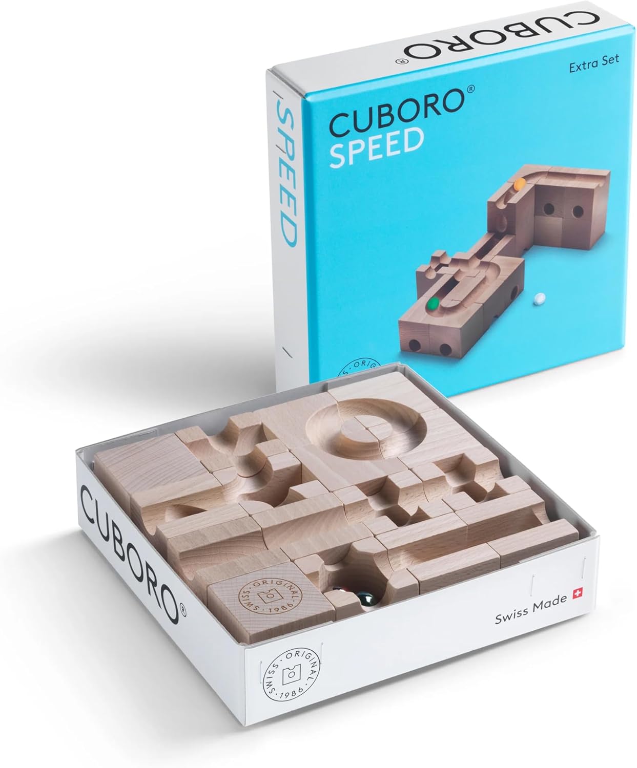 Cuboro Speed - an Extra Set for Cuboro marble runs that adds more acceleration and additional fun Expand on the Starter Sets - includes 16 track building elements and 5 marbles Speed track elements accelerate the marbles so they can cover longer distances Made in Switzerland from sustainable Swiss beech wood All Cuboro Starter and Extra sets can be combined to open up countless marble run building opportunities