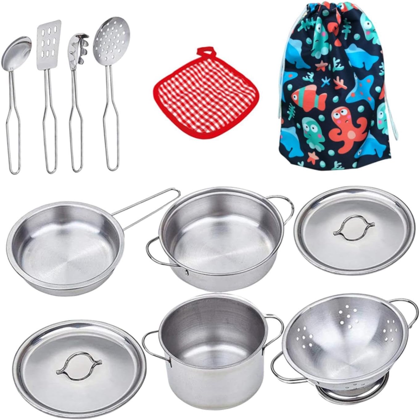 【Incoraggia il gioco di fantasia】: Il gioco di ruolo è fondamentale per lo sviluppo dei bambini, poiché permette alla loro immaginazione di fiorire. Questi giocattoli da cucina aiutano i bambini ad assumere il ruolo di chef, insegnando loro le tecniche di cucina di base mentre preparano con gioia pasti finti per i membri della famiglia. 【Ottimo regalo】: questo set da cucina per finta è un regalo ideale per le vacanze, le feste di compleanno o il divertimento quotidiano, adatto sia per ragazzi che per ragazze 【Materiali】: Questo mini set da cucina è realizzato in acciaio inossidabile spesso, e rispettoso dell'ambiente, garantendo durata e sicurezza per il tuo bambino durante il gioco. 【Set da cucina completo】: il set include una varietà di accessori da cucina come una pentola con coperchio, una padella, una casseruola, un sottopentola e utensili essenziali come una e mestoli, tutti progettati in fantastiche dimensioni in miniatura per le manine dei più piccoli 【Set completo da 12】: il pacchetto include un set completo da 12 pezzi che include tutti strumenti necessari per miorare le avventure culinarie del tuo bambino nel suo fantasioso mondo di cucina