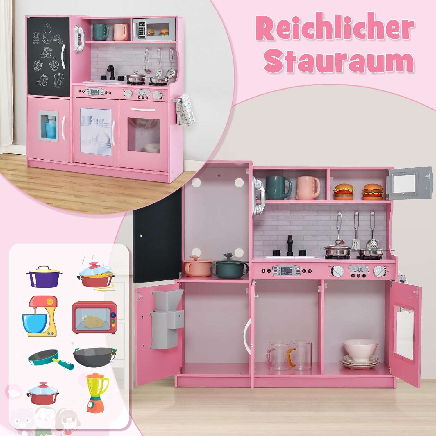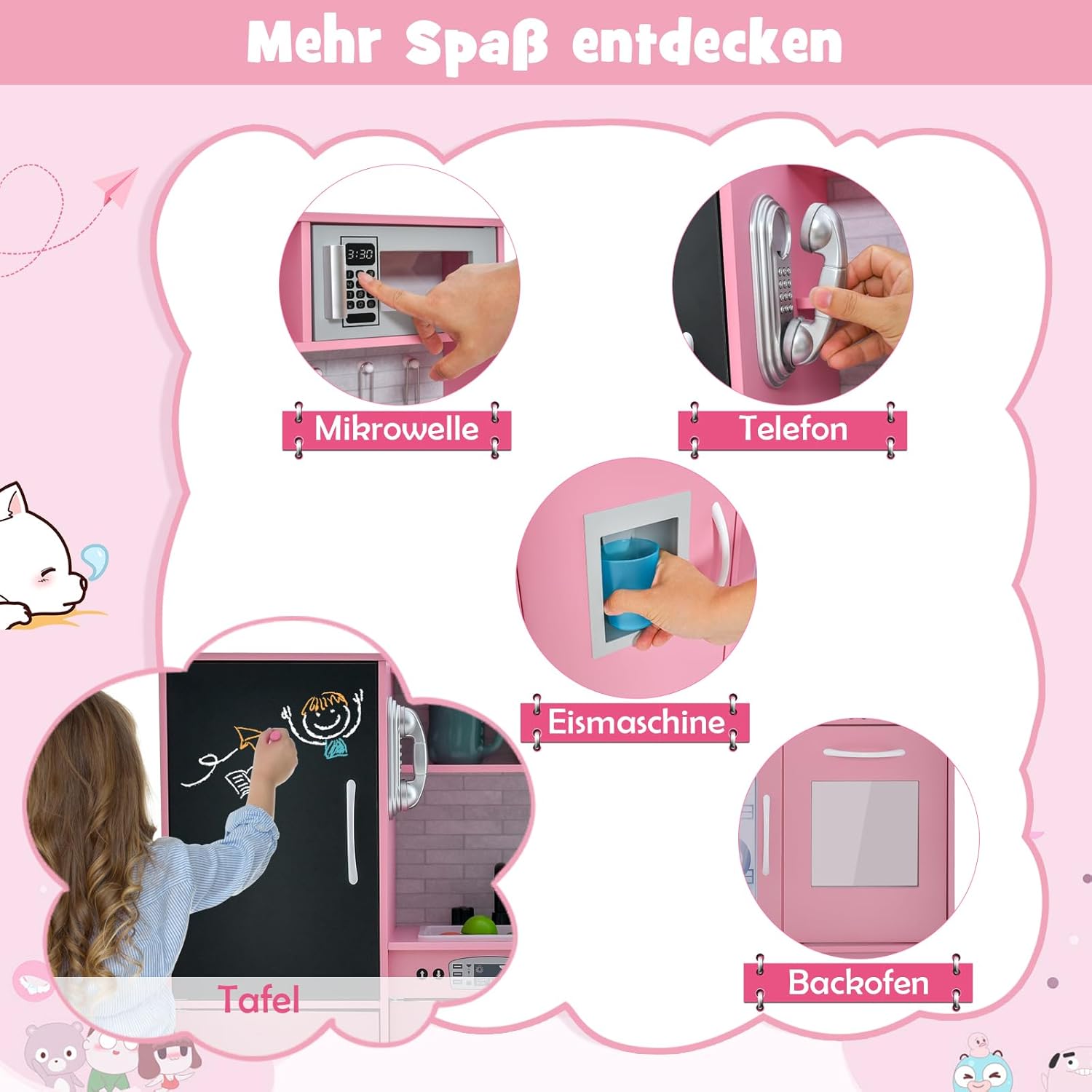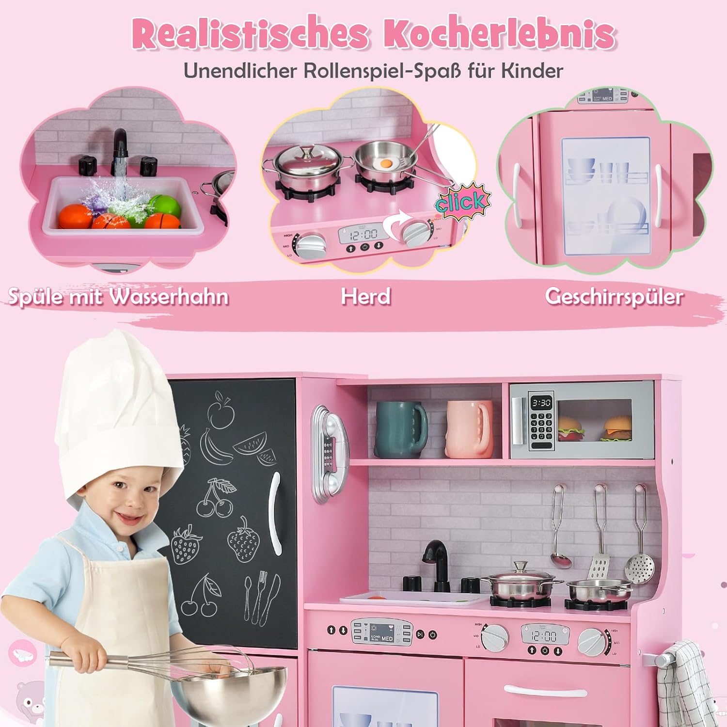 Esperienza culinaria realistica: questa cucina giocattolo presenta un design realistico con dettagli come piano cottura, lavello con rubinetto, lavastoviglie, macchina per il ghiaccio e frigorifero con lavagna, consentendo ai bambini di vivere un'esperienza culinaria coinvolgente. Accessori da cucina completi - Per un divertimento extra, sono inclusi ricchi accessori da cucina, tra cui 3 utensili da cucina e 1 pentola, 1 padella, 1 tazza e 4 cubetti di ghiaccio. Funzioni più interattive - Questa cucina per bambini è dotata di frigorifero con lavagna su cui i bambini possono scrivere il menu del giorno. E' inoltre dotato di telefono. Ciò consente ai bambini di giocare con gli amici e fingere di invitarli al telefono. Ampio spazio di archiviazione - Dotata di una varietà di armadietti, ripiani e 3 ganci, questa cucina giocattolo offre ai bambini molto spazio per riporre ordinatamente gli utensili da cucina, ecc. Sicura e durevole: la mini cucina è realizzata in materiale MDF di alta qualità ed è robusta e stabile. Per garantire al meglio la sicurezza del tuo bambino mentre gioca, gli angoli sono arrotondati ed è presente anche un dispositivo antiribaltamento sul retro.