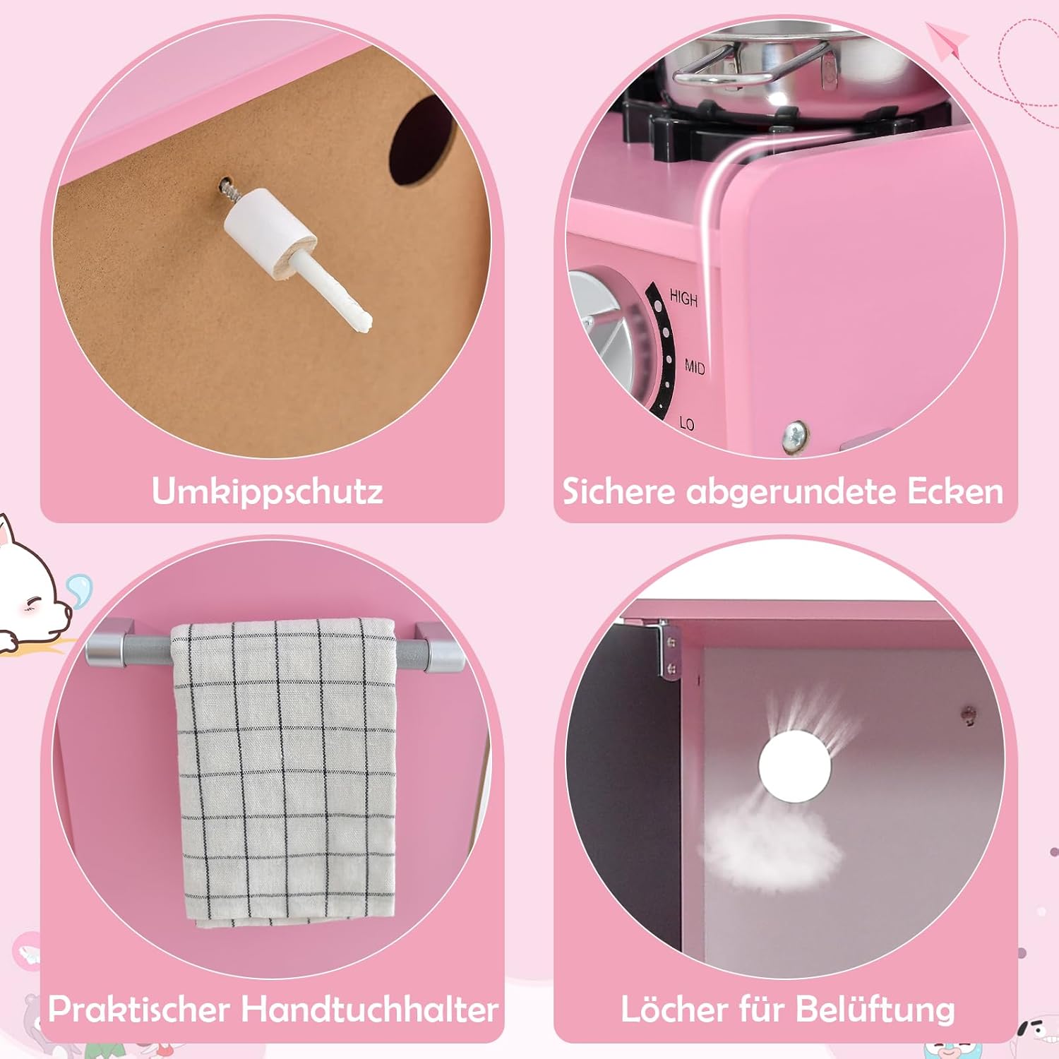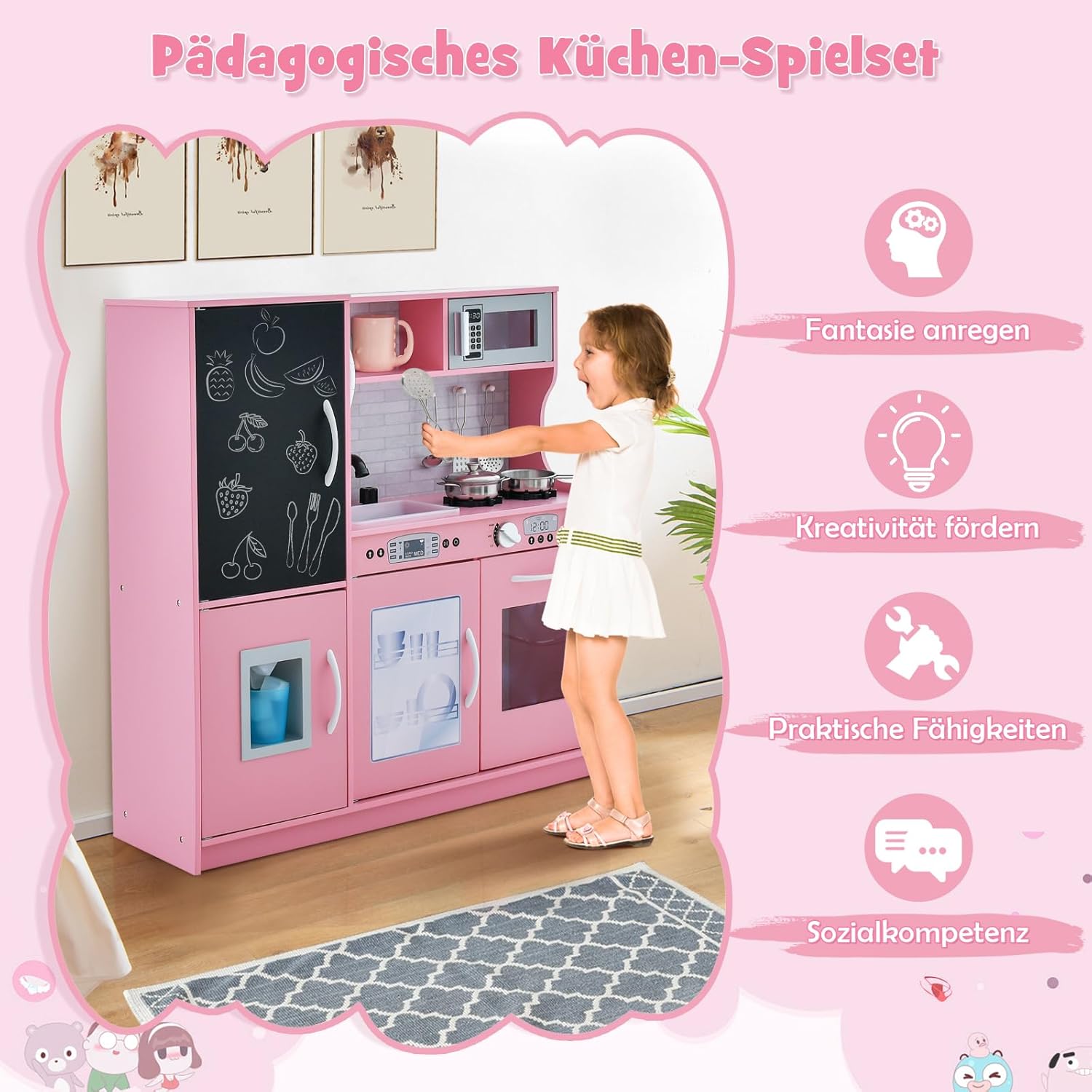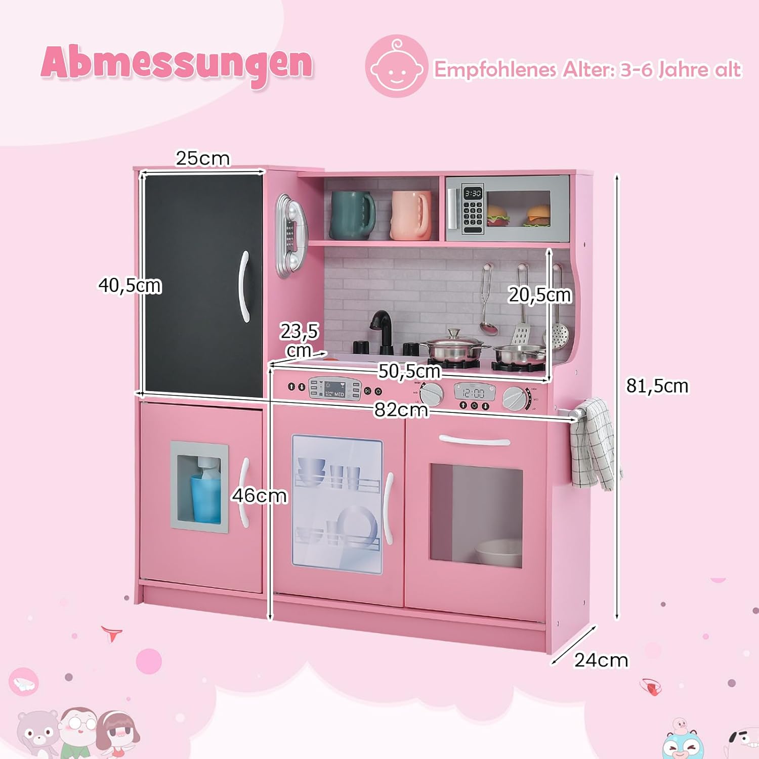 Esperienza culinaria realistica: questa cucina giocattolo presenta un design realistico con dettagli come piano cottura, lavello con rubinetto, lavastoviglie, macchina per il ghiaccio e frigorifero con lavagna, consentendo ai bambini di vivere un'esperienza culinaria coinvolgente. Accessori da cucina completi - Per un divertimento extra, sono inclusi ricchi accessori da cucina, tra cui 3 utensili da cucina e 1 pentola, 1 padella, 1 tazza e 4 cubetti di ghiaccio. Funzioni più interattive - Questa cucina per bambini è dotata di frigorifero con lavagna su cui i bambini possono scrivere il menu del giorno. E' inoltre dotato di telefono. Ciò consente ai bambini di giocare con gli amici e fingere di invitarli al telefono. Ampio spazio di archiviazione - Dotata di una varietà di armadietti, ripiani e 3 ganci, questa cucina giocattolo offre ai bambini molto spazio per riporre ordinatamente gli utensili da cucina, ecc. Sicura e durevole: la mini cucina è realizzata in materiale MDF di alta qualità ed è robusta e stabile. Per garantire al meglio la sicurezza del tuo bambino mentre gioca, gli angoli sono arrotondati ed è presente anche un dispositivo antiribaltamento sul retro.