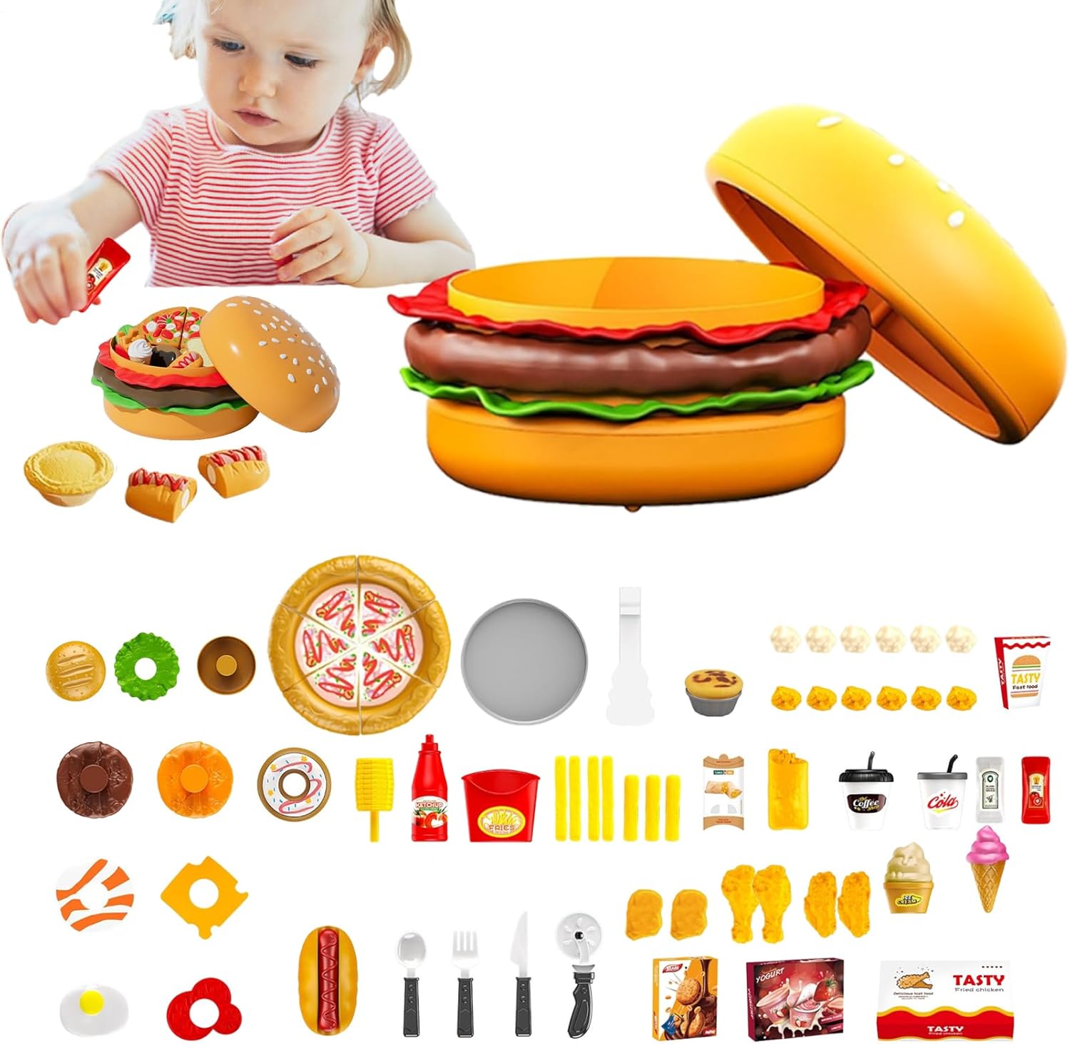 COMODO STOCCAGGIO: incoraggia le buone abitudini attraverso il gioco interattivo con gli accessori da cucina per bambini; La speciale forma ad hamburger consente una facile conservazione e favorisce le capacità organizzative dei bambini. Avventure realistiche in cucina: colori vivaci e dettagli realistici promuovono attività fantasiose, le parti di cibo incluse migliorano la scoperta giocosa. Sviluppo: migliora le capacità cognitive attraverso la promozione basata su attività del pensiero logico e il perfezionamento delle capacità motorie con set di giochi educativi in cucina. Gioco di ruolo interattivo: consente il gioco dinamico di gruppo per più persone, supporta i giochi di ruolo collaborativi per rafforzare i legami familiari e aumenta l'interazione sociale naturale nei bambini. Design stabile: la lavorazione ben studiata del cibo da gioco in ABS consente un'esperienza di gioco attiva e resistente all'abrasione da parte di giovani chef entusiasti nella loro cucina giocattolo domestica
