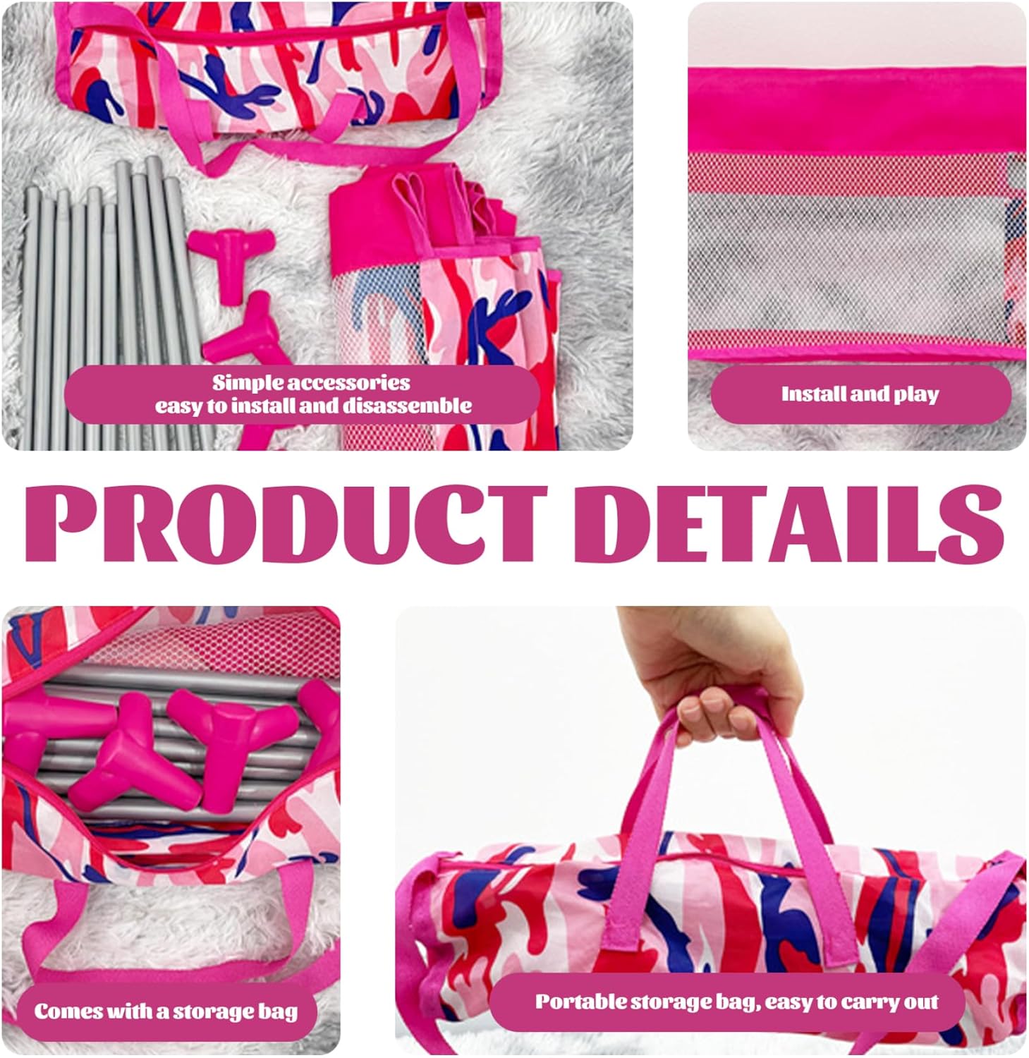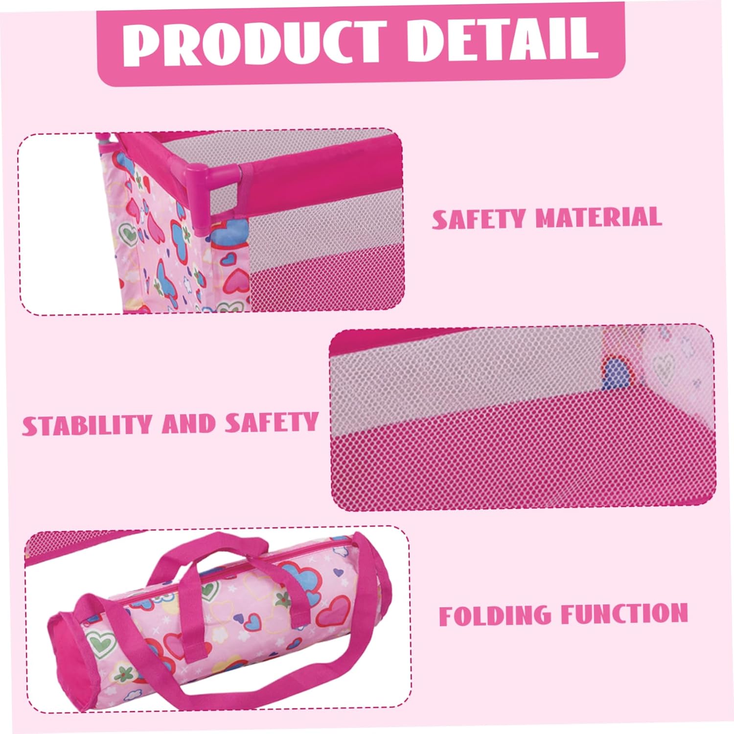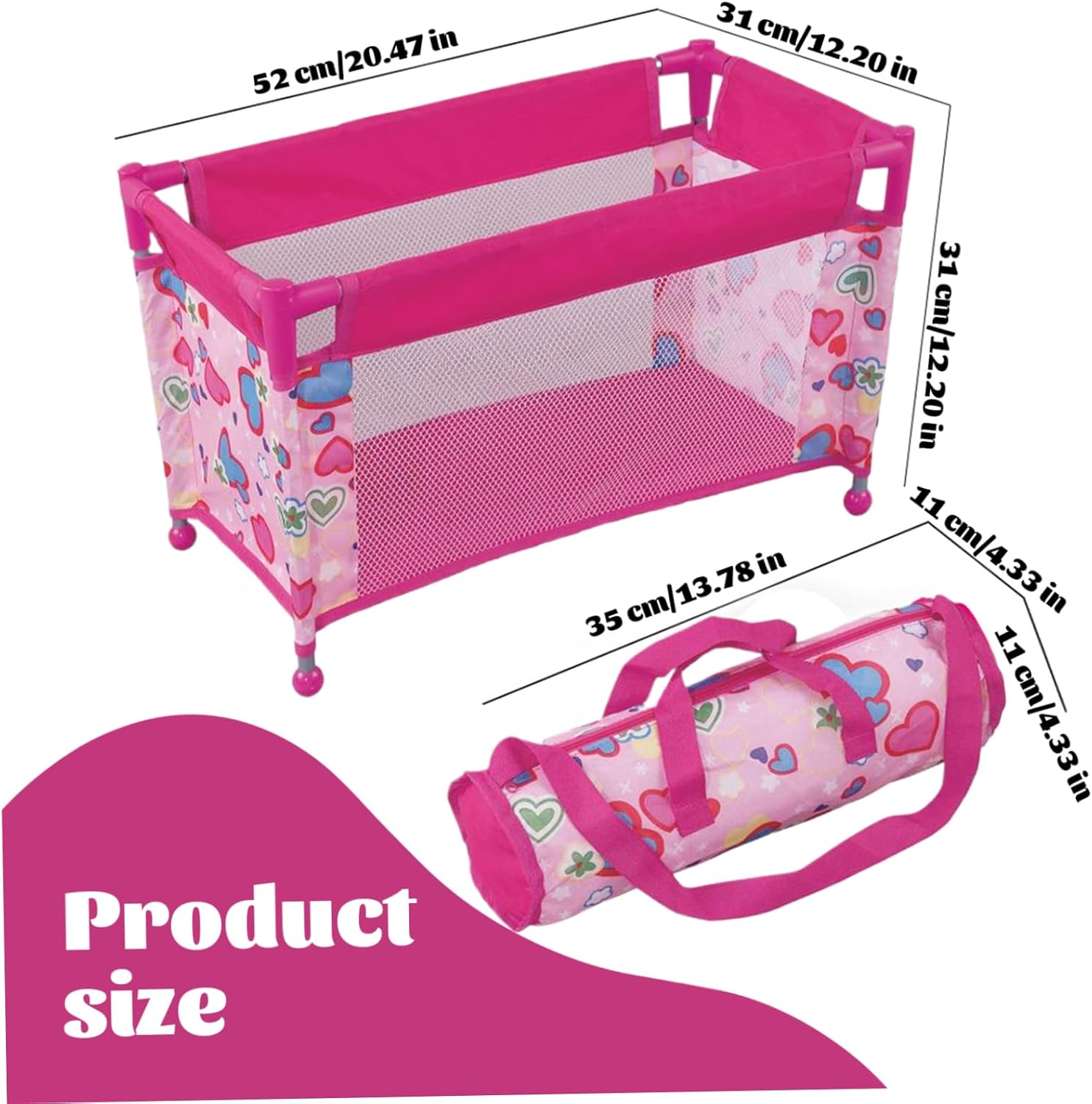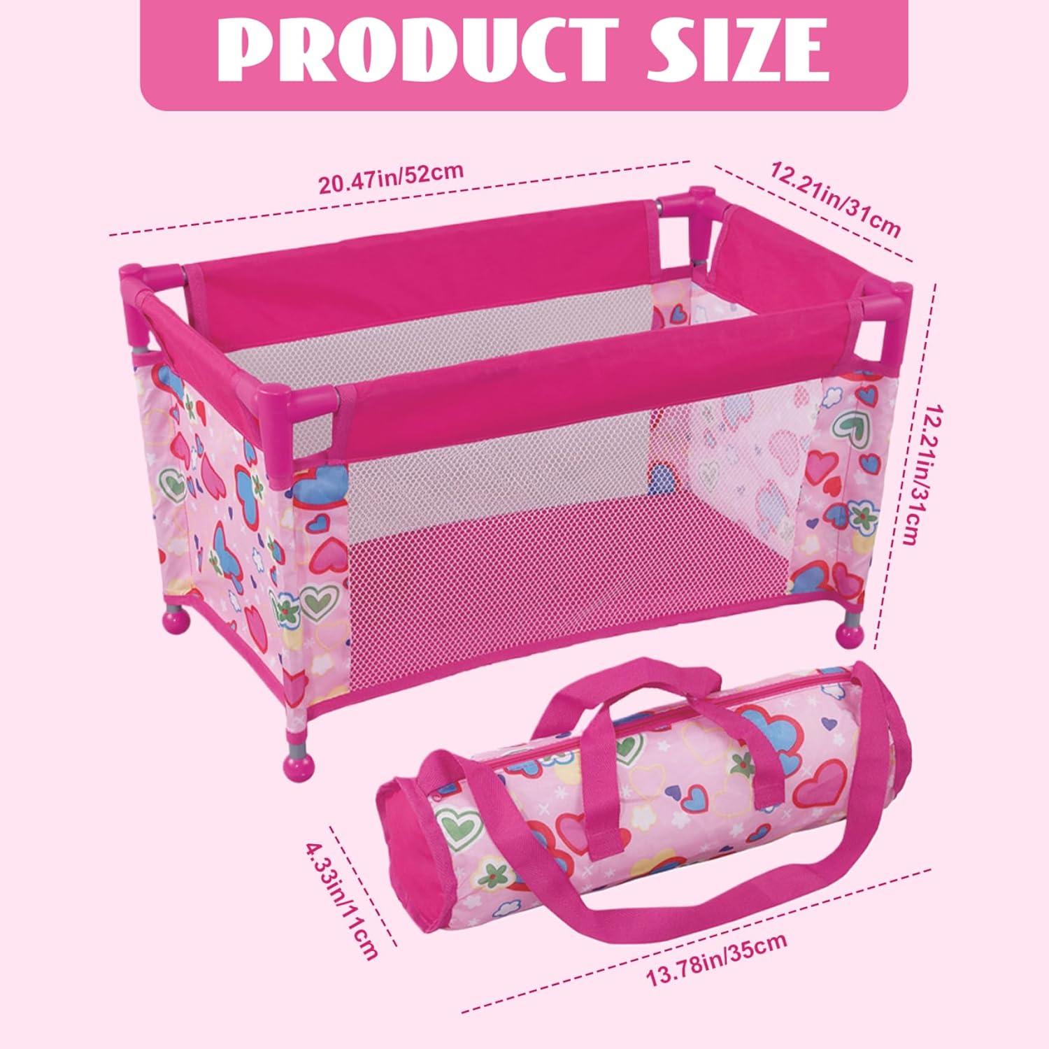 Perfetto per i bambini dai 3 anni in su: ideale per i bambini dai 3 anni in su, questo pacchetto e gioco per bambole è una scelta premurosa per compleanni, vacanze o qualsiasi occasione speciale..Aiuta a migliorare le abilità sociali, favorisce il senso di responsabilità e coltiva l'interesse per la cura del bambino mentre i bambini simulano la cura delle loro bambole. Design pieghevole e portatile: facilmente pieghevole, questa culla per bambole è perfetta per i viaggi e per essere riposta in modo compatto..Include una pratica borsa per il trasporto, così i bambini possono portare comodamente il lettino della bambola ovunque vadano o riporlo ordinatamente quando non lo usano. Incantevole motivo a cuore: decorato con un dolce motivo a cuore, questo box per bambole aggiunge un tocco di fascino a qualsiasi stanza dei giochi..Il design delizioso incoraggia il gioco educativo, rendendolo una bella aggiunta agli accessori per bambole di tuo figlio. Dimensioni perfette per bambole da 18'': questa culla per bambole è progettata per adattarsi comodamente alle bambole da 18'', con dimensioni estese di 52x31x31 cm (20,5x12,2x12,2) e una dimensione piegata di 35x11x11 cm (13,7x4,3x4,3), che la rendono ideale per coltivare il gioco e il divertimento fantasioso. Costruzione sicura e robusta: realizzato con materiali sicuri, questo lettino per bambole presenta una robusta struttura in metallo che garantisce stabilità e durata..È costruito per resistere al gioco attivo, fornendo un ambiente sicuro per le bambole del tuo bambino.