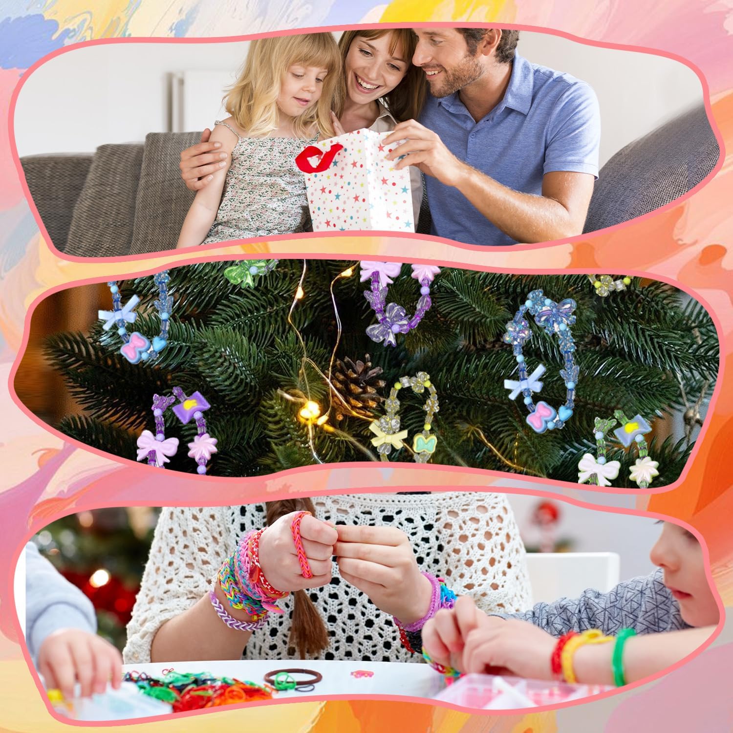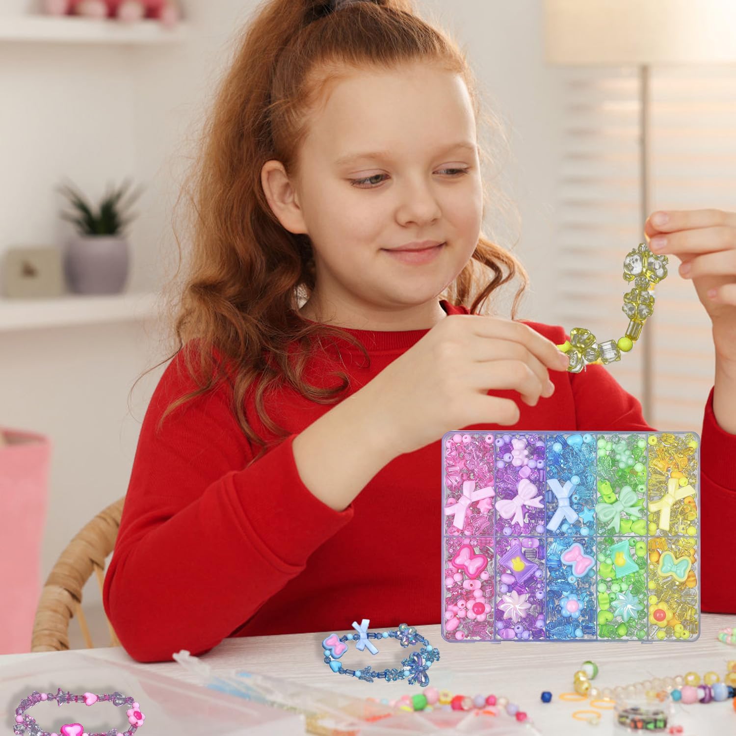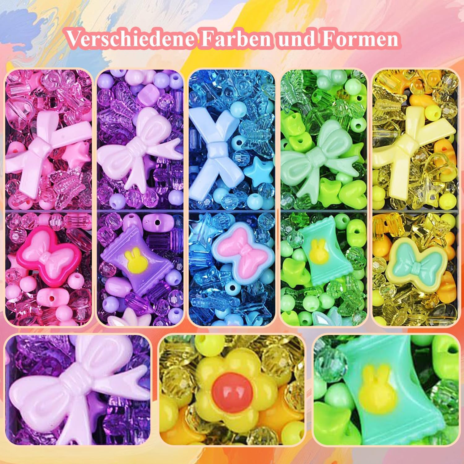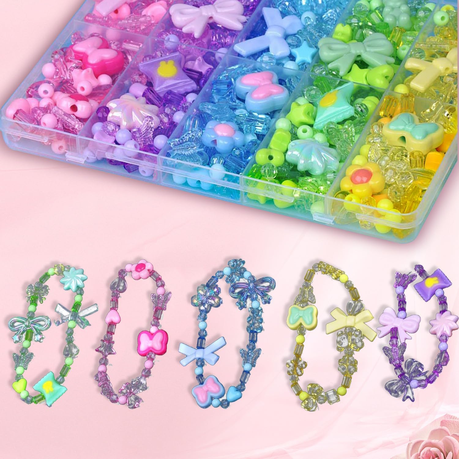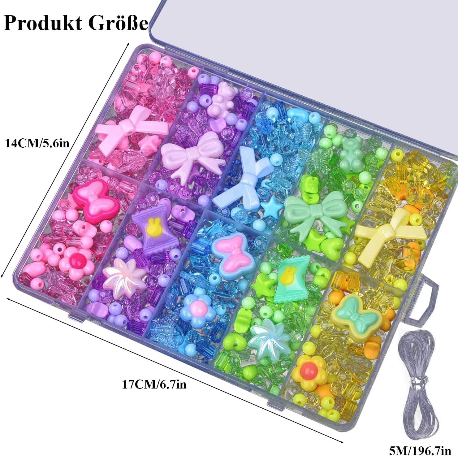 Contenuto della confezione: la confezione contiene 300-500 perline acriliche in cinque colori e 5 metri di corda di cristallo trasparente. Confezionato in una scatola trasparente da 14 x 17 cm. Le dimensioni sono squisite, e il set di perline per braccialetti per bambini può essere immediatamente smontato e utilizzato, ideale per gioielli fai da te e ragazze. Materiale del prodotto: il set di perline è realizzato in acrilico di alta qualità. La superficie della perla è liscia e non sbiadisce. Le perline da stirare hanno un colore uniforme, sono infrangibili e resistenti all'usura, sicure e non tossiche. Il set di perle per bambini è adatto a bambini dai 4 anni in su e deve essere utilizzato in modo sicuro sotto la supervisione dei genitori. Funzione del prodotto: questo set di perle è adatto per creare bracciali, collane, orecchini e portachiavi per bambini. Le perline glitterate per infilare le perline sono compatibili con lacci elastici. Migliora la coordinazione occhio-mano dei bambini e stimola la creatività del braccialetto fai da te. Diversi modelli: il set di braccialetti di perle è composto da diversi colori e forme, tra cui fiocchi, caramelle, fiori, orsi e altri stili. Il set di perline contiene accessori come corde di cristallo trasparenti. Ha scomparti separati per la conservazione. Il set di perline è facile da usare e offre perline per infilare i bambini. Versatile: il prodotto è adatto per collane fai da te per bambini, accessori per capelli e decorazioni natalizie. Il set di perle per bambini a partire dai 4 anni è la prima scelta per genitori e bambini. È adatto anche per regali fatti a mano per amici, Natale, compleanni e altre decorazioni natalizie ed è un'alternativa al set fai da te a sirena.