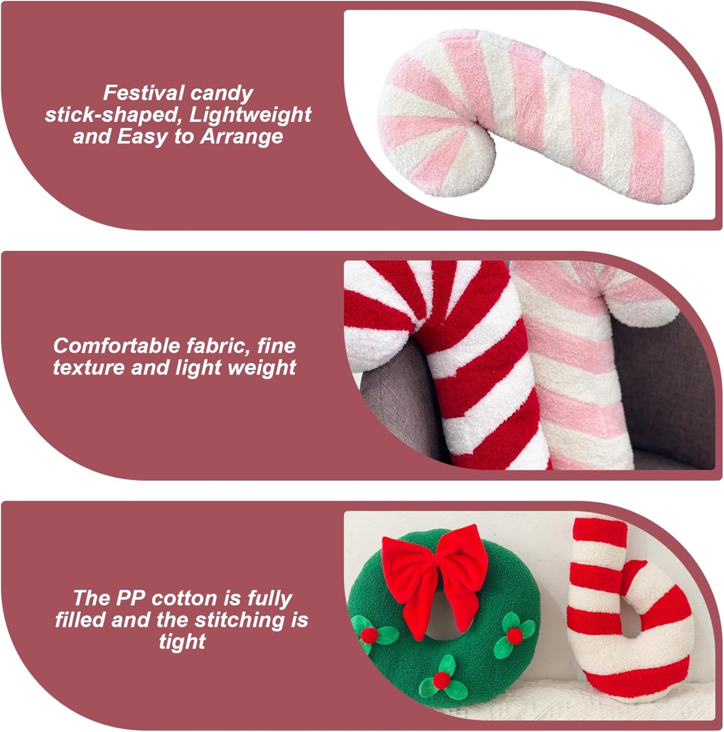 Design festivo di canna da zucchero: a forma di un classico canna da zucchero con uno stile allegro di lecca -lecca, questo peluche cuscino aggiunge istantaneamente lo spirito natalizio e il fascino a qualsiasi divano, sedia o letto. Décor in vacanza versatile: perfetto per soggiorni, camere da letto o persino uffici, questo cuscino per il lancio di Natale funge sia da pezzo decorativo che da accenti accoglienti durante la stagione festiva. Comfort morbido e lussuoso: realizzato con tessuto di peluche di alta qualità e ripieno completo, il cuscino è morbido al tatto, accogliente da abbracciare e offre comfort mentre decora il tuo spazio abitativo. Leggero e facile da organizzare: progettato per la decorazione senza sforzo, il cuscino è leggero e facile da spostare, rendendo semplice modellare lo spazio delle vacanze e cambiare i posizionamenti secondo necessità. Ottimo tocco stagionale: con il suo grazioso aspetto del bastone di caramelle e un'accogliente atmosfera da peluche, questo cuscino migliora l'atmosfera festosa, rendendolo una deliziosa aggiunta alle feste per le vacanze, alle riunioni di famiglia o alle serate tranquille a casa.