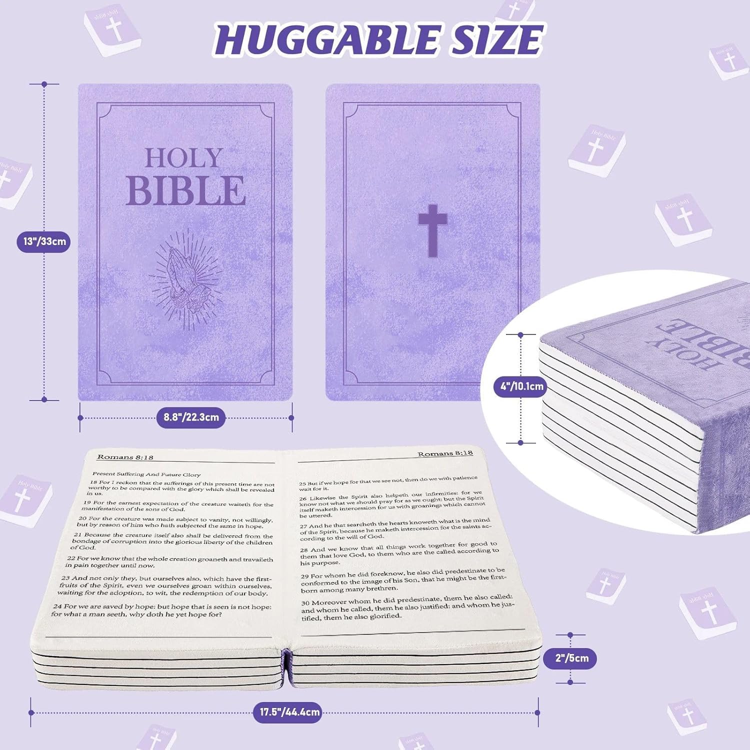 Il cuscino di peluche a forma di Bibbia Sacra unisce un design ispirato alla fede a un comfort morbido,con "Bibbie Sacre" ricamate o copertine cucite e bordi arrotondati per un compagno spirituale. Le dimensioni compatte,la portabilità,la struttura leggera e l'imbottitura in cotone PP comprimibile offrono terapie tattili antistress e simboleggiano l'insegnamento biblico di affidare le ansie a Dio. per genitori che cercano battesimi/regali di Natale significativi,insegnanti della scuola domenicale che premiano i bambini o gruppi di giovani che coltivano la fede attraverso cose tangibili e confortevoli. Porta calore spirituale alla routine della buonanotte,ai viaggi in auto,allo studio della Bibbia o come elemento decorativo sulle scrivanie dell'ufficio e sugli scaffali del soggiorno. I materiali morbidi garantiscono un abbraccio sicuro anche alle pelli sensibili,mentre le coperture rimovibili consentono una facile .