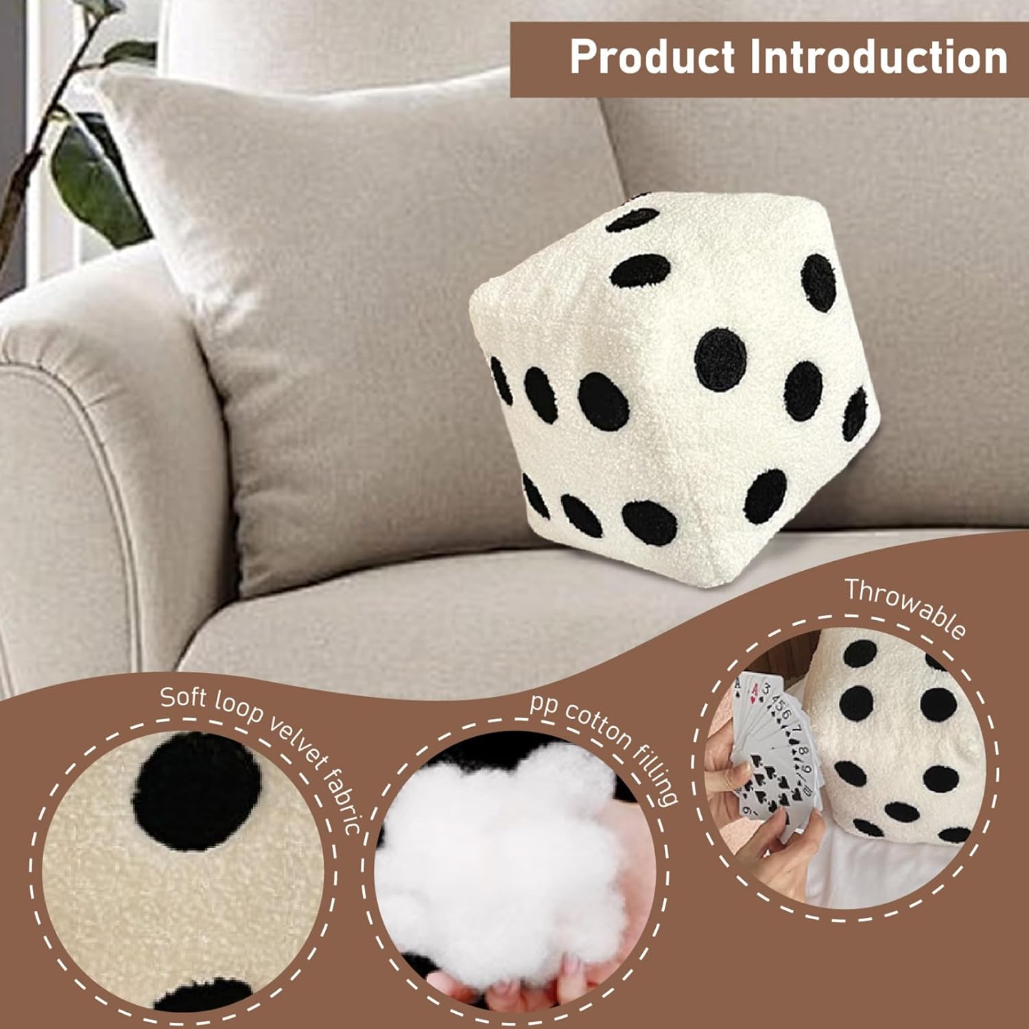 Morbido e sicuro: questo dado è realizzato in materiale morbido morbido pieno di resilienza PP Cotton, garantendo comfort e sicurezza durante il gioco..Le sue dimensioni consentono anche di essere utilizzato come cuscino. Playful & Functional: questo dadi giganti buttabili non solo funge da delizioso pezzo di arredamento, ma incoraggia anche il gioco interattivo..Un ottimo modo per alleggerire le serate di gioco o le riunioni di famiglia! Decorazioni per la casa versatili: eleva l'atmosfera della tua casa, camera da letto o caffetteria con questo cuscino creativo da dadi..I suoi colori vivaci e il design allegro lo rendono un ottimo adattamento in qualsiasi impostazione. Gigante e butta: scatena il tuo lato divertente con grandi dadi..Non solo questo cuscino gigante su di dadi è il pezzo decorativo perfetto, ma può anche essere usato come giocattolo per aggiungere un'idea di divertimento a qualsiasi spazio. Design adorabile: porta un tocco di capriccioso nel tuo spazio con il nostro simpatico cuscino da dadi lussuosi!.Misurando 8x8 pollici, questo dado gigante è la miscela perfetta di divertimento e funzionalità, rendendolo un pezzo di arredamento accattivante.