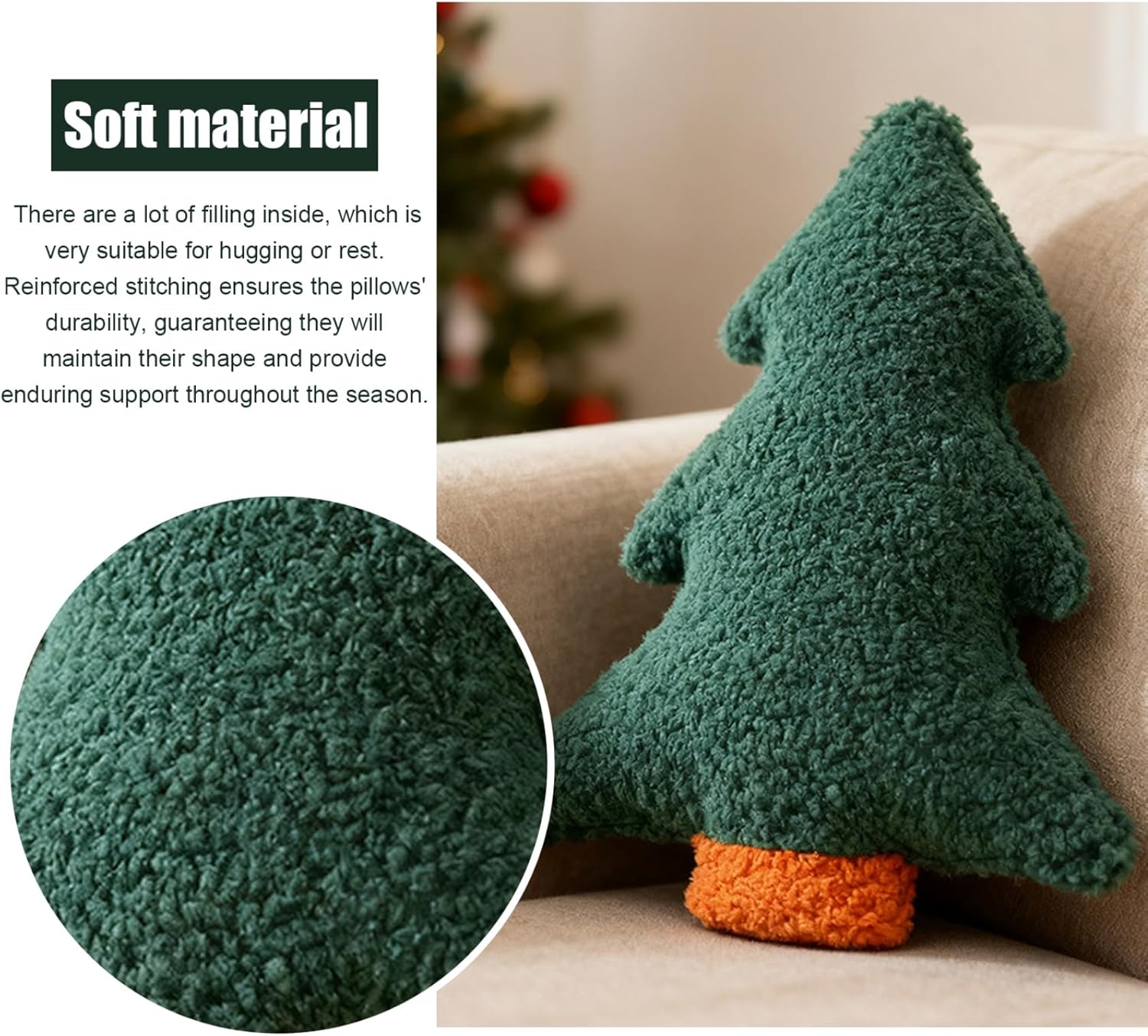 Affidabile e di facile manutenzione: progettato per un uso duraturo durante le vacanze, questo cuscino imbottito per albero mantiene la sua forma e morbidezza ed è facile da pulire, garantendo praticità e durata Decorazione stagionale versatile: ideale per l'arredamento della camera da letto natalizia e per l'arredamento invernale in generale, questo cuscino decorativo natalizio fonde perfettamente con vari stili per illuminare i tuoi spazi abitativi stagionali Idea regalo perfetta: combinando lo spirito festivo e il comfort quotidiano, questo oggetto decorativo con cuscini natalizi è un regalo premuroso e affascinante per amici e parenti durante le festività natalizie Morbido comfort di peluche: realizzato con materiali di peluche di alta qualità, questo cuscino natalizio offre un'atmosfera accogliente e invitante che abbina a divani, letti o sedie fornendo allo stesso tempo un supporto delicato Fascino festivo: questo morbido cuscino per albero di Natale a forma di albero aggiunge un tocco gioioso e festoso a qualsiasi casa, camera da letto o soggiorno, migliorando il tuo arredamento natalizio con vivaci tonalità verdi e lussuoso comfort