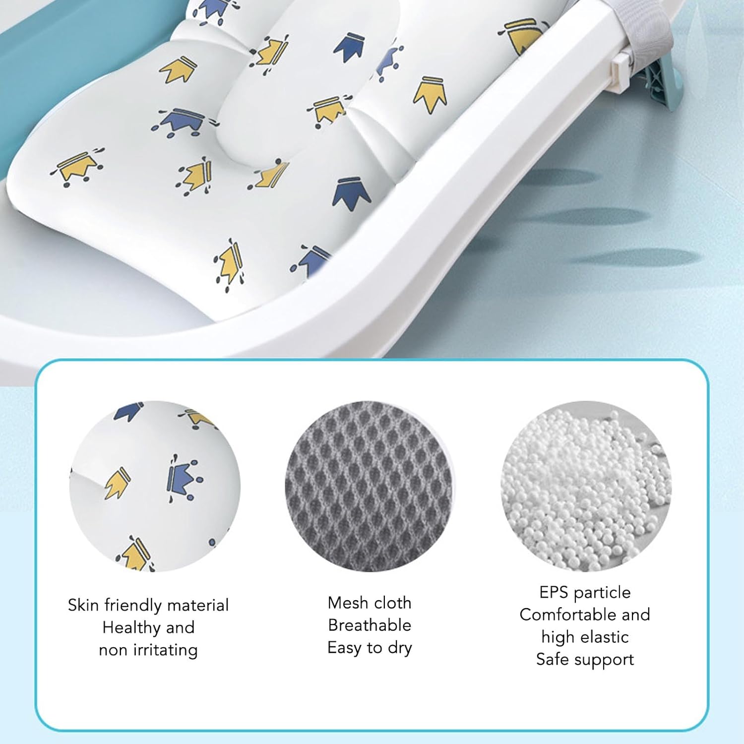 [Supporto sicuro per la testa e il collo] Il cuscino a cuneo ergonomico eleva la testa del bambino per evitare l'ingresso dell'acqua fornendo ammortizzazione a tutto il corpo per i neonati. Il design sagomato garantisce un posizionamento stabile durante il bagno con strati di tessuto traspirante. [Tessuto di sicurezza a triplo strato] La costruzione a tre strati combina tessuto morbido per la pelle, riempimento EPS per galleggiamento e ventilazione a rete 3D per proteggere la pelle delicata mantenendo l'integrità strutturale. [Fissazione del cinturino regolabile] dotato di tre cinturini per fibbia per attacco sicuro ai cerchi da bagno. La base non slittata garantisce un supporto stabile anche durante i movimenti attivi, soddisfacendo gli standard di sicurezza per i bambini 0-12 mesi. [Fit vasca universale] Cuscino galleggiante leggero si adatta a vari vasche per bambini di plastica con dimensioni di dimensioni ottimizzate. La curvatura ergonomica abbina la postura del bambino naturale per un miglioramento del comfort durante il bagno. [Lavabile in lavatrice rapida e in lavatrice] assorbe l'acqua in eccesso, quindi l'aria si asciuga rapidamente attraverso il ciclo sospeso integrato. Il materiale lavabile a macchina mantiene la forma dopo ripetuti cicli di pulizia mantenendo proprietà non tossiche.