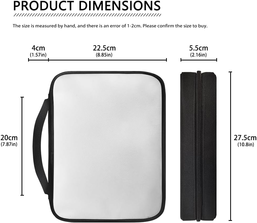 Psesaysky \u2022 Copertina Bibbia Materiale: Questa copertura biblica realizzata in materiale impermeabile e resistente all'abrasione di alta qualit . Il tessuto è leggero, morbido, confortevole e resistente, protegge la Bibbia dall'usura. Le cinghie rinforzate sulla custodia Bibbia lo rendono facile da impugnare e trasportare. Funzione: 27,4 x 22,5 x 5,5 cm. Scegli la dimensione in base alle dimensioni della Bibbia, che di solito è adatta a tutti i tipi di bibbie. Ci sono molti scomparti per penne e tasche sulla copertina della Bibbia. La borsa interna extra consente di riporre evidenziatori biblici, penne, diari di preghiera, annunci di chiesa, note di sermone, biglietti di preghiera, appunti o segnalibri. Quando si legge la Bibbia, la borsa può anche essere completamente distesa, senza la necessità di estrarre il libro può essere conveniente per voi da leggere, portarlo fuori di casa, non solo è conveniente per risparmiare tempo e facile da adorare, la disposizione chiara del deposito può anche essere efficace per evitare che le cose vengano lasciate indietro. Questa borsa può essere utilizzata come scatola della Bibbia, borsa, valigetta e può essere regalata a familiari e amici in giorni importanti come feste e compleanni. Fornire prodotti e servizi personalizzati come regali per riflettere meglio i desideri del donatore. Suggerimento: Si prega di misurare attentamente le dimensioni della Bibbia o del libro prima dell'acquisto. Questa borsa biblica è adatta per bambini e adolescenti dai 5 ai 19 anni. Si consiglia di lavare a mano, basta lavare con acqua fredda, non immergere a lungo, non candeggiare e non deve essere esposto al sole per un lungo periodo di tempo. Si prega di comprendere che potrebbero esserci alcune differenze di colore e dimensioni dovute ai diversi metodi di illuminazione e misurazione.