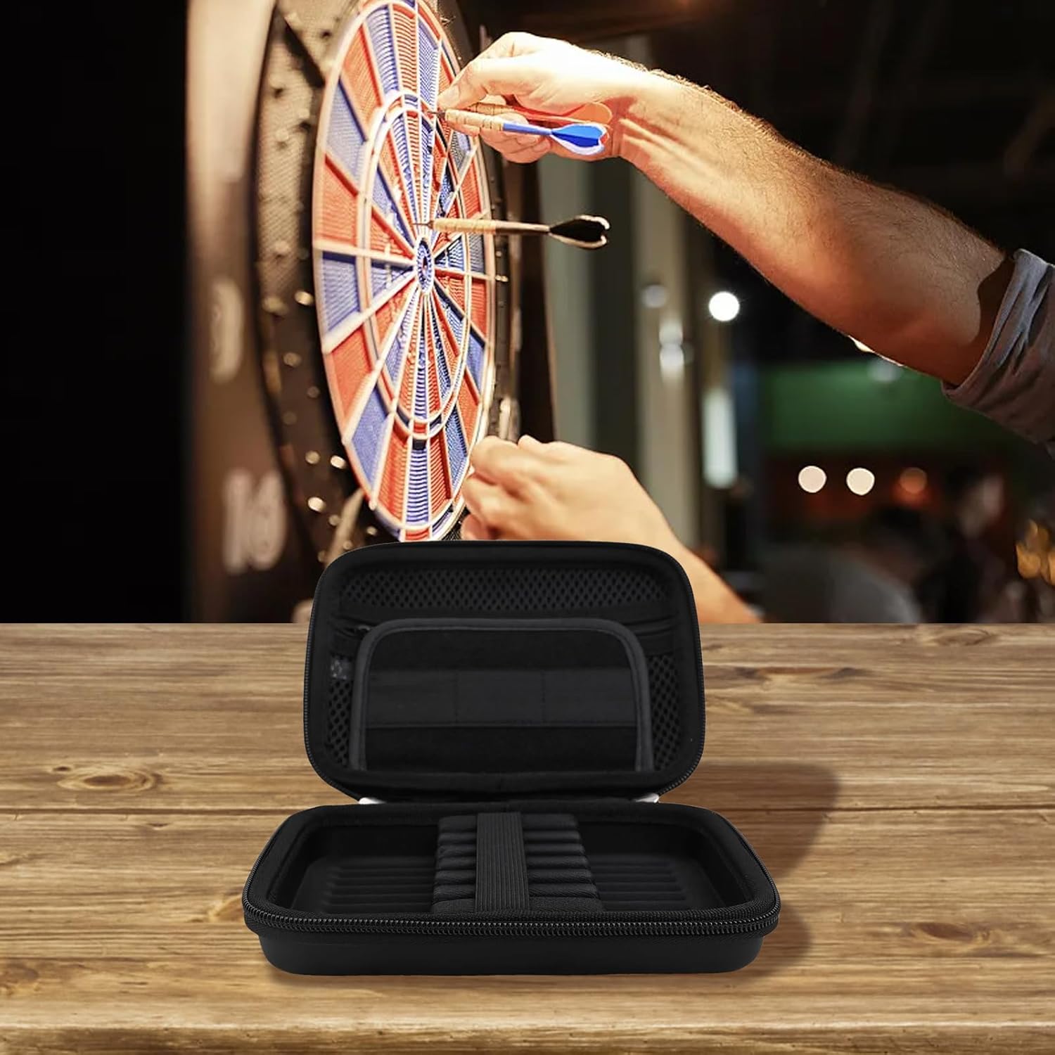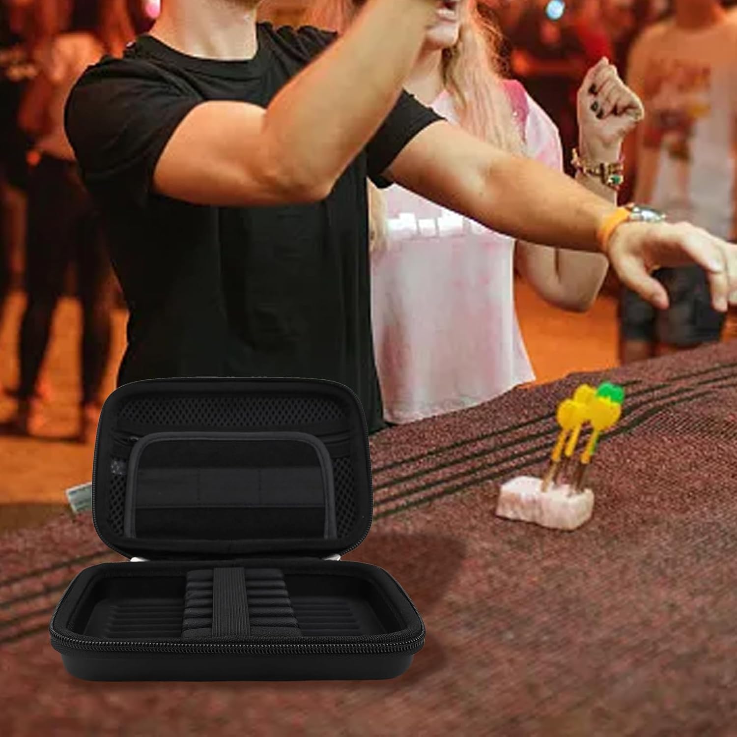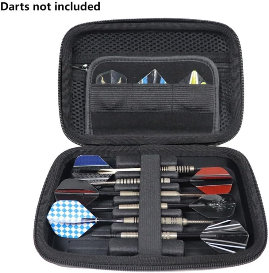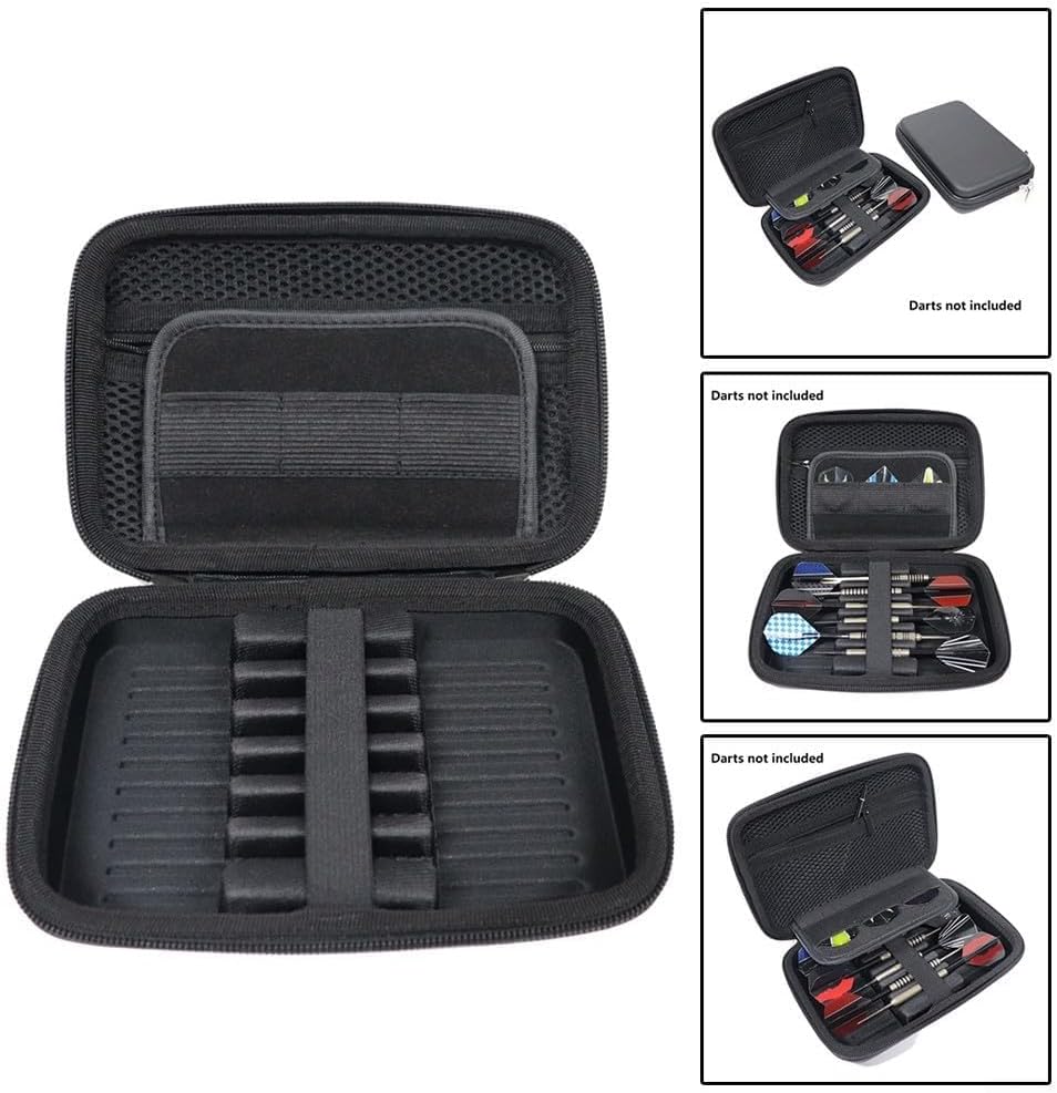 Struttura protettiva in EVA: il materiale EVA rigido con base di supporto interna offre una doppia protezione per le tue attrezzature per freccette, mantenendo tutto al sicuro durante il trasporto o lo stoccaggio. Le dimensioni compatte di 19,1 x 13 x 5 cm rendono questa custodia perfetta per i viaggi, mantenendo la completa sicurezza per la tua preziosa attrezzatura per freccette. Capacità di archiviazione completa: appositamente progettato con spazio per 6 freccette, oltre a scomparti dedicati per alberi, alette, punte e accessori. La soluzione organizzata elimina gli oggetti sciolti e assicura che tutte le tue attrezzature essenziali rimangano in una comoda posizione. Organizzazione sicura delle freccette: le alte fasce elastiche mantengono ogni freccette saldamente in posizione per prevenire il movimento durante il trasporto, mentre la robusta base in EVA fornisce una maggiore stabilità: le freccette rimangono perfettamente allineate e protette anche quando la custodia è scossa o caduta. Pratiche caratteristiche di portabilità: dotato di una comoda cinghia da polso per un facile trasporto, oltre a un manico resistente che rende il trasporto senza sforzo: il design leggero di soli 220 g aggiunge un carico minimo proteggendo l'intera collezione di freccette ovunque tu vada. Design interno intelligente: i divisori in rete consentono una rapida identificazione visiva di piccoli accessori, rendendo più veloce la preparazione del torneo. La finitura professionale nera mantiene un aspetto elegante, mentre l'interno da 17 x 11 x 4,2 cm ospita in modo efficiente punta in acciaio, punta morbida e freccette in plastica della maggior parte dei produttori.