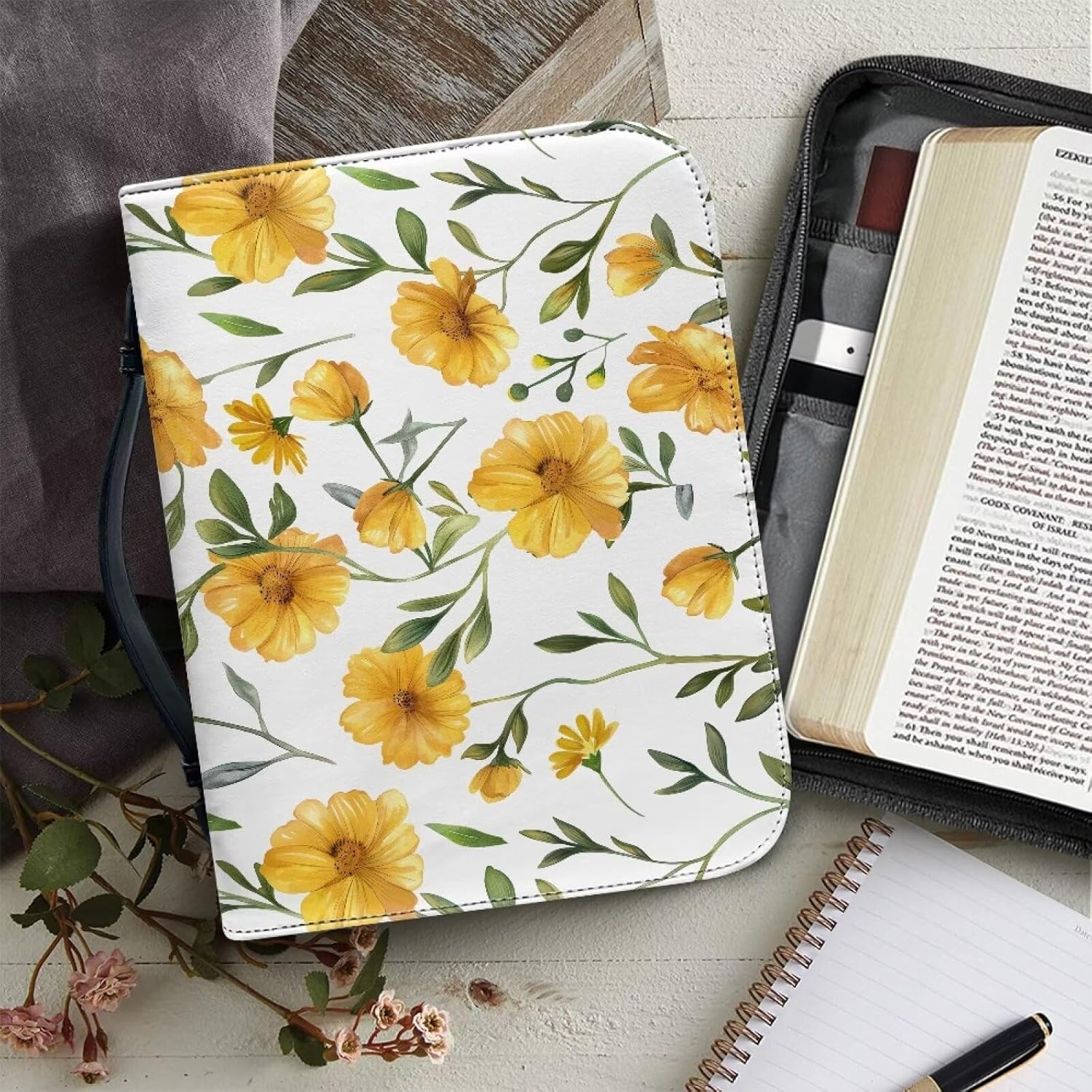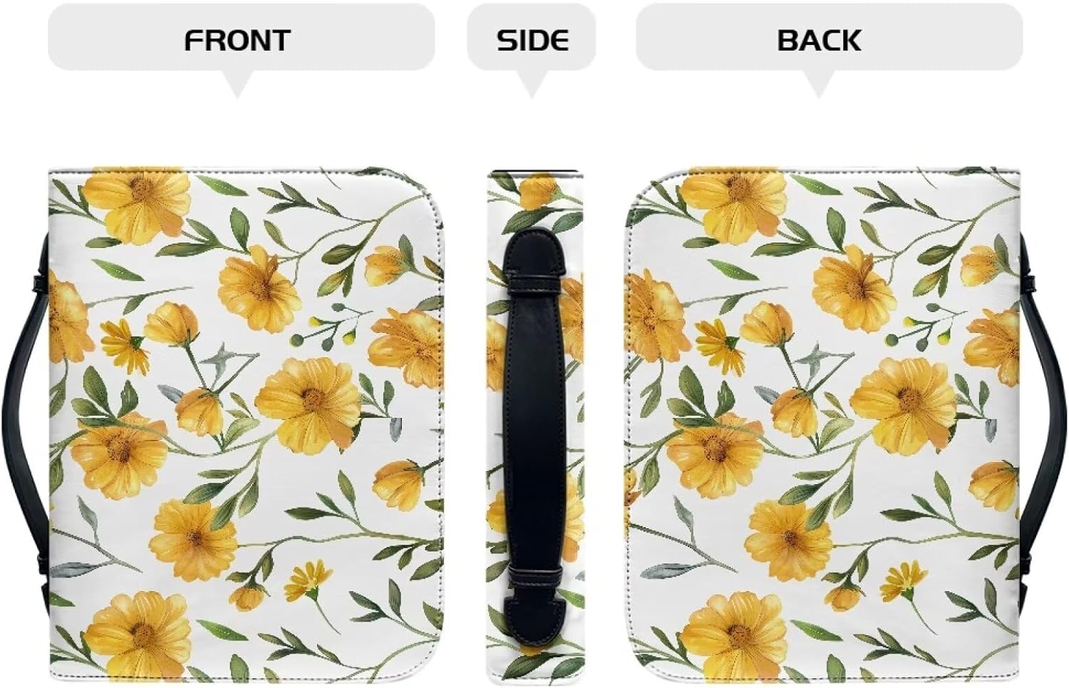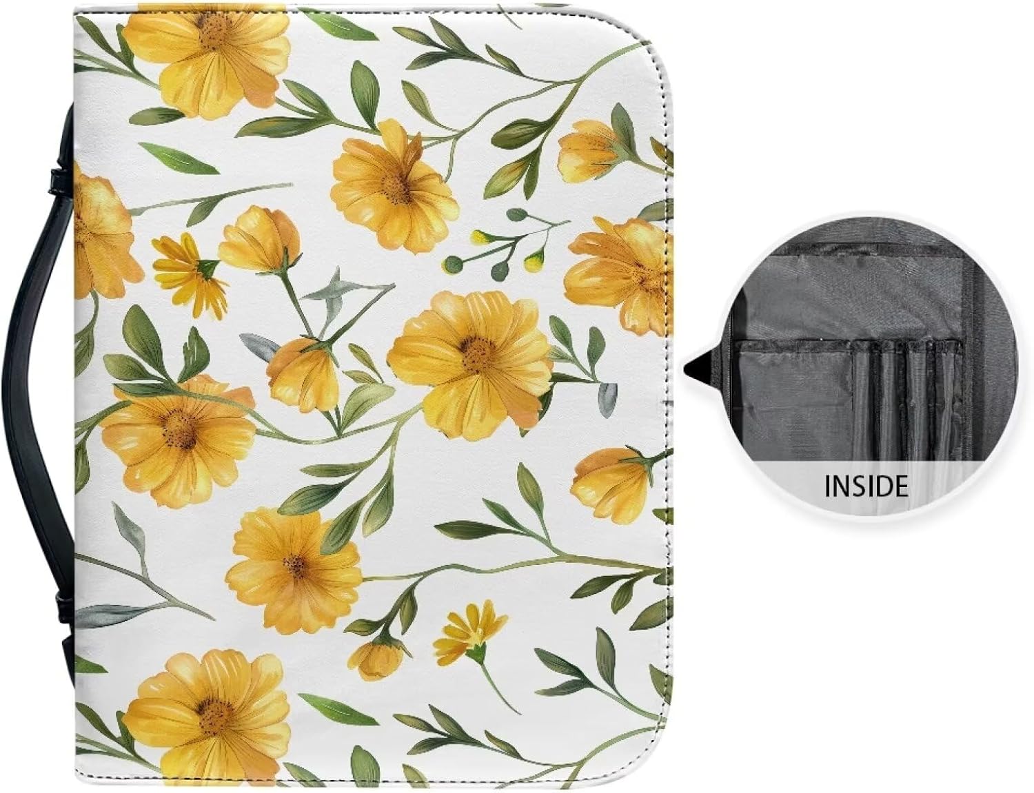Custodia per libri con motivo floreale giallo, grande, con manico e cerniera, con scomparti per penne e tasca, regalo per donne e donne